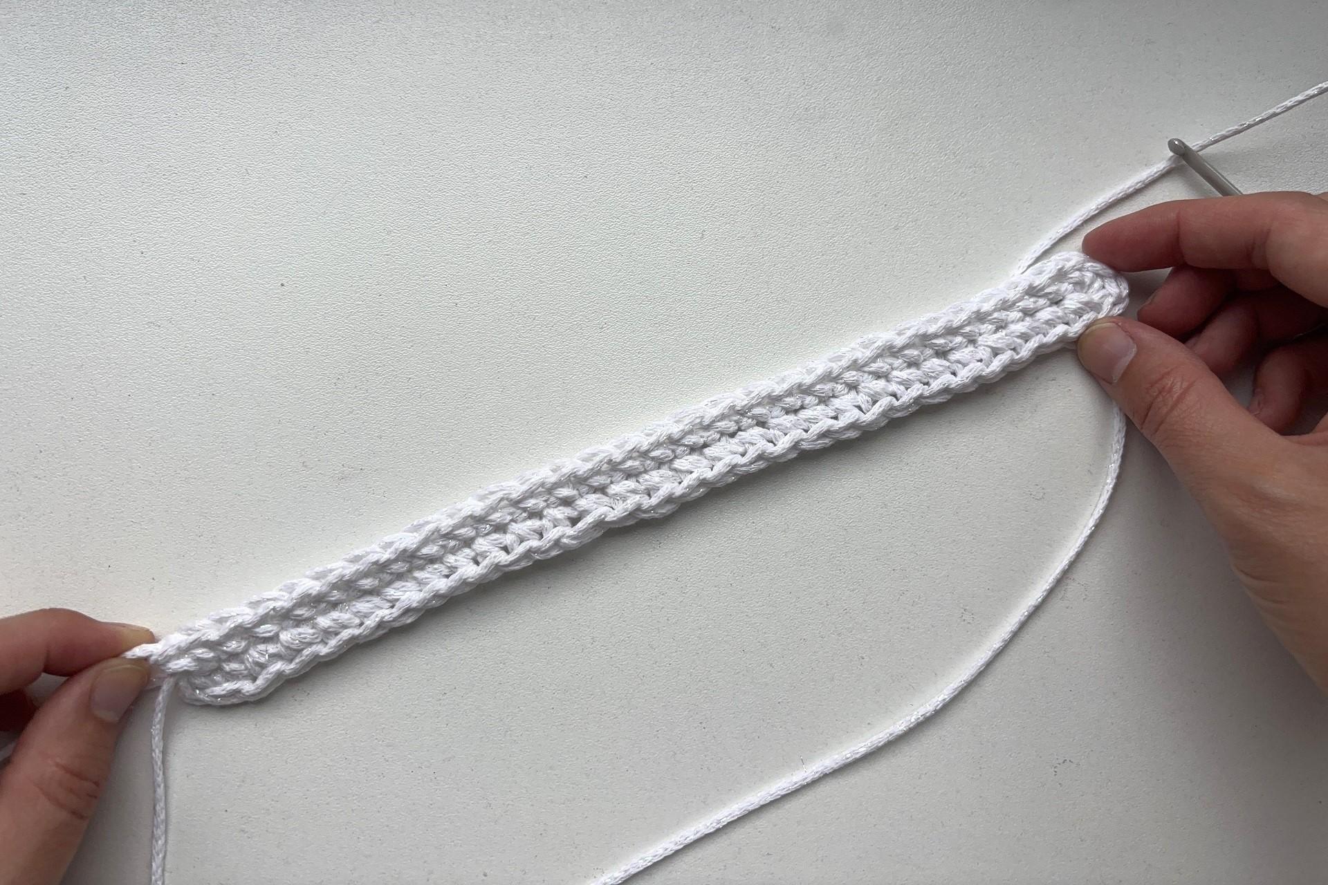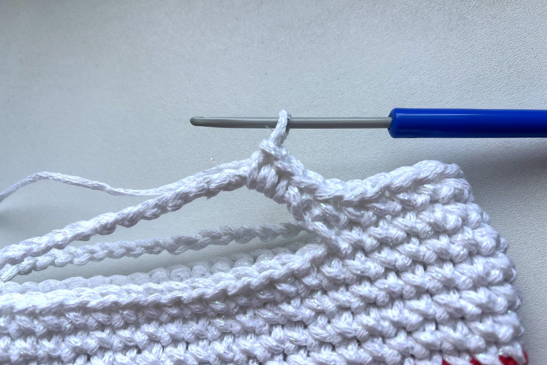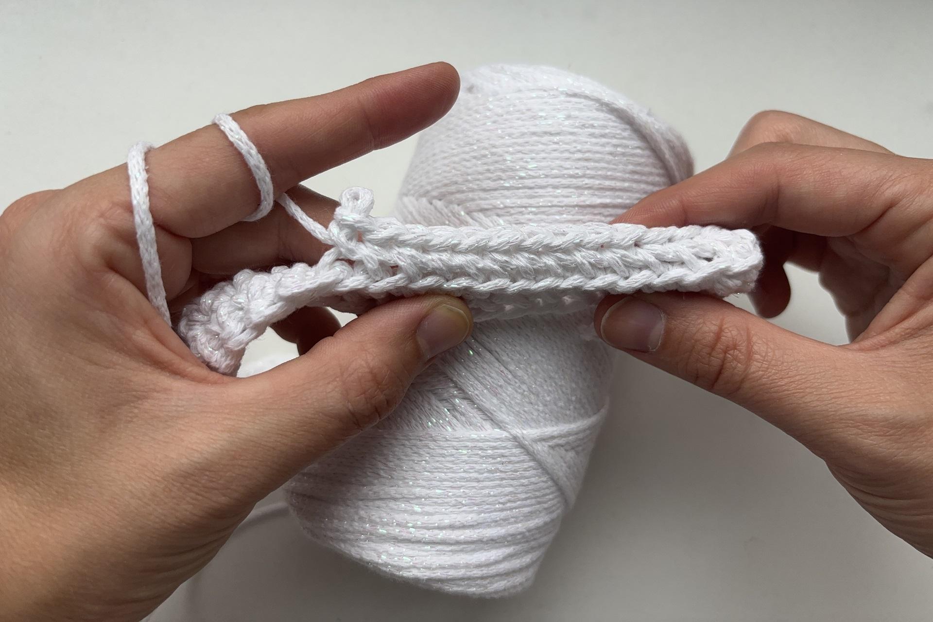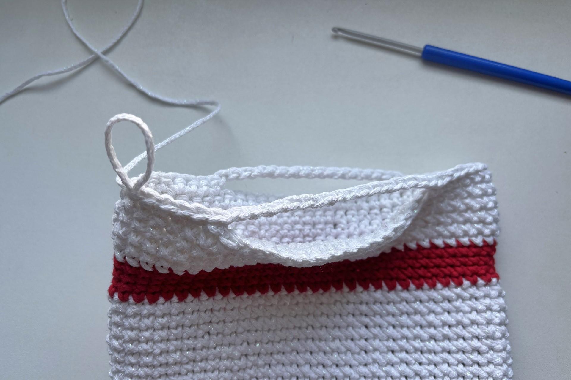 8. V tejto rade háčkujeme uši na taške. Uháčkujeme 16RO, preskočíme 16 očiek a pichneme do 17. očka. Rovnako urobíme aj druhé ucho.