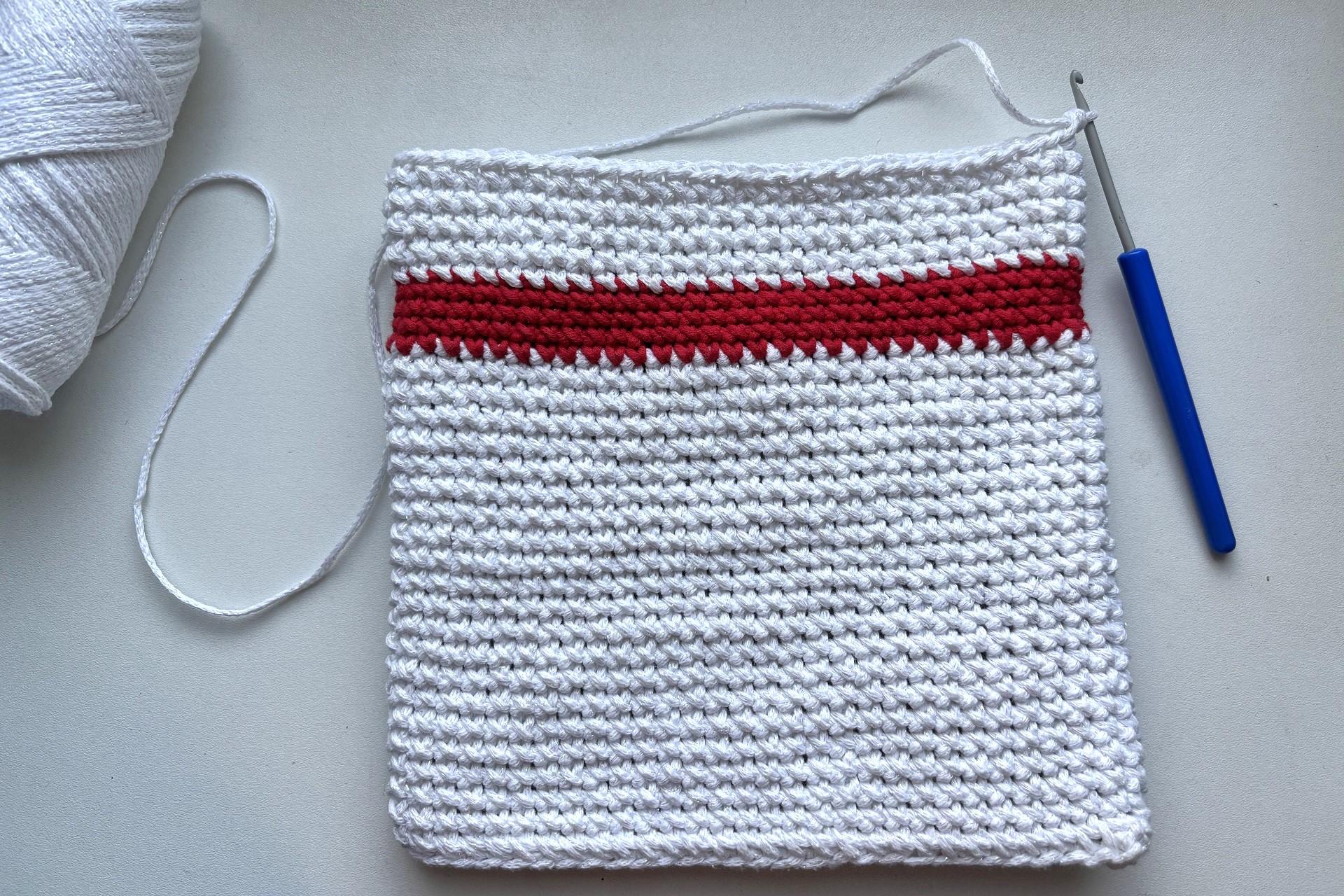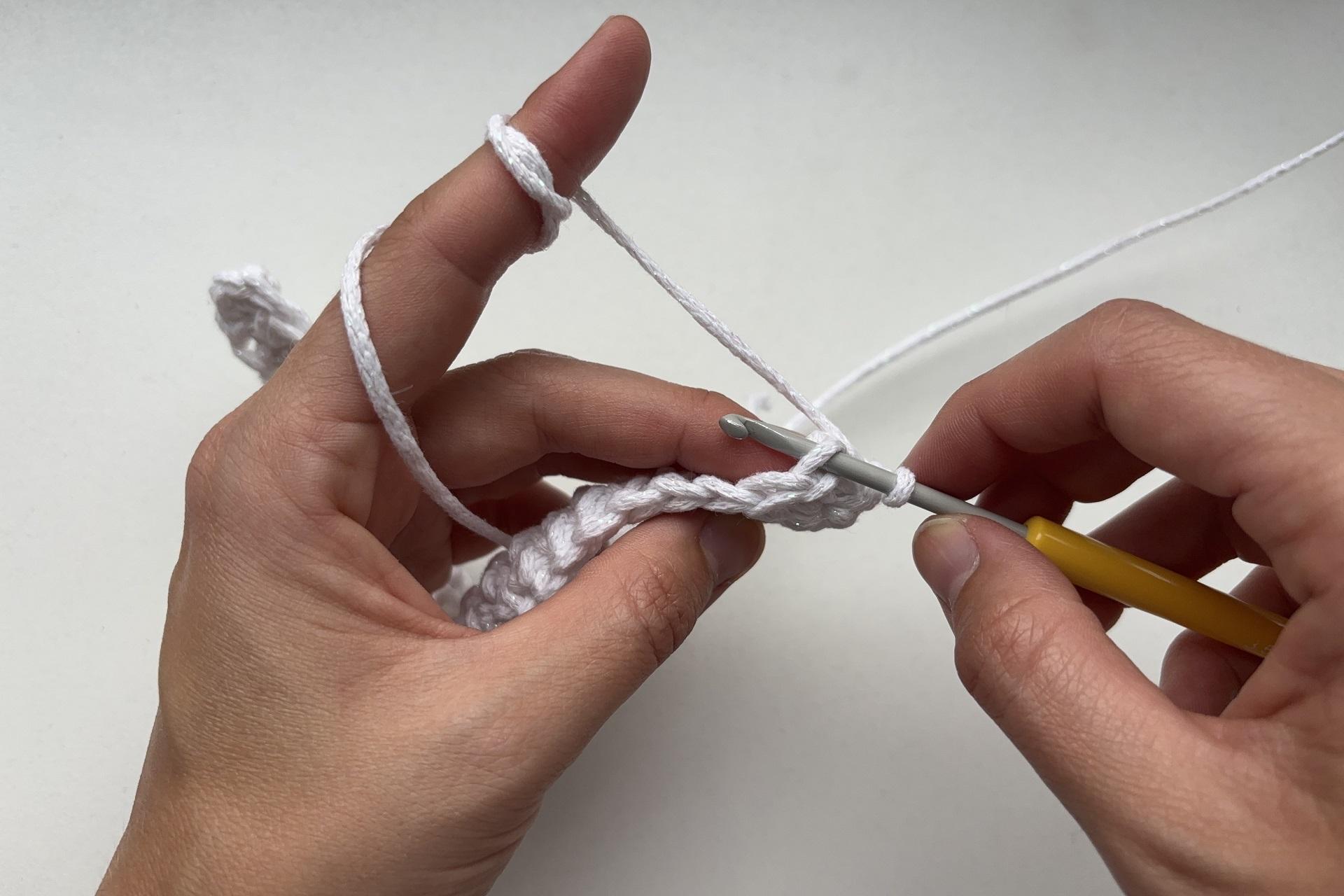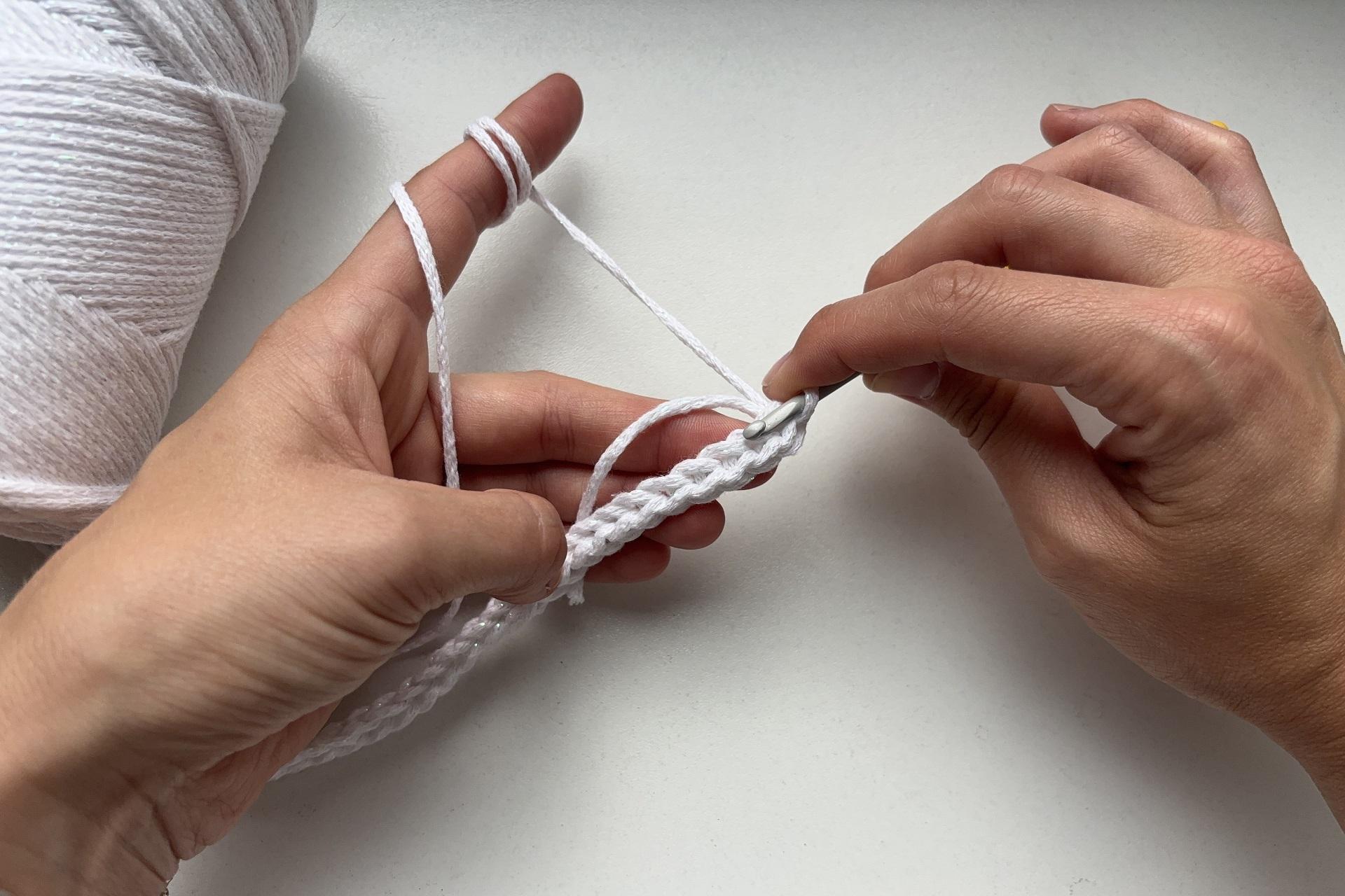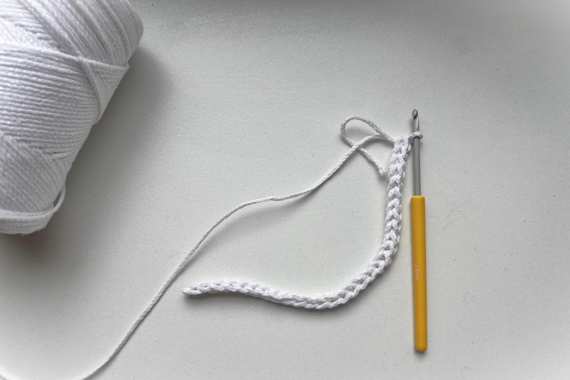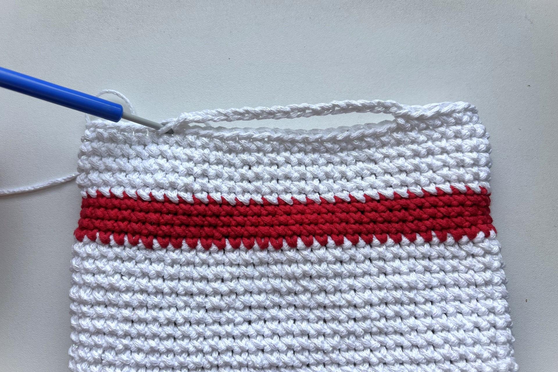 8. V tejto rade háčkujeme uši na taške. Uháčkujeme 16RO, preskočíme 16 očiek a pichneme do 17. očka. Rovnako urobíme aj druhé ucho.