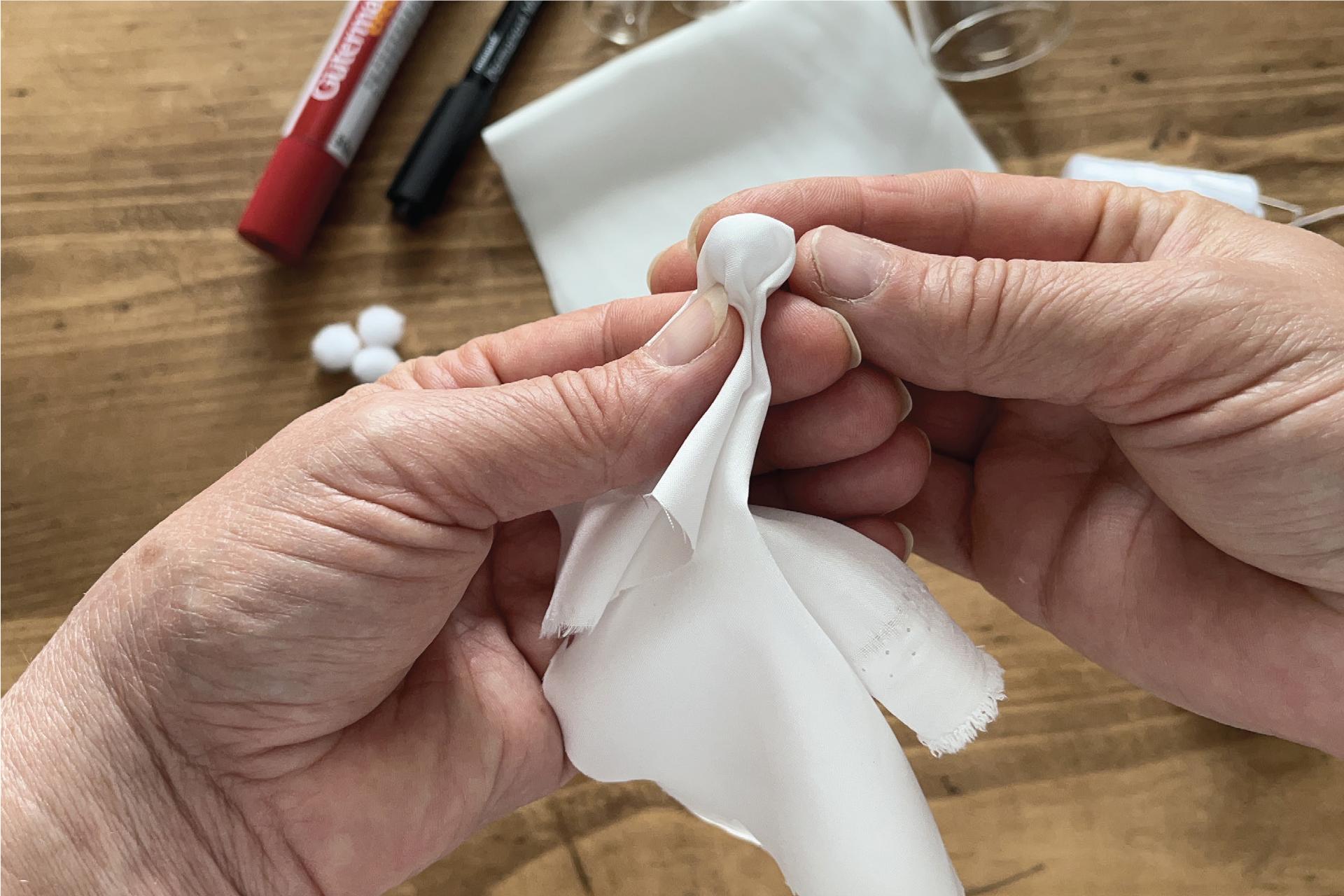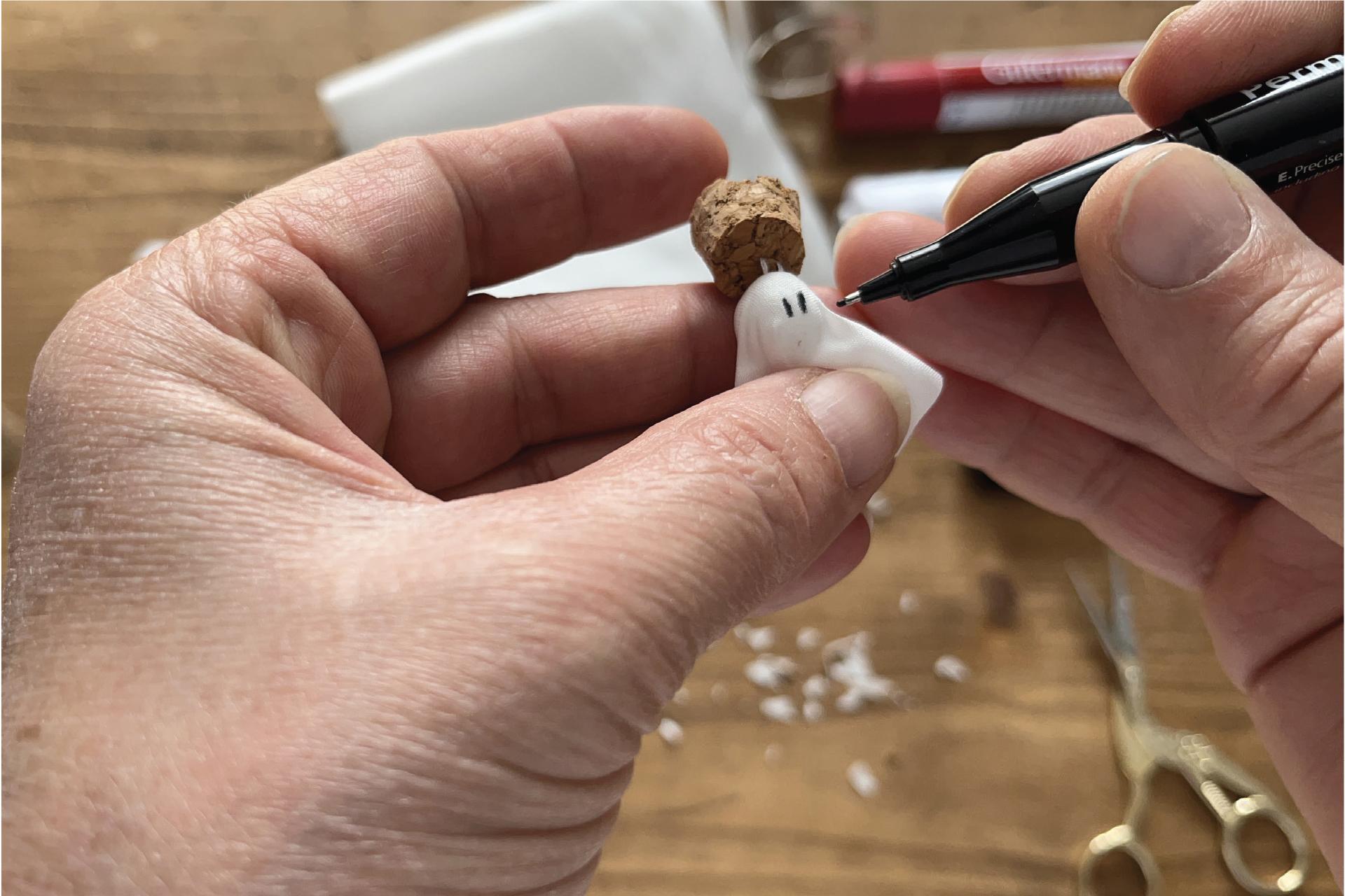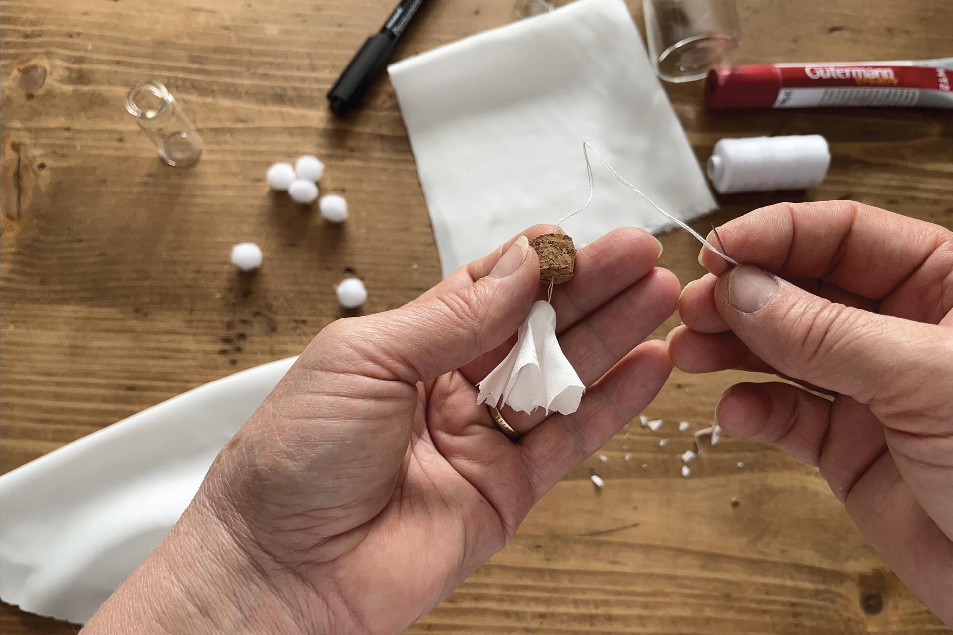 5. Teraz ducha pripevníme k zátke. Môžeme použiť drôtik, prípadne ihlu a niť. Niť prevlečieme duchom zospodu, cez zátku a zase späť. Zaistíme uzlíkom.