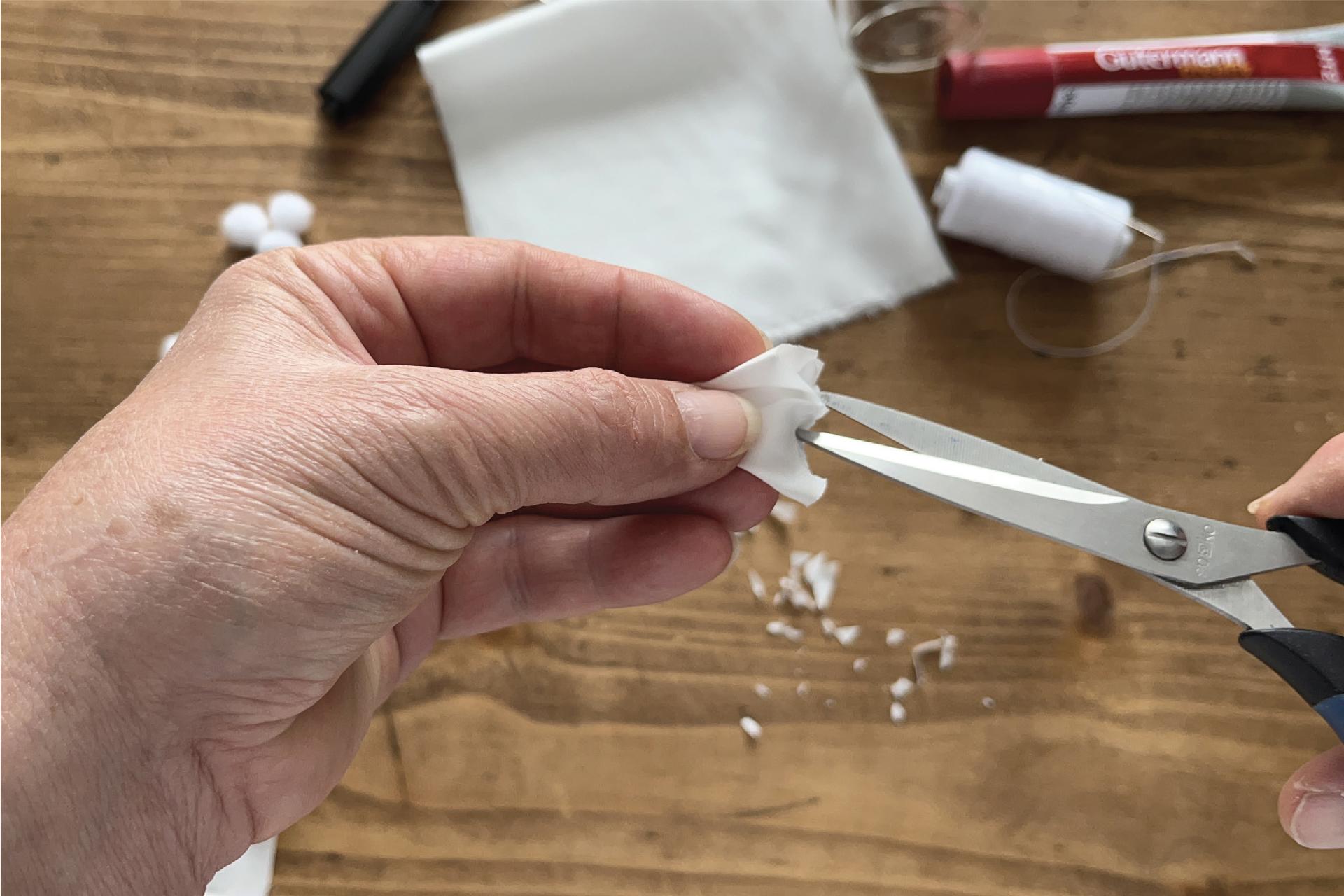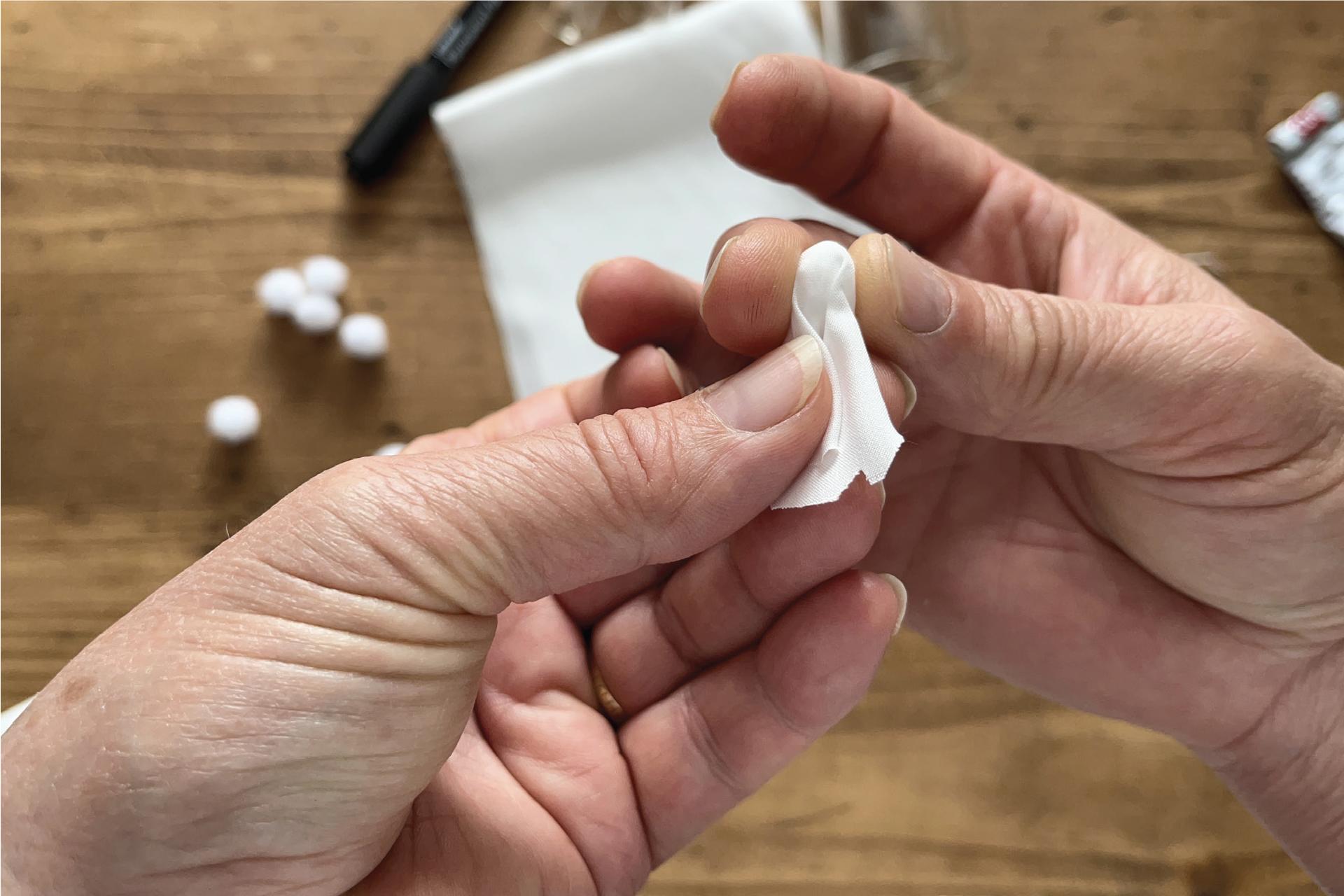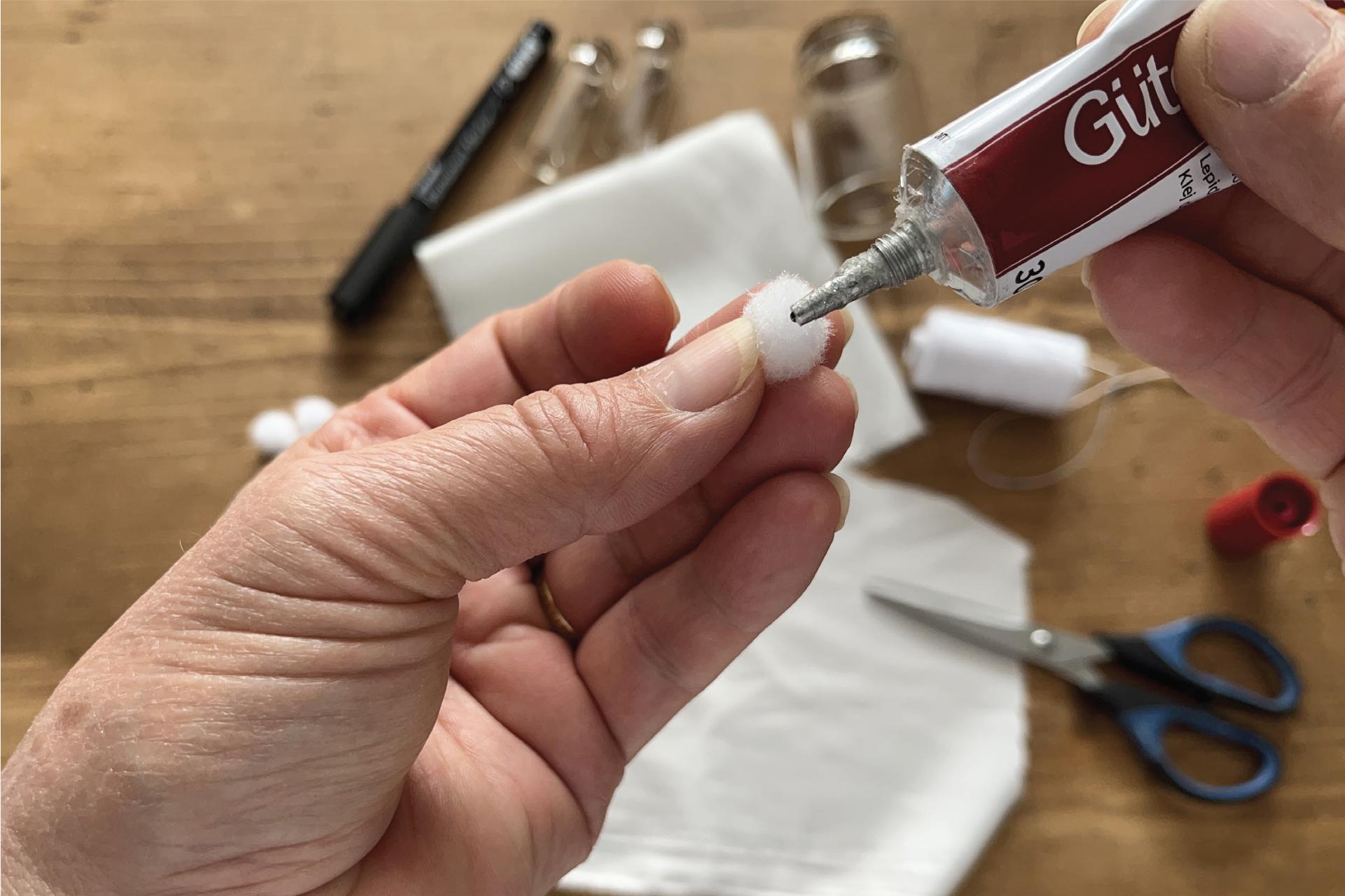 5. Teraz ducha pripevníme k zátke. Môžeme použiť drôtik, prípadne ihlu a niť. Niť prevlečieme duchom zospodu, cez zátku a zase späť. Zaistíme uzlíkom.
