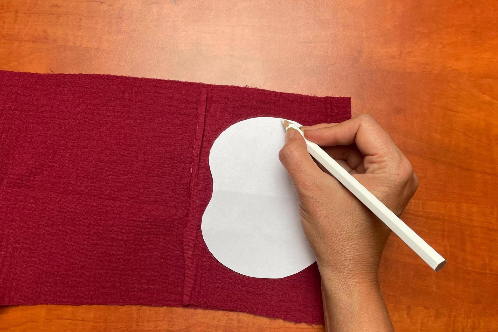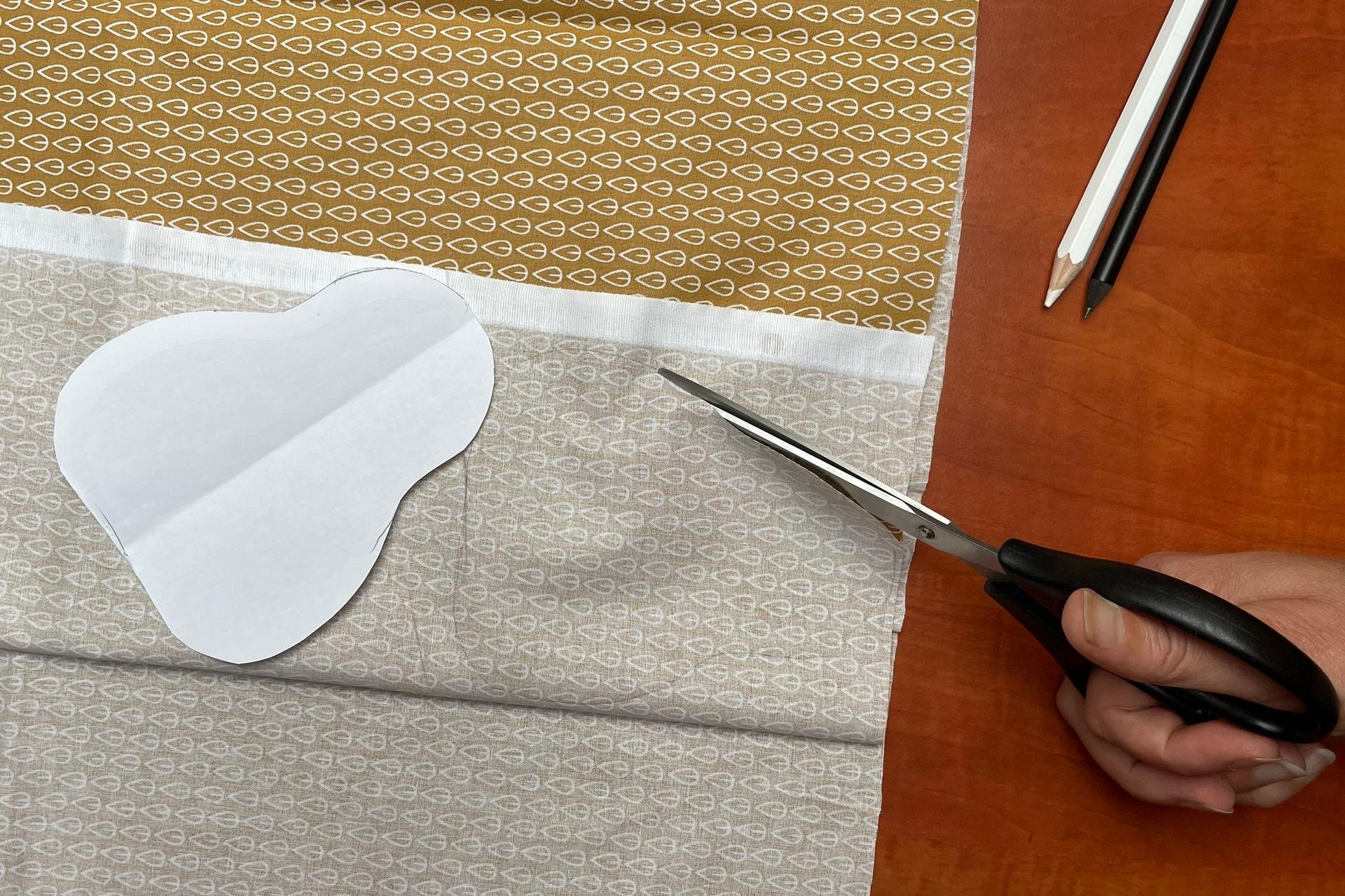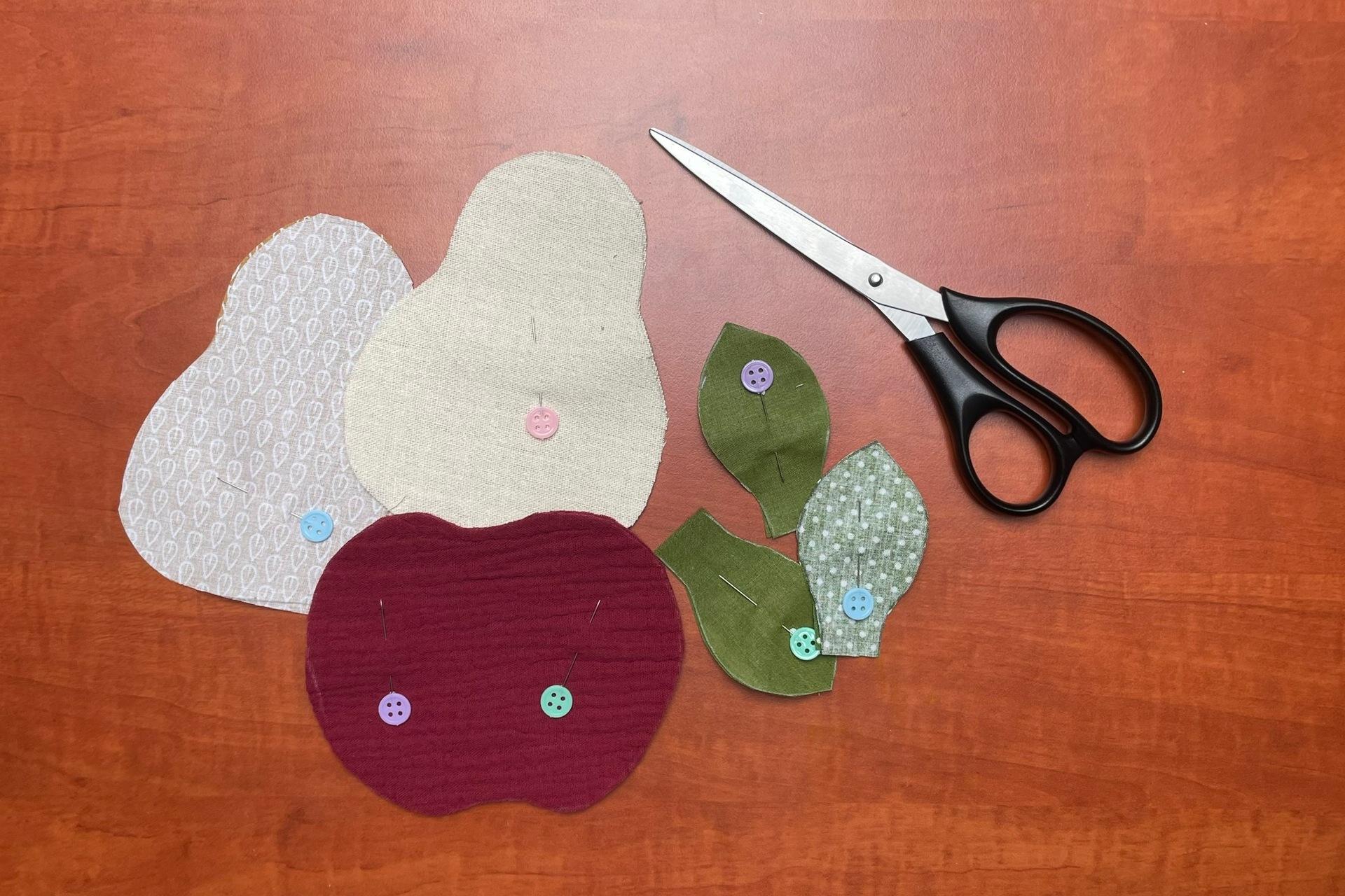 1. Vytlačíme a vystrihneme si šablónu jablka, hrušky a lístka – PDF súbor je uložený pod návodom. Šablónu si prekreslíme na látku, ktorú máme zloženú na 2 vrstvy.