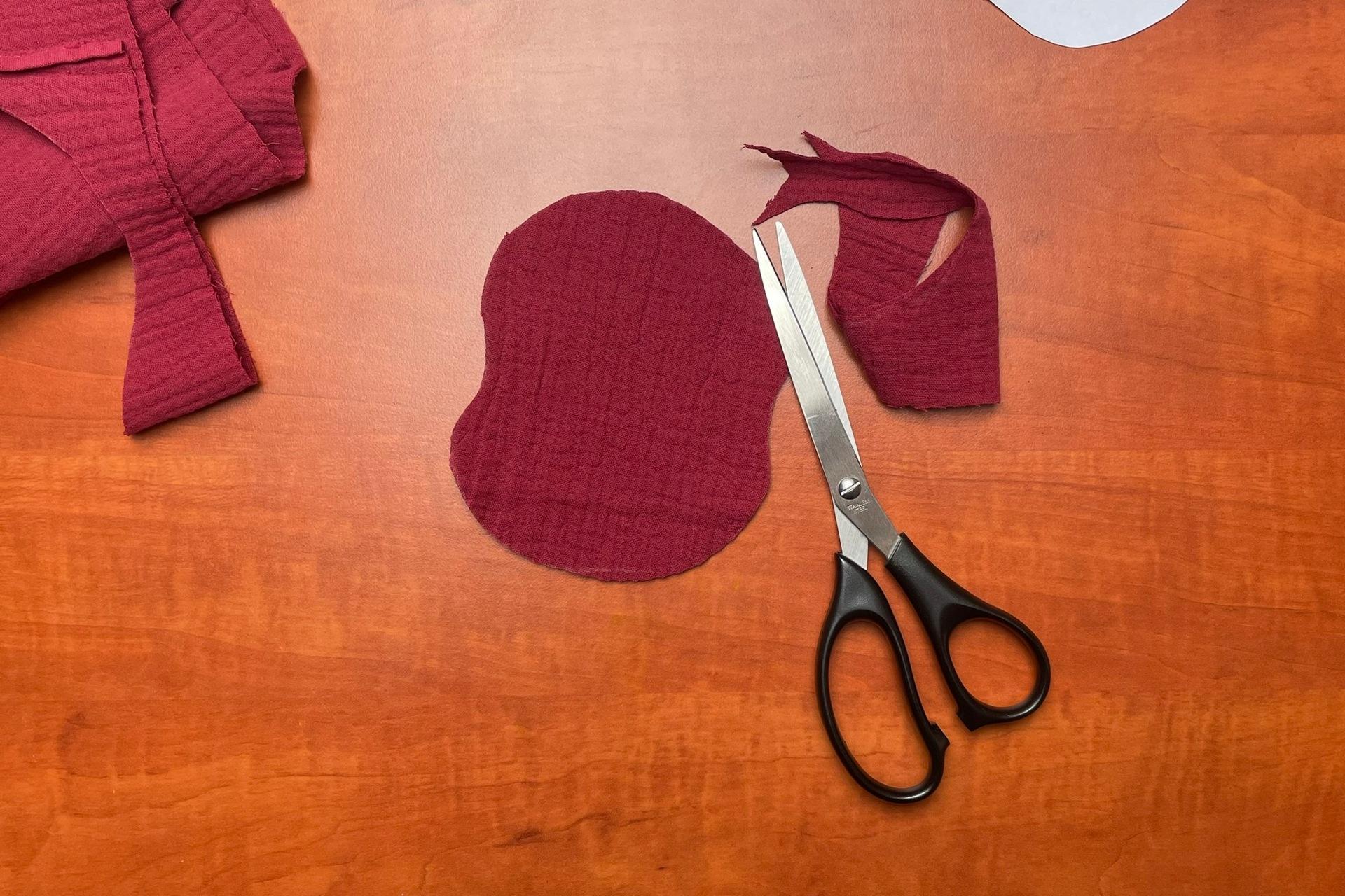 2. Tvar vystrihneme – máme tak 2 rovnaké jabĺčka. Z inej látky (červenej, vínovej, žltej) si môžeme vystrihnúť ešte ďalšie jabĺčka.