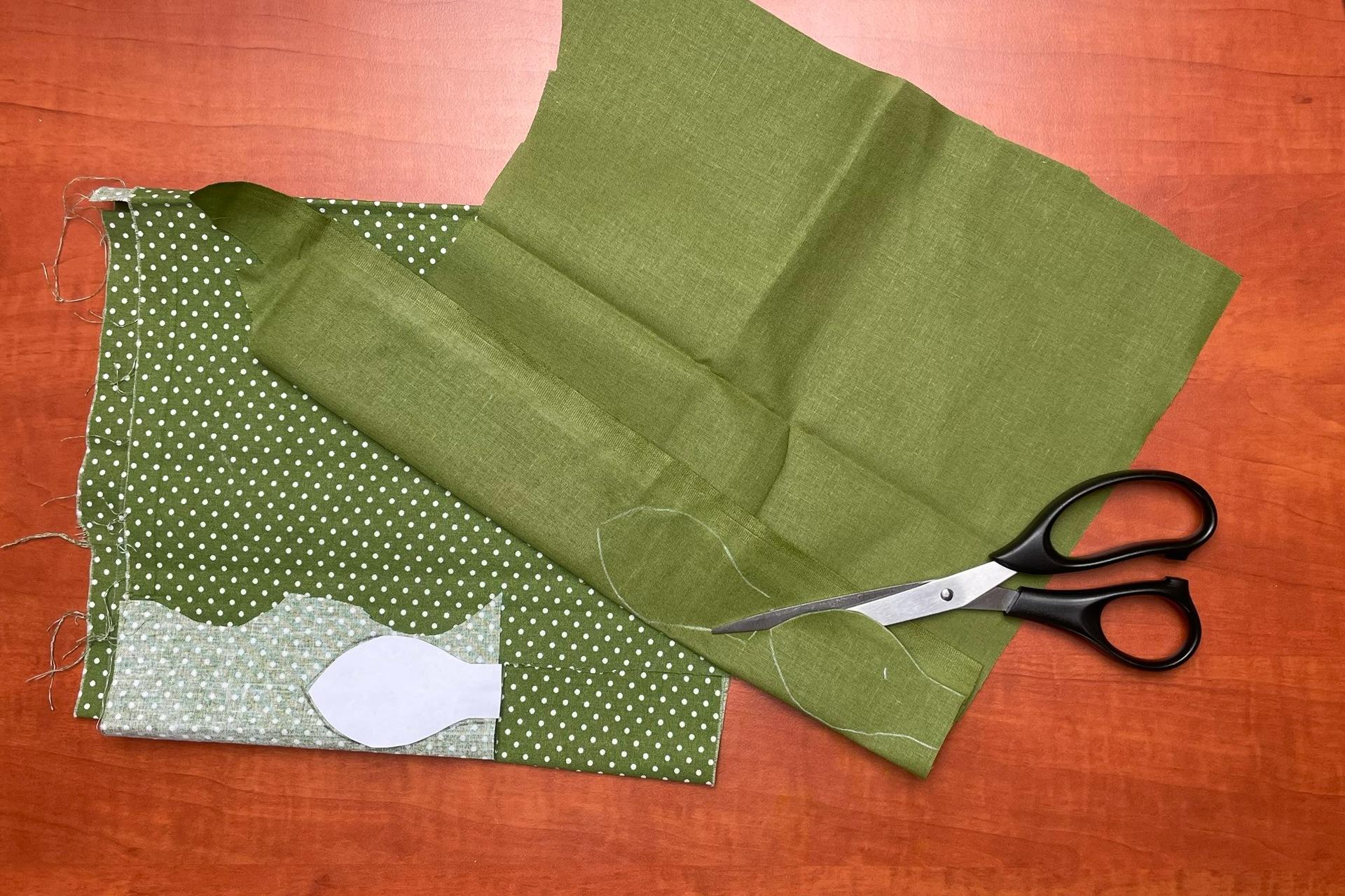 4. Rovnakým spôsobom si vystrihneme zo zelenej látky lístočky – potrebujeme toľko lístočkov, koľko máme jabĺk a hrušiek.