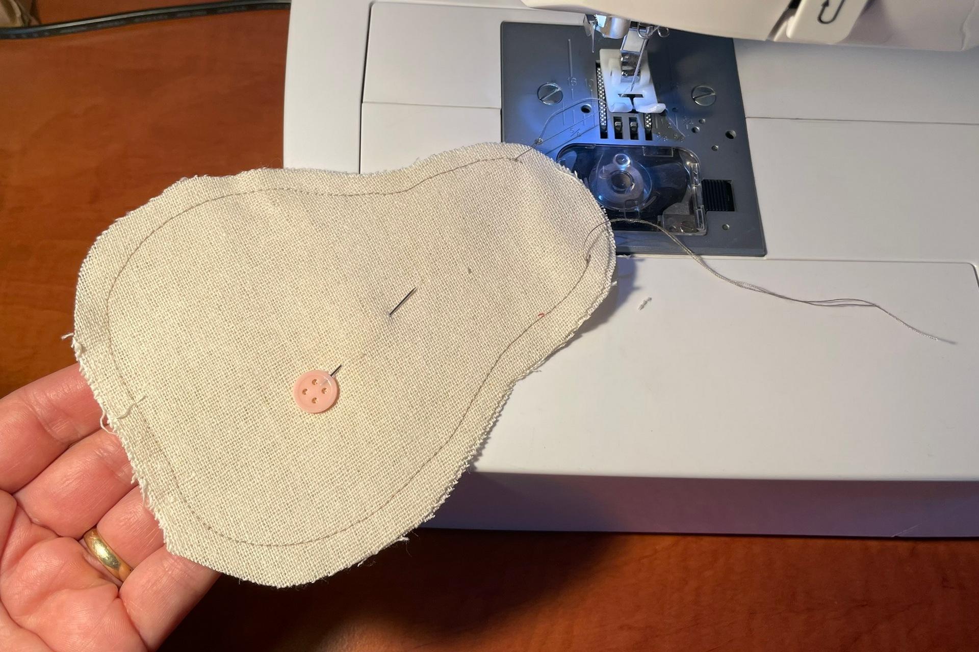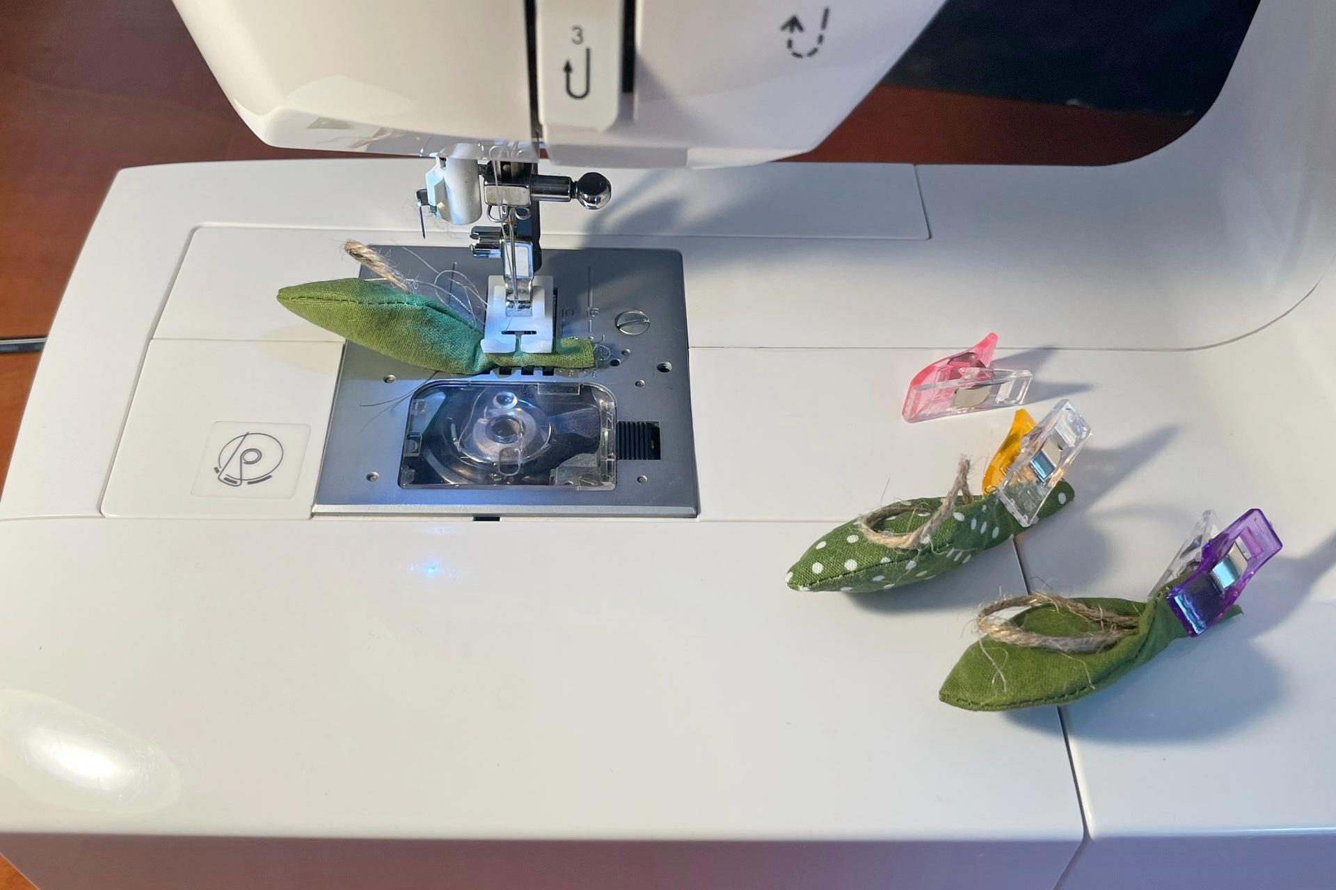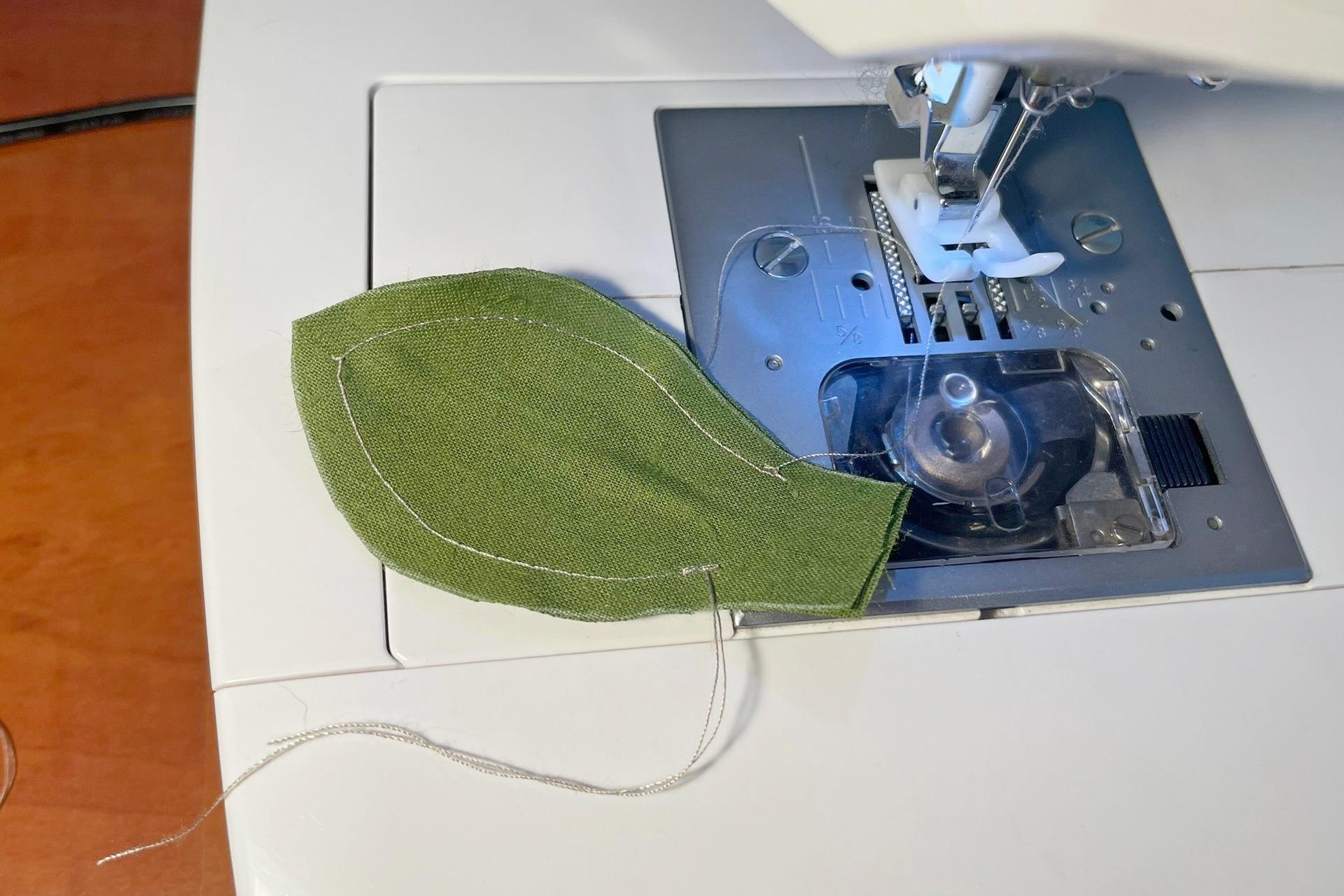 7. Lístoček prešijeme 1 cm od okraja po obvode, ale stopku necháme úplne nezošitú, aby sa lístok dobre pretáčal.