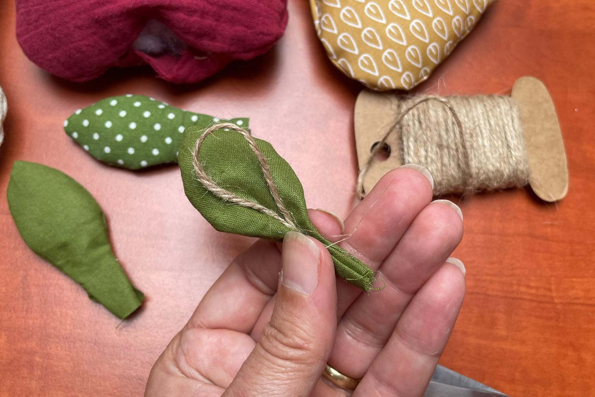 10. Z povrázka si odstrihneme cca 8 cm kúsok, vytvoríme slučku, vložíme ju do stopky lístka a stopku stlačíme a zaistíme štipčekom alebo špendlíkom.