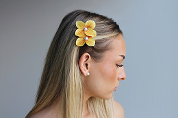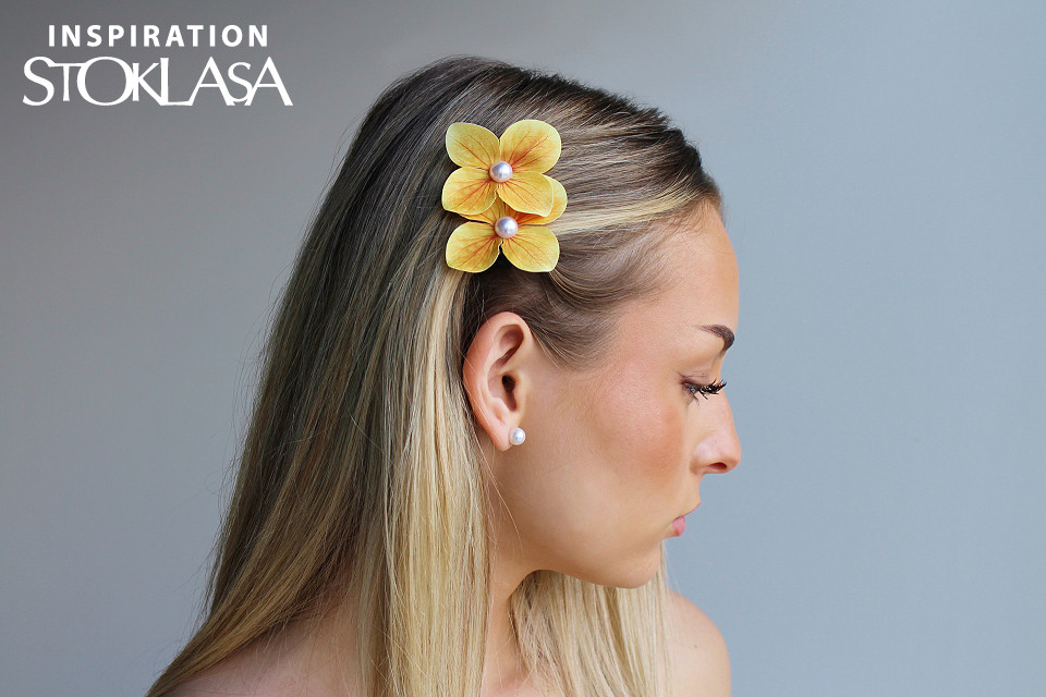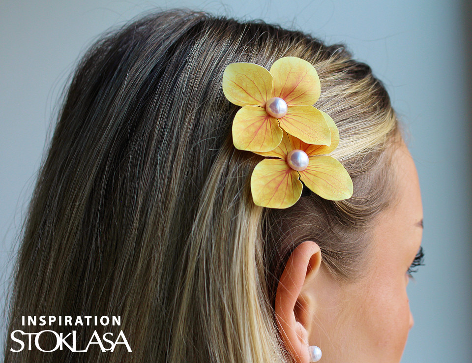 Veľká spona s kvietkami hortenzie nádherne ozdobí účes na všedný deň aj slávnostnú udalosť. Kvety sú elegantné, z tenkého foamiranu, ktorý pekne drží tvar. Majú detailne prepracovanú potlač, ktorá pripomína prírodné kvety v ich najkrajšej podobe. Uprostred sú kvety ozdobené perlou . Spona má kvalitné celokovové prevedenie, vo vlasoch pevne drží vďaka zúbkom . Perfektne sa hodí na prichytenie pramienkov vlasov alebo ako ozdoba do zložitejších vlasových kreácií.
