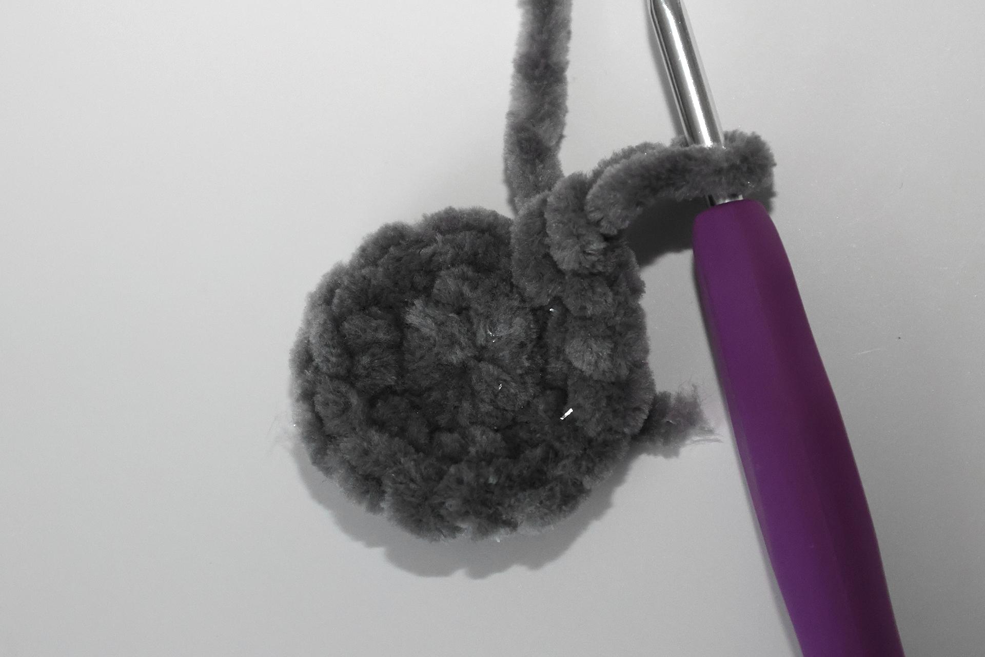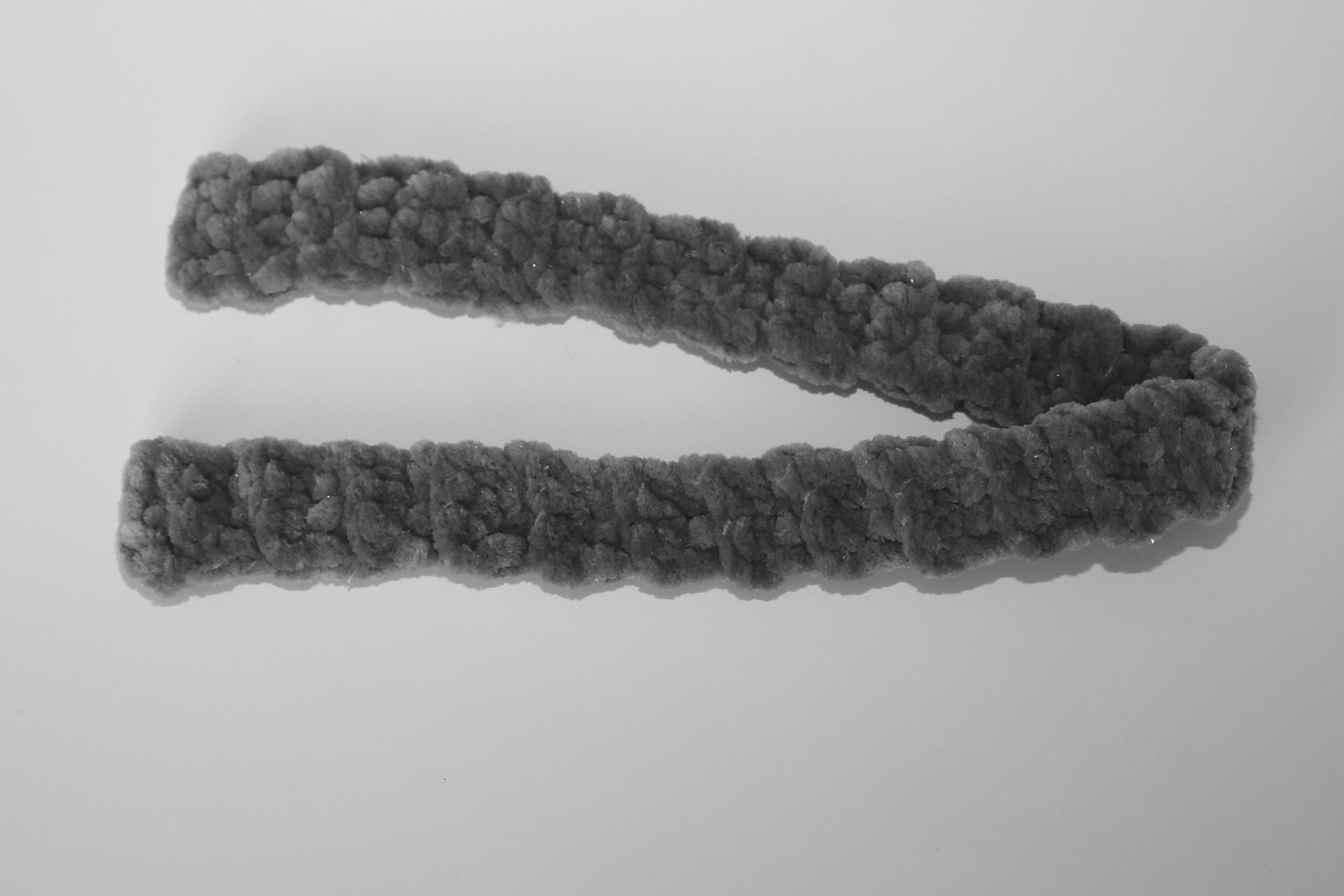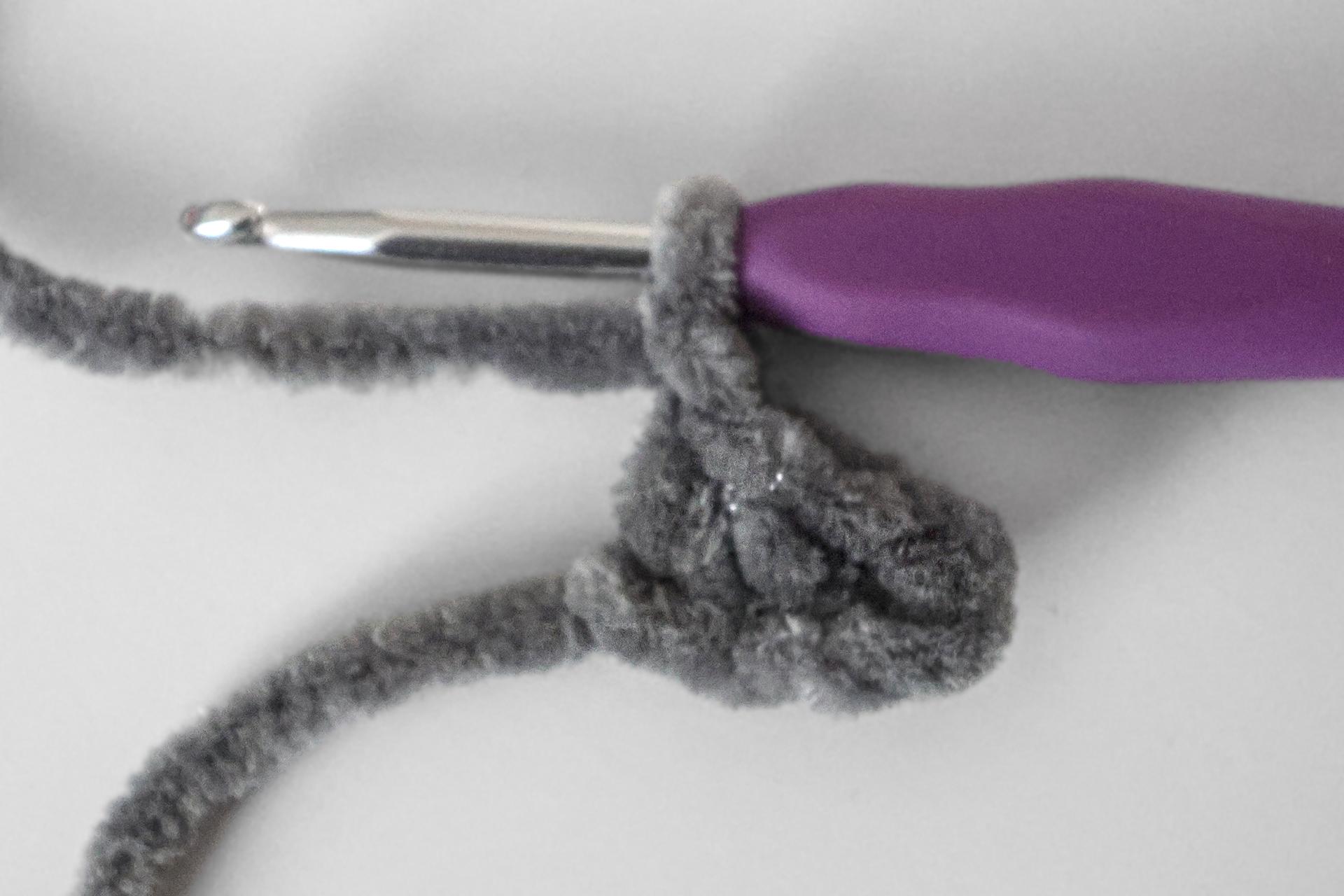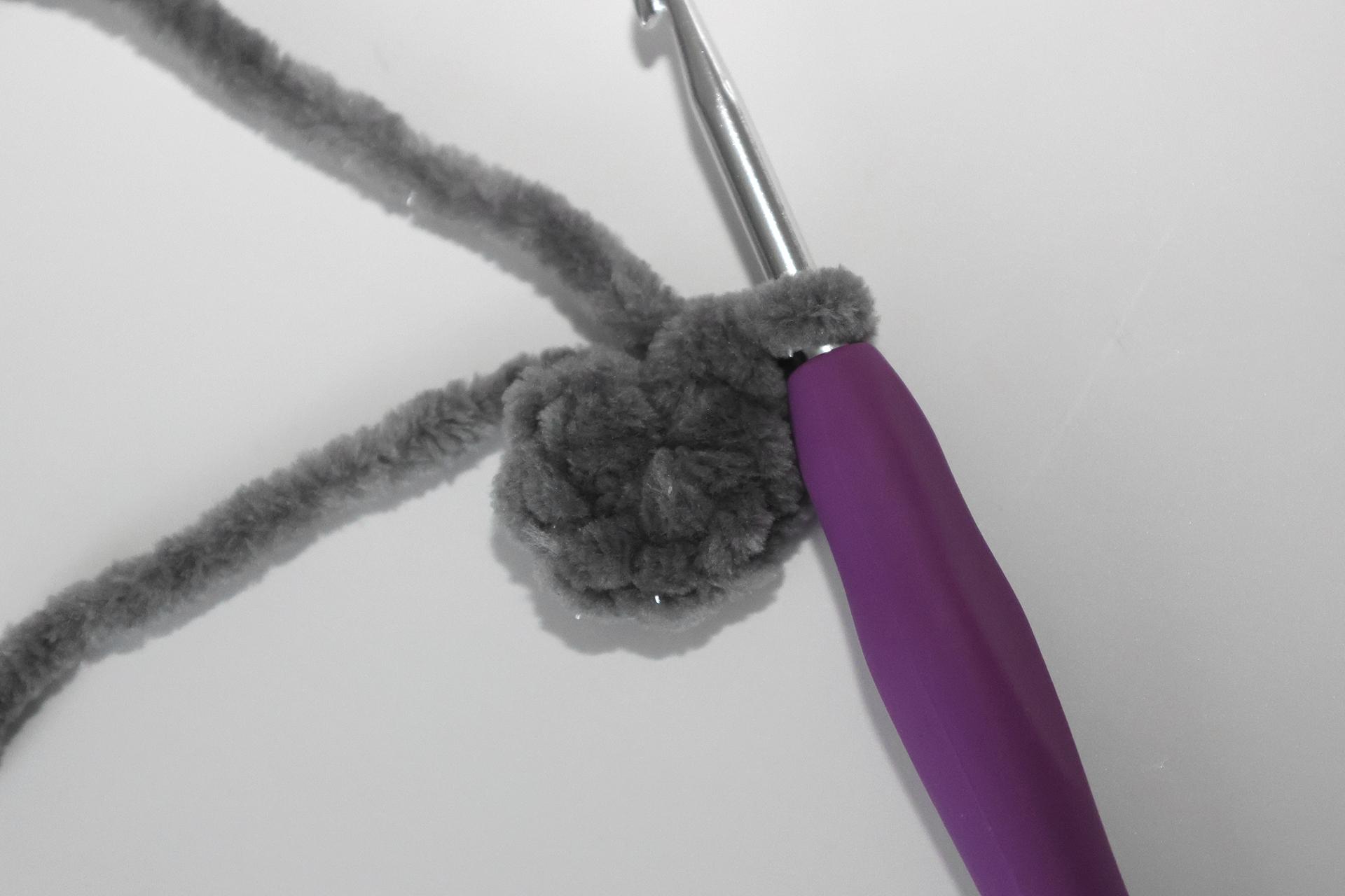 40. Začneme háčkovať zo šedej priadze šál. Uháčkujeme 4RO, od druhého oka od háčika háčkujeme späť 3KS.