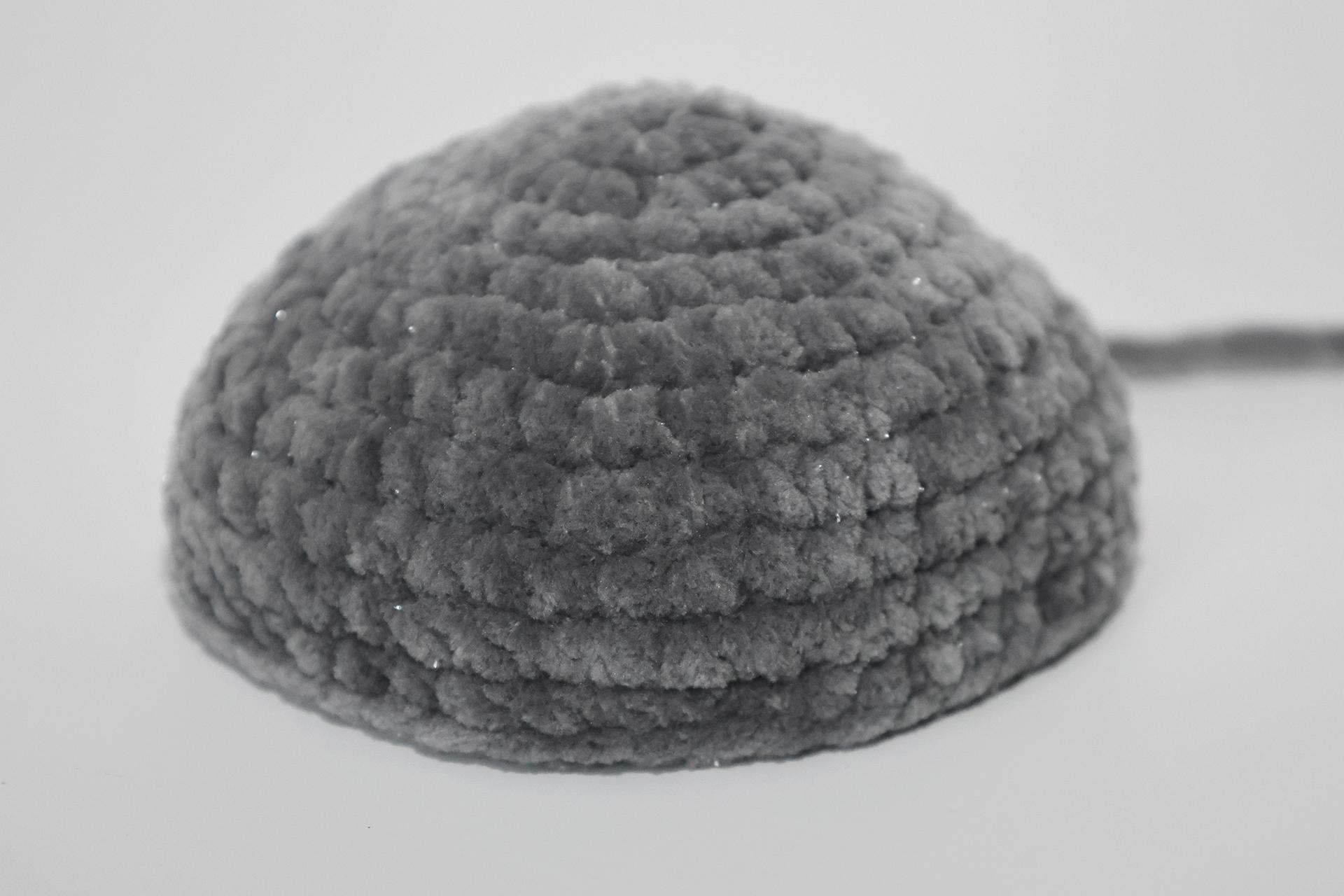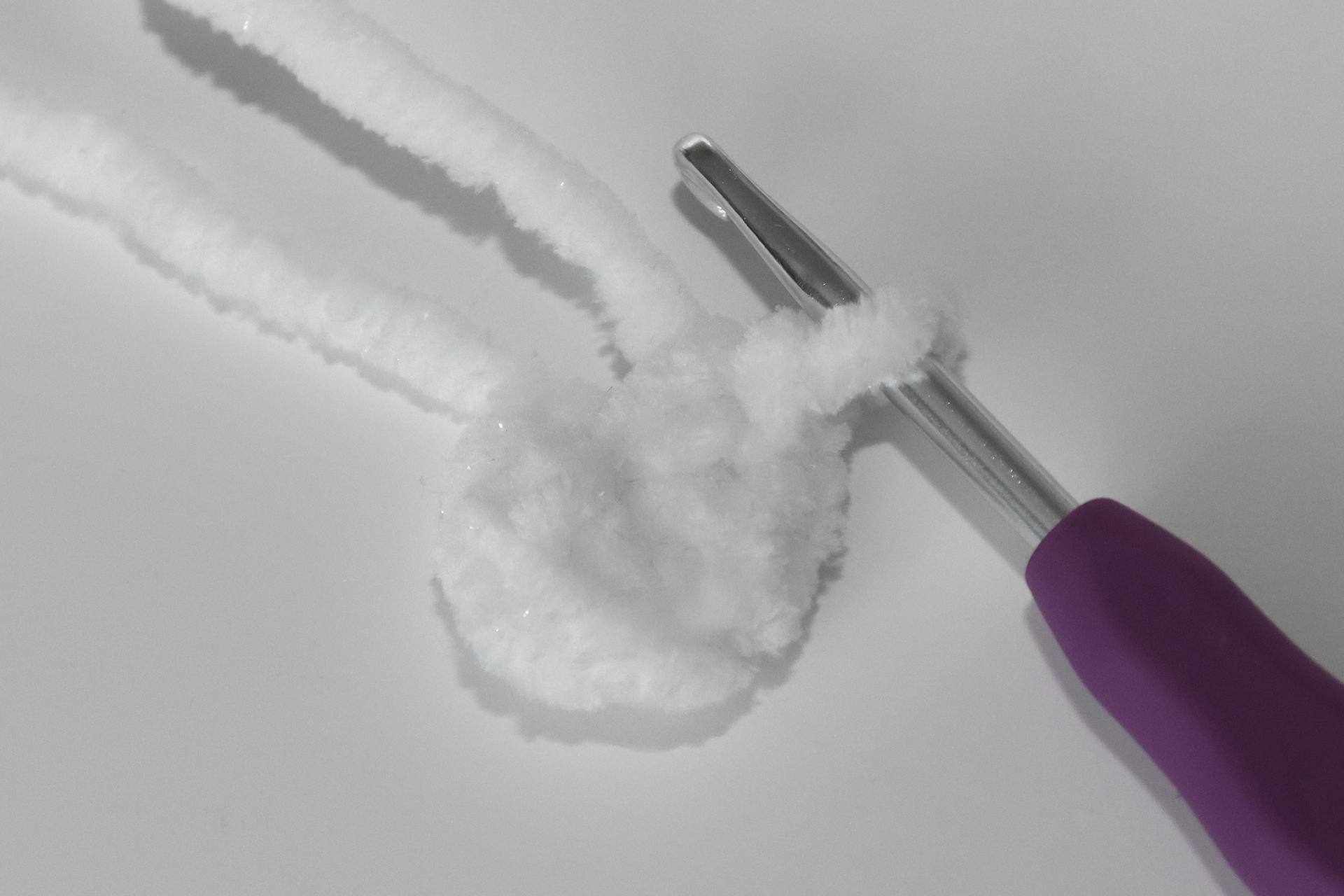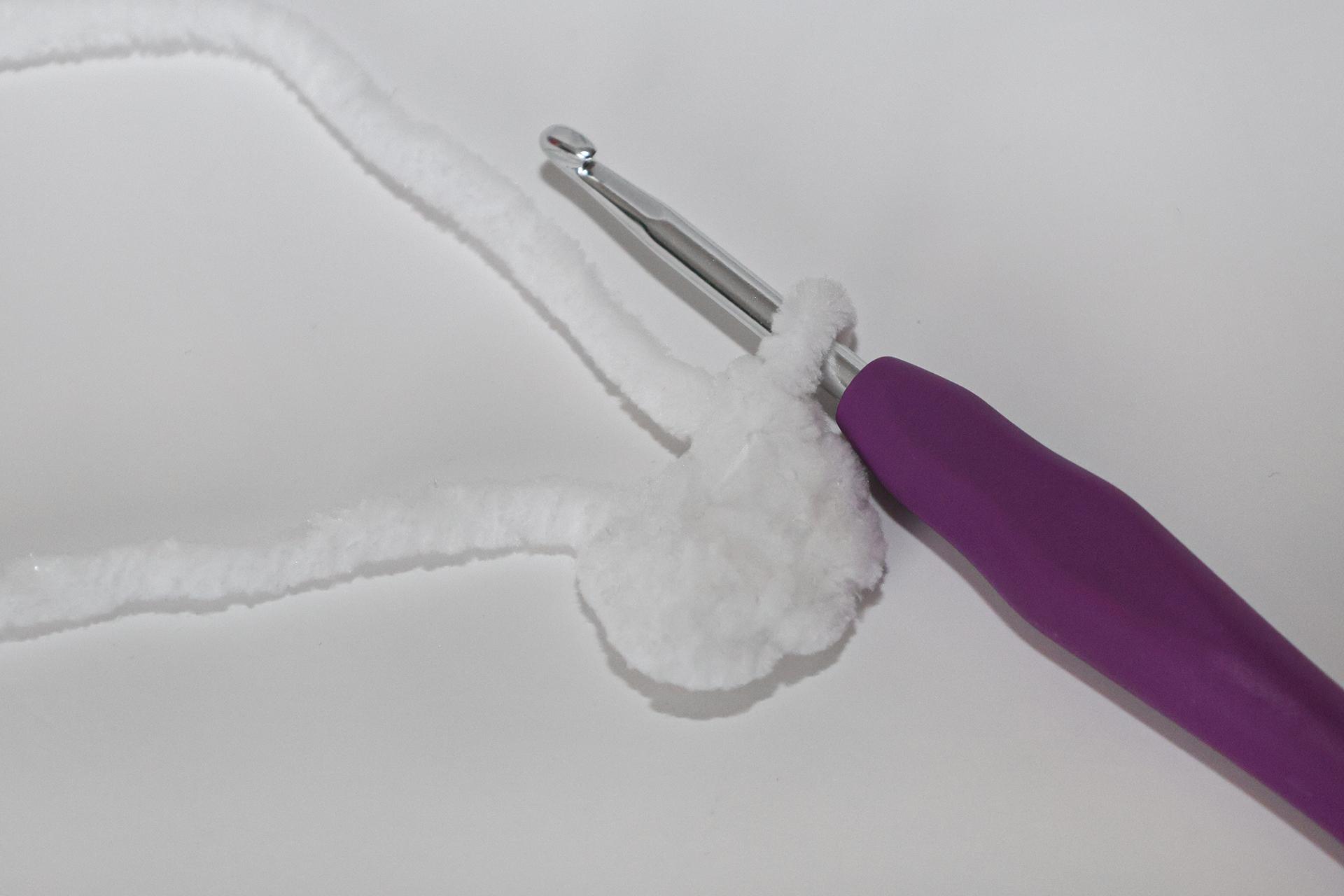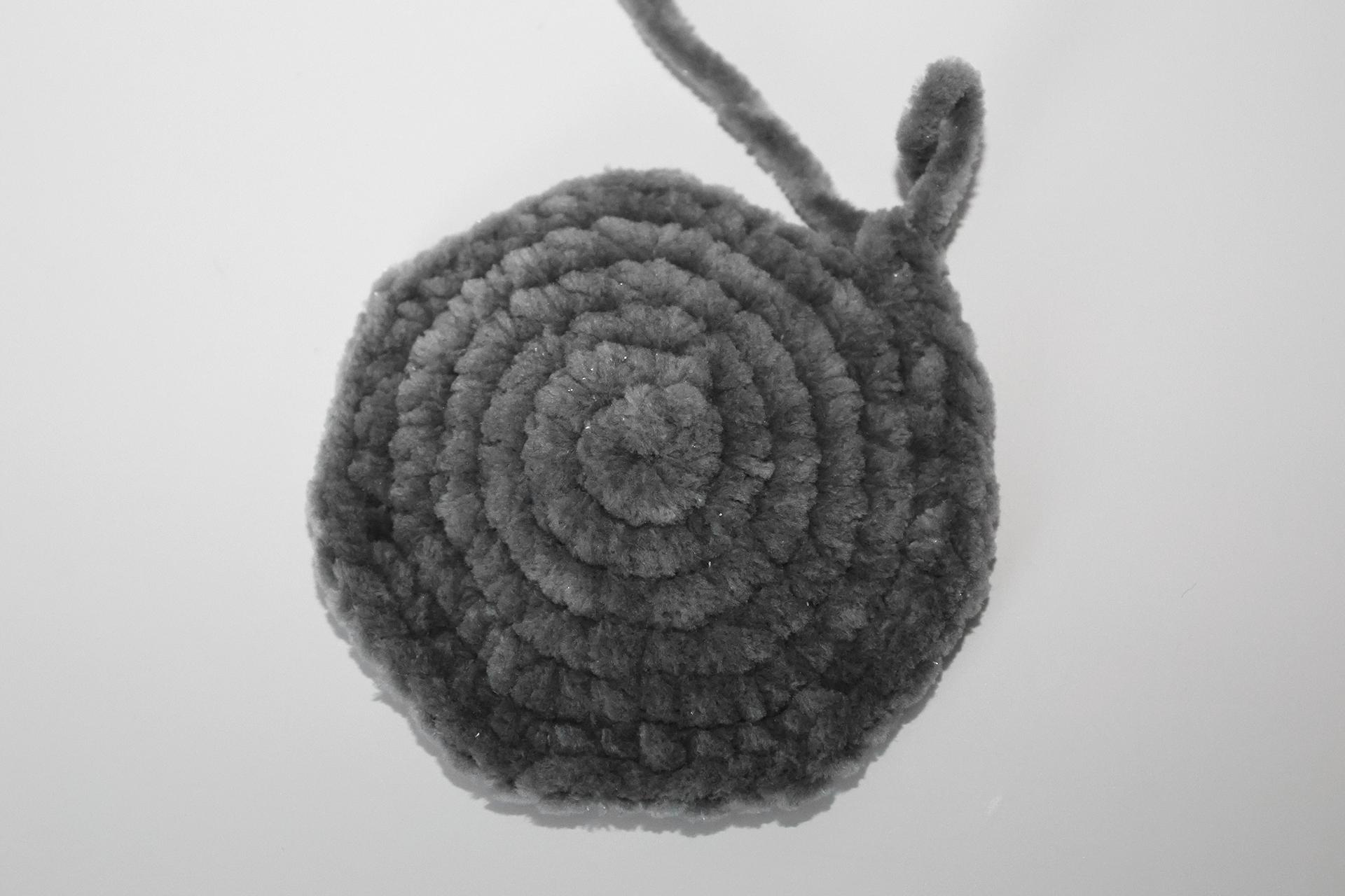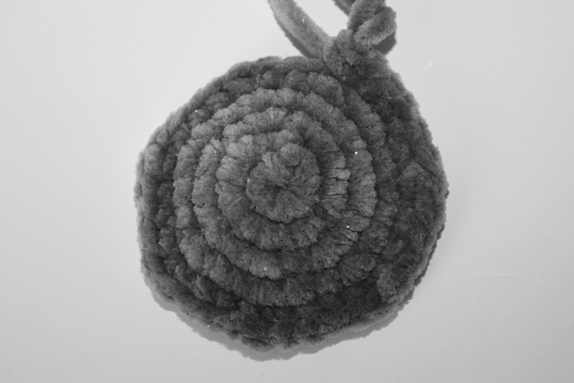 40. Začneme háčkovať zo šedej priadze šál. Uháčkujeme 4RO, od druhého oka od háčika háčkujeme späť 3KS.