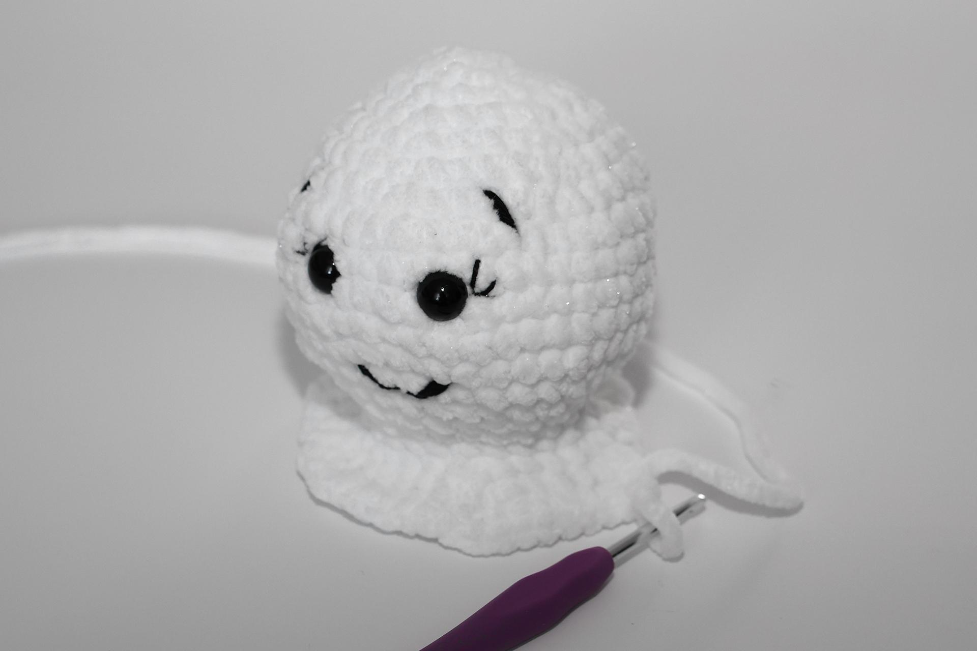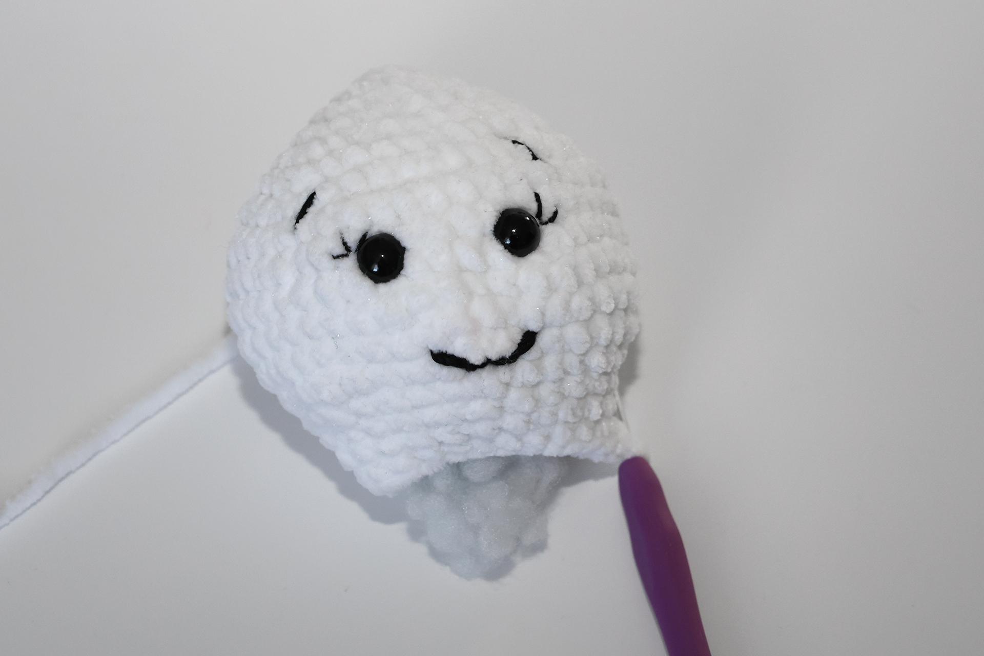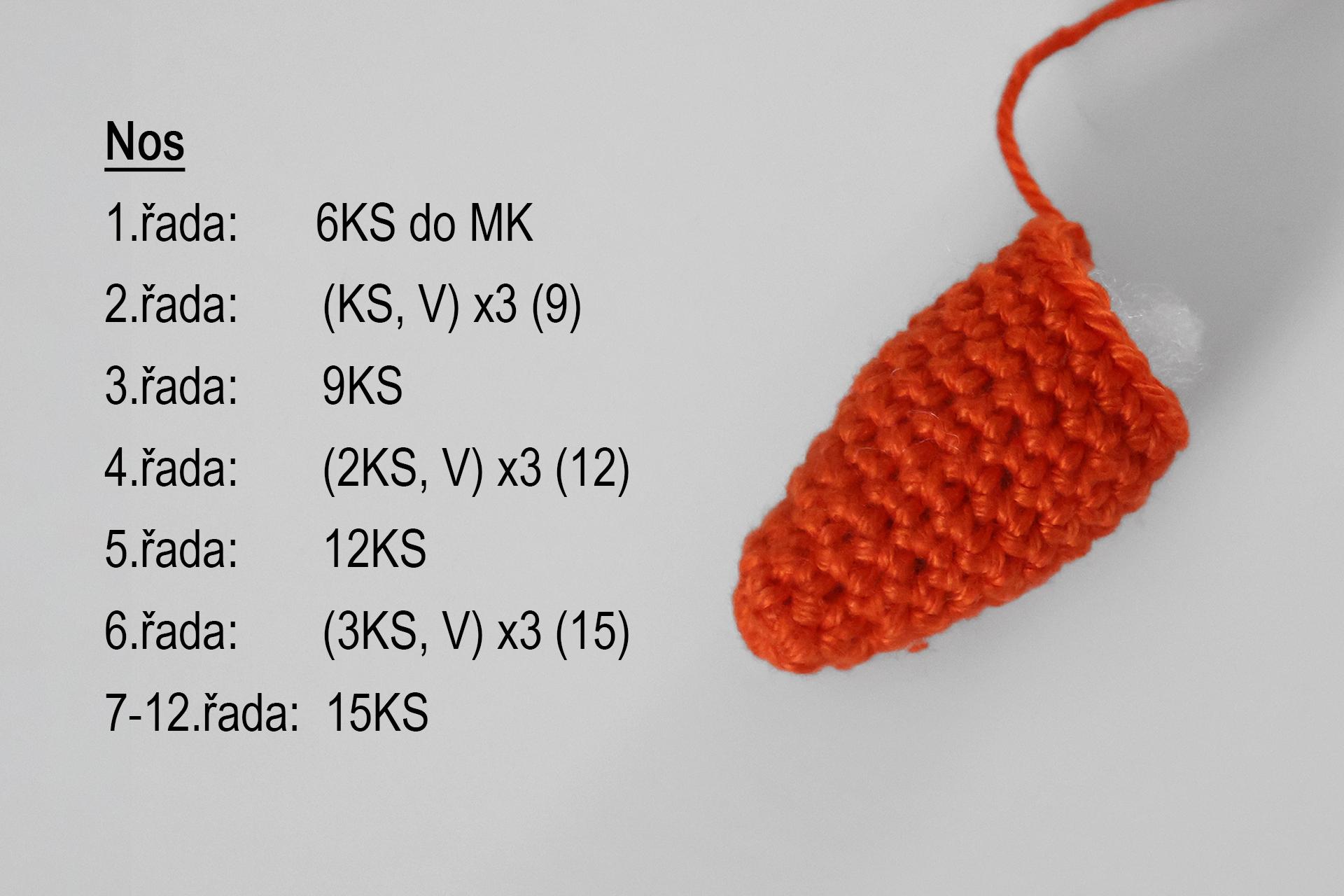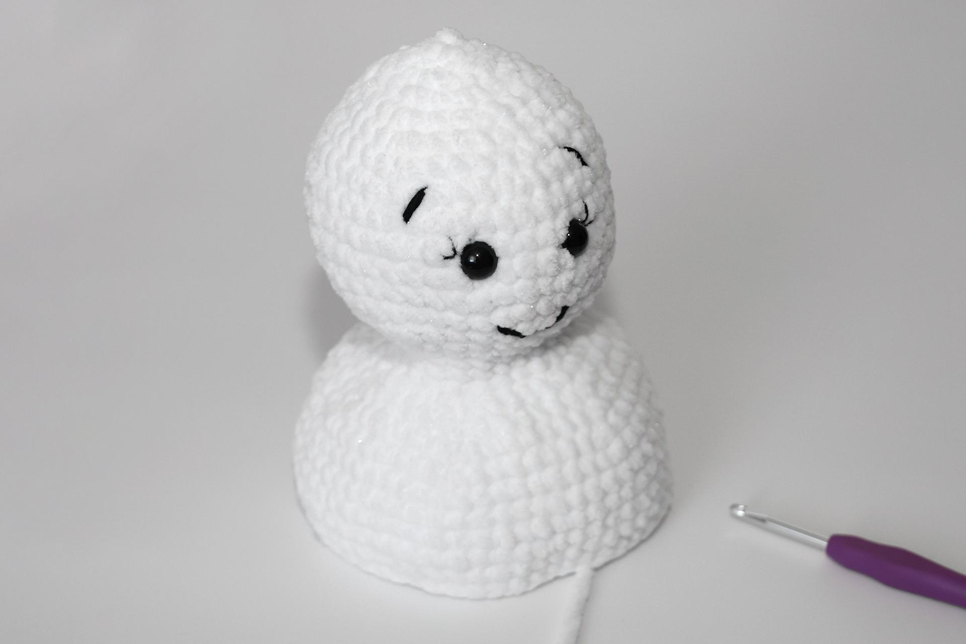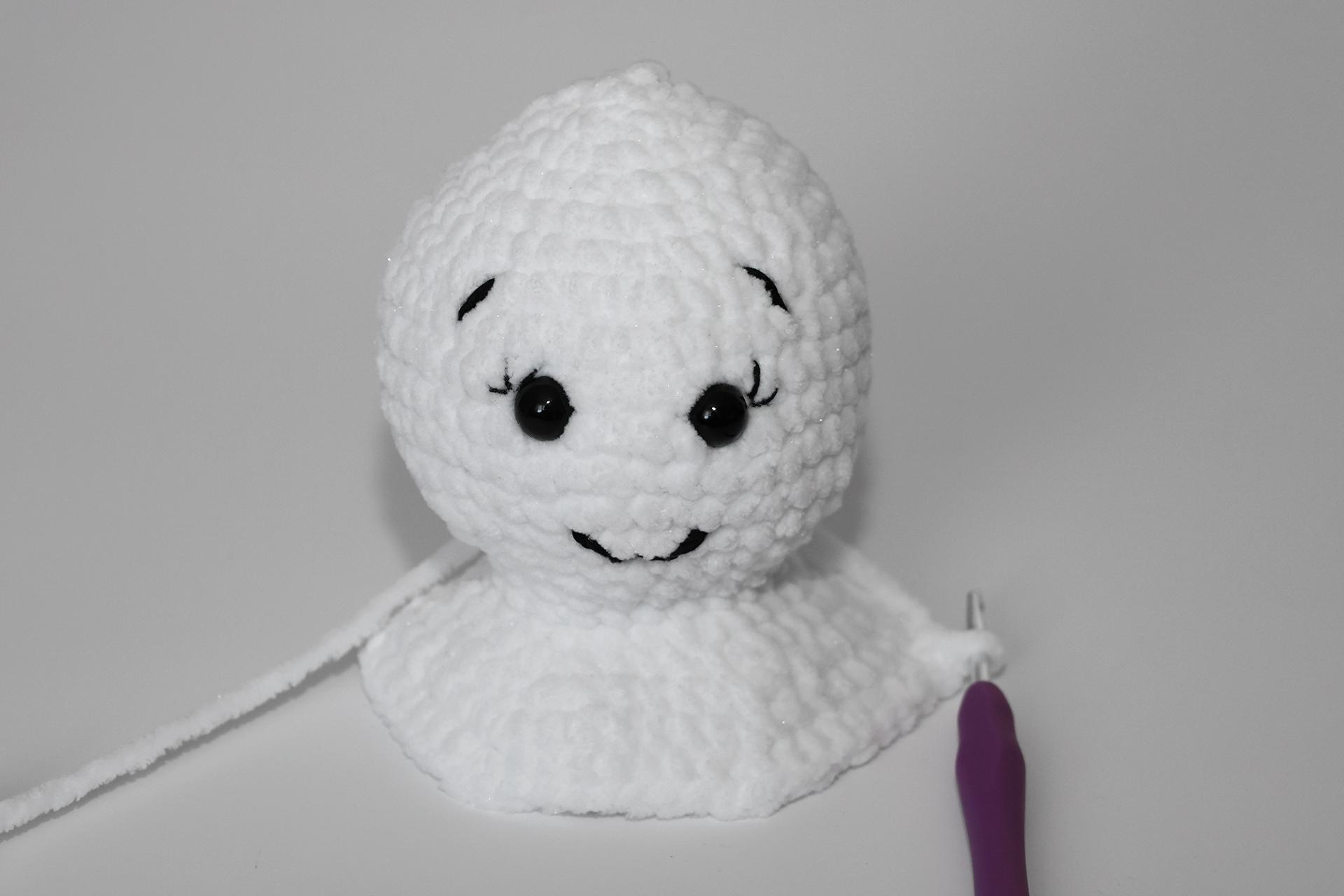 12. Háčkujeme rovno-24KS. Pripevníme oči medzi 9. a 10. radu-5 ok od seba. Vyšijeme obočie a pusu. Vyplníme.