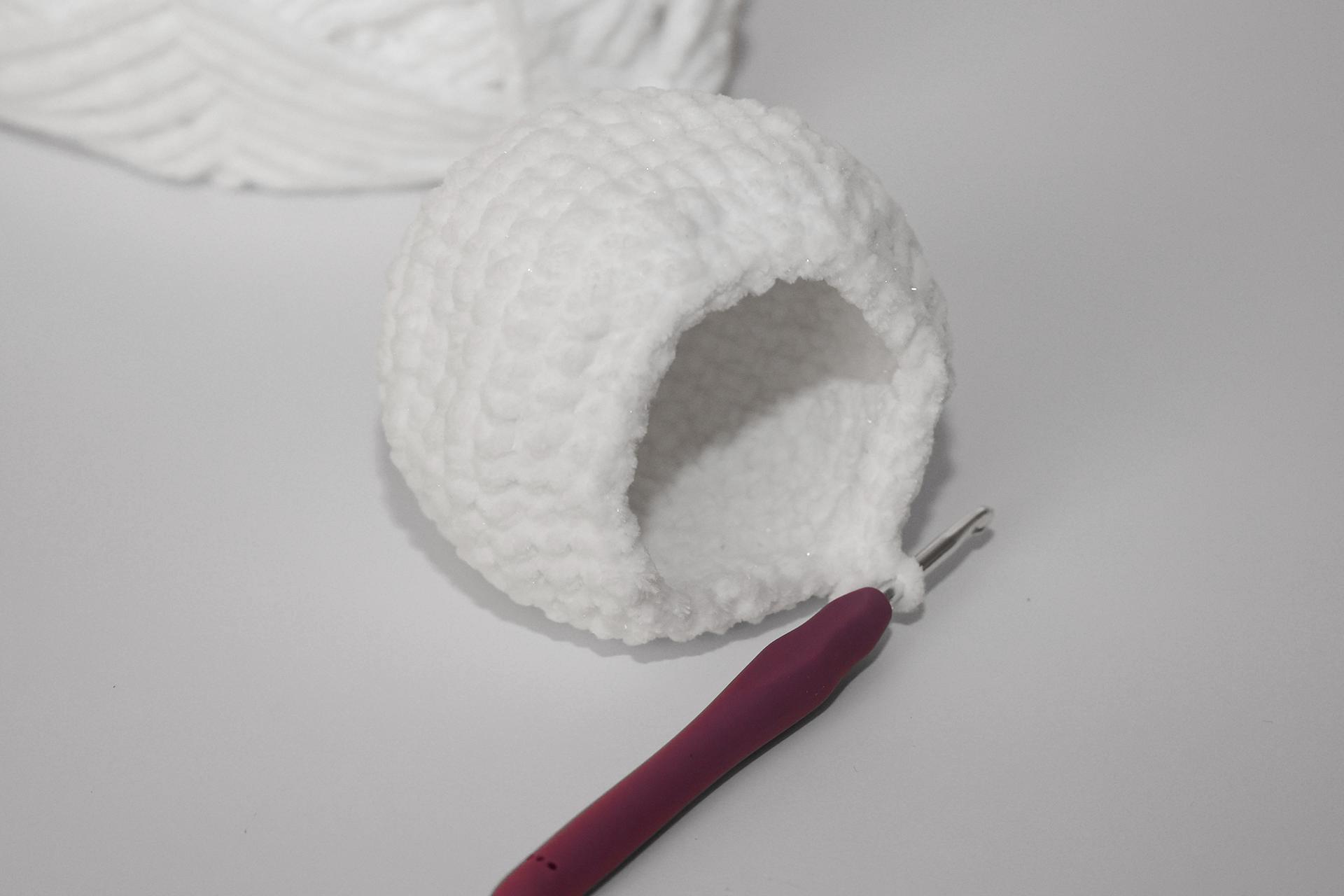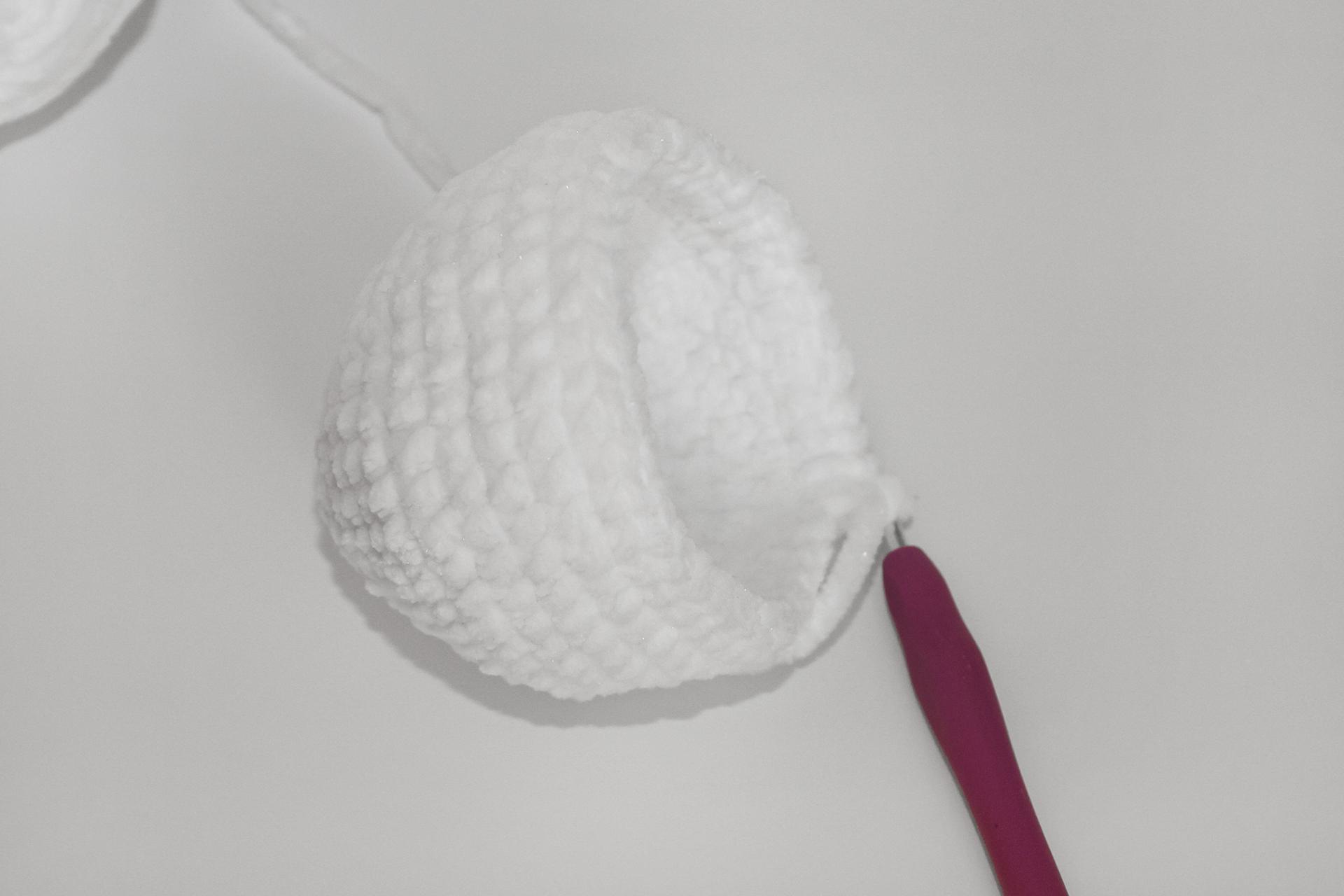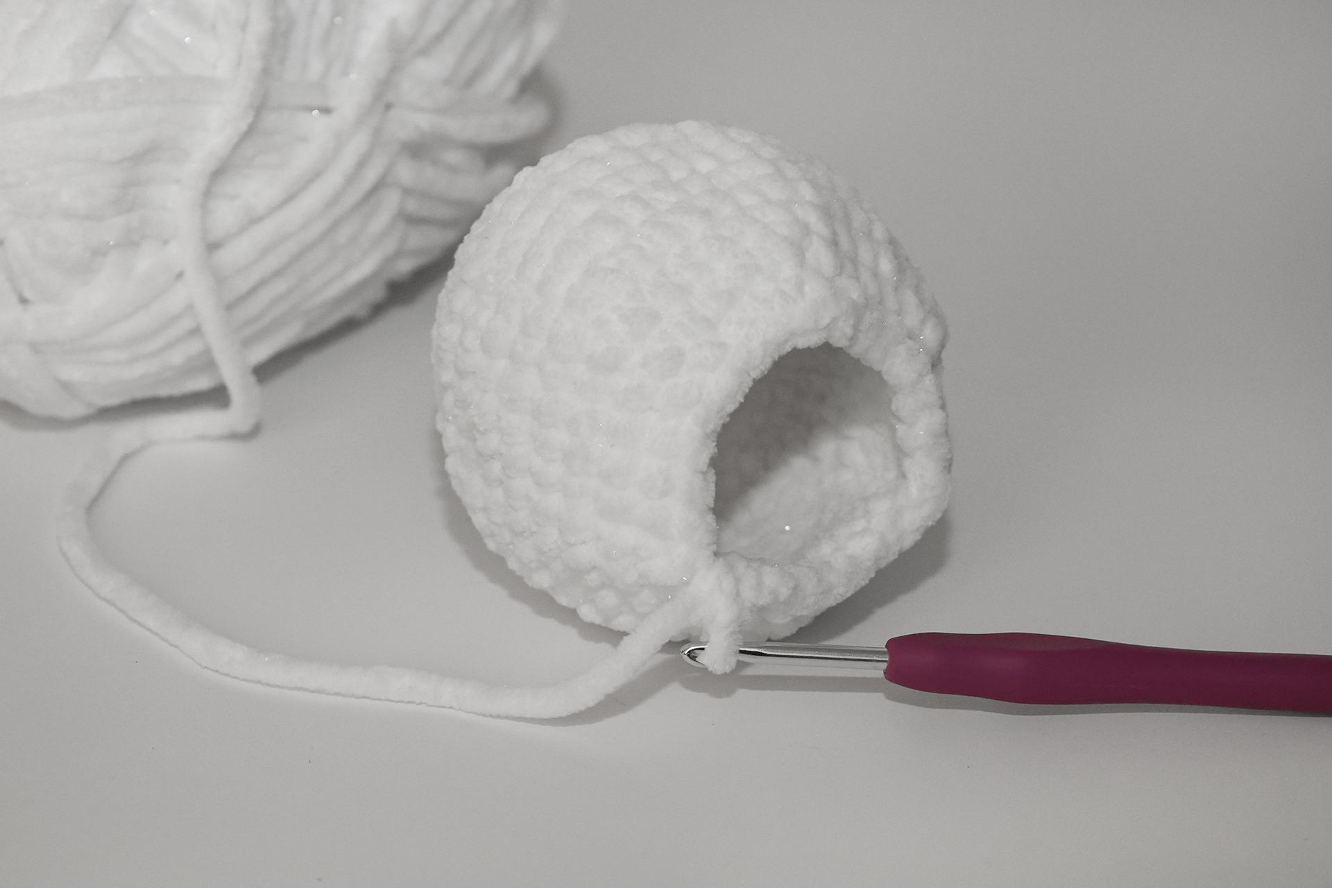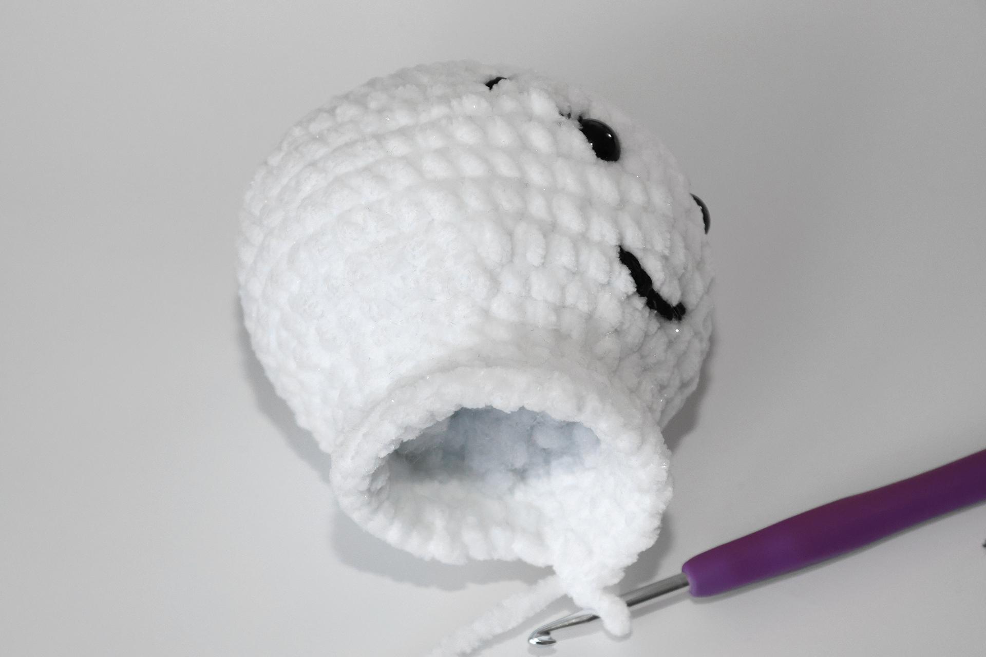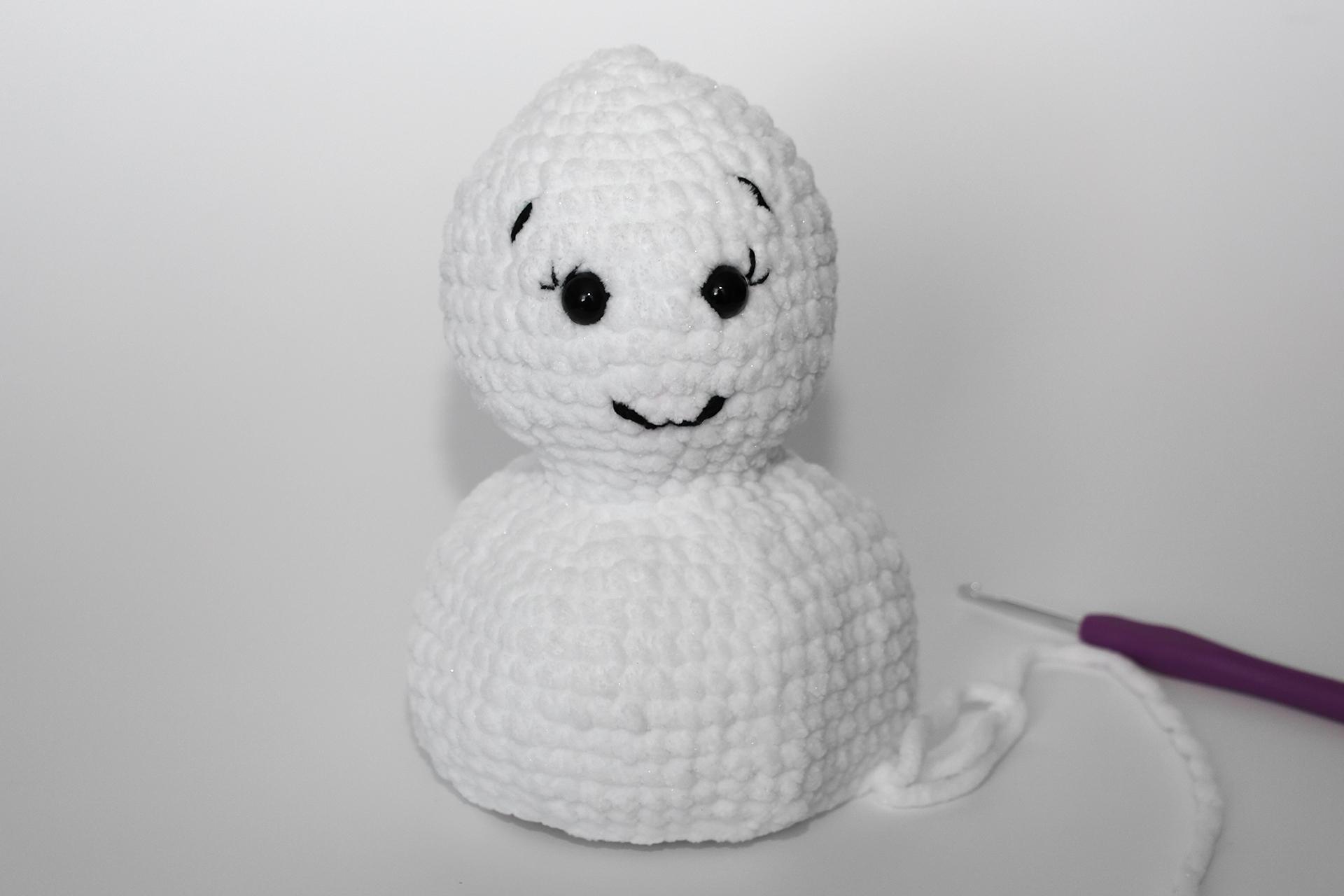 12. Háčkujeme rovno-24KS. Pripevníme oči medzi 9. a 10. radu-5 ok od seba. Vyšijeme obočie a pusu. Vyplníme.
