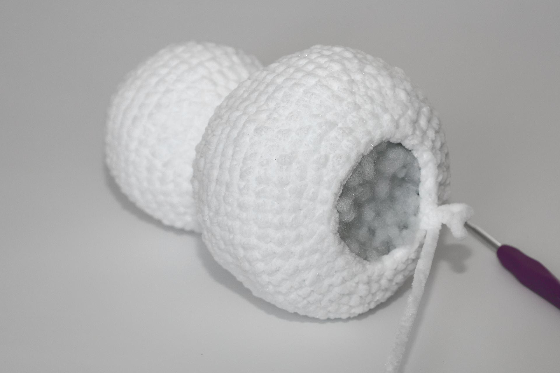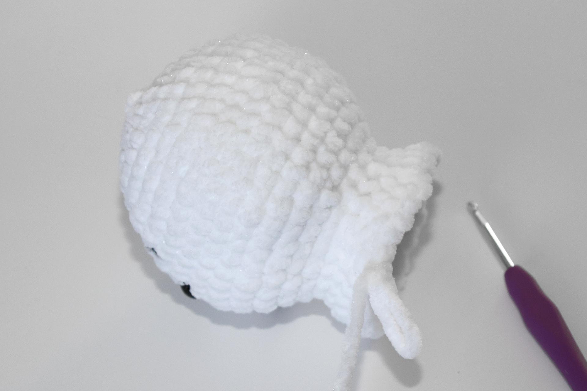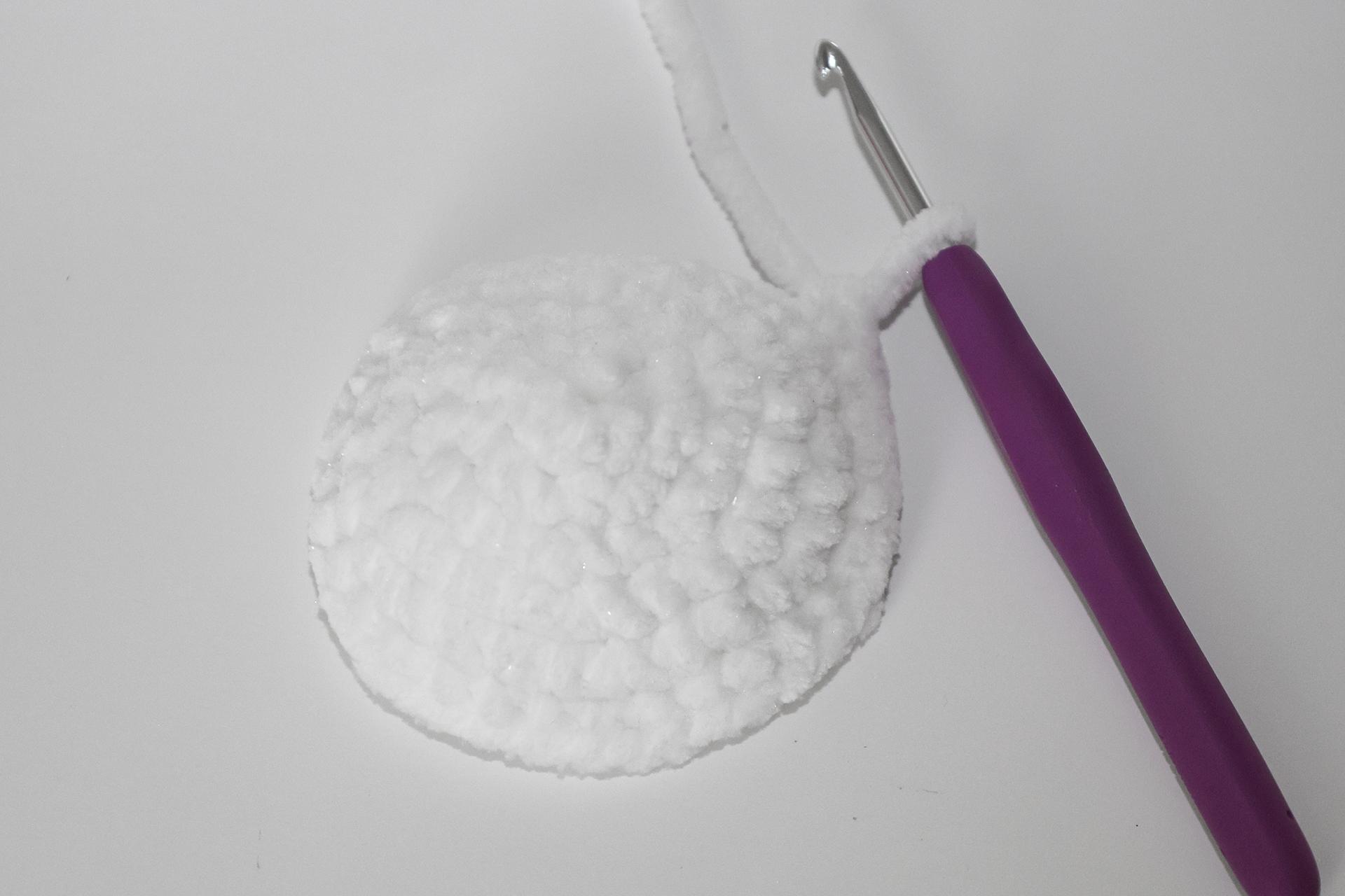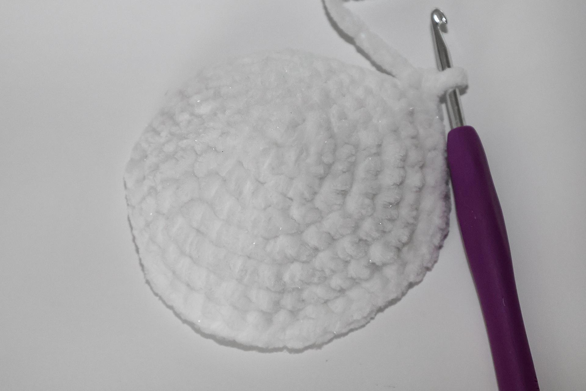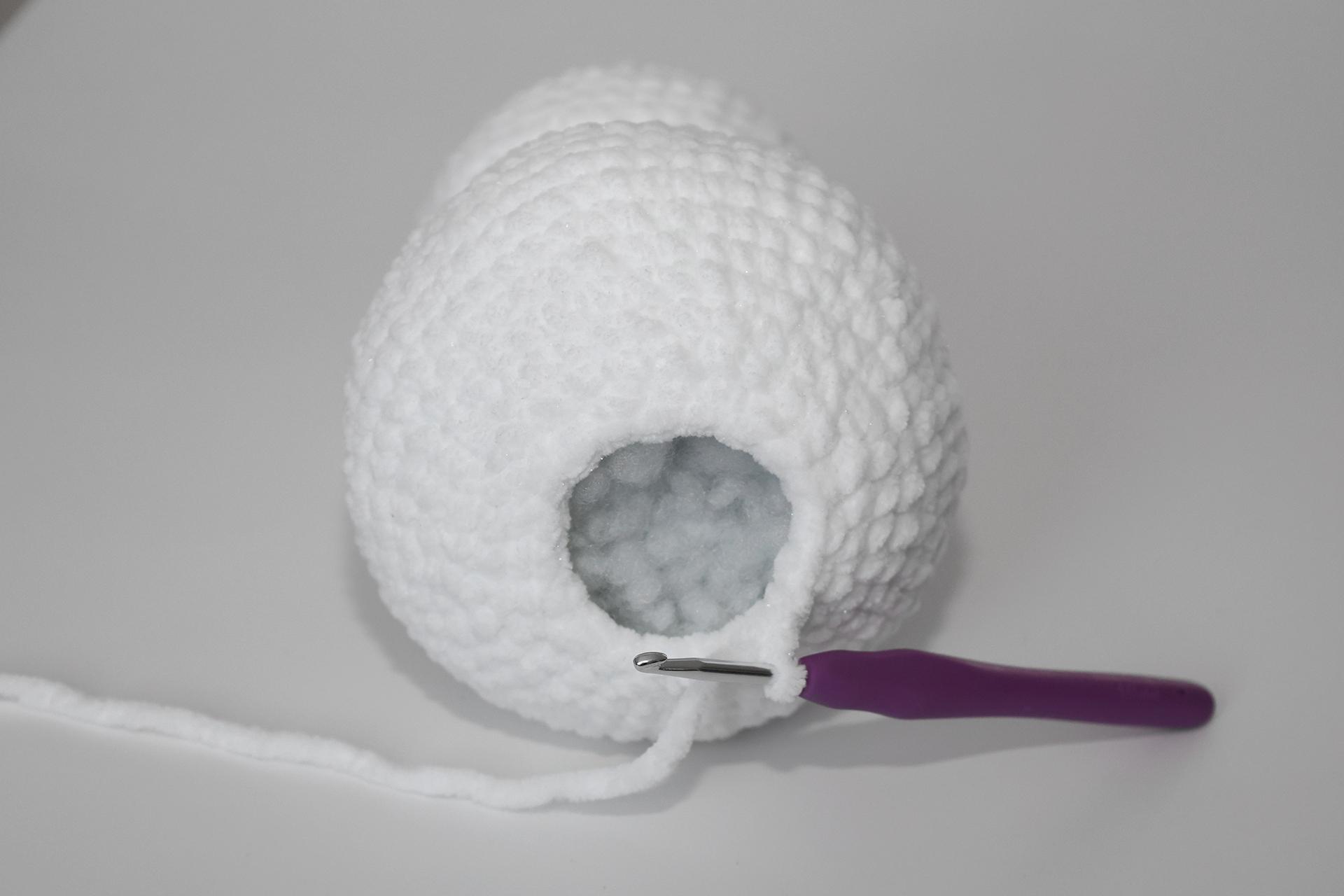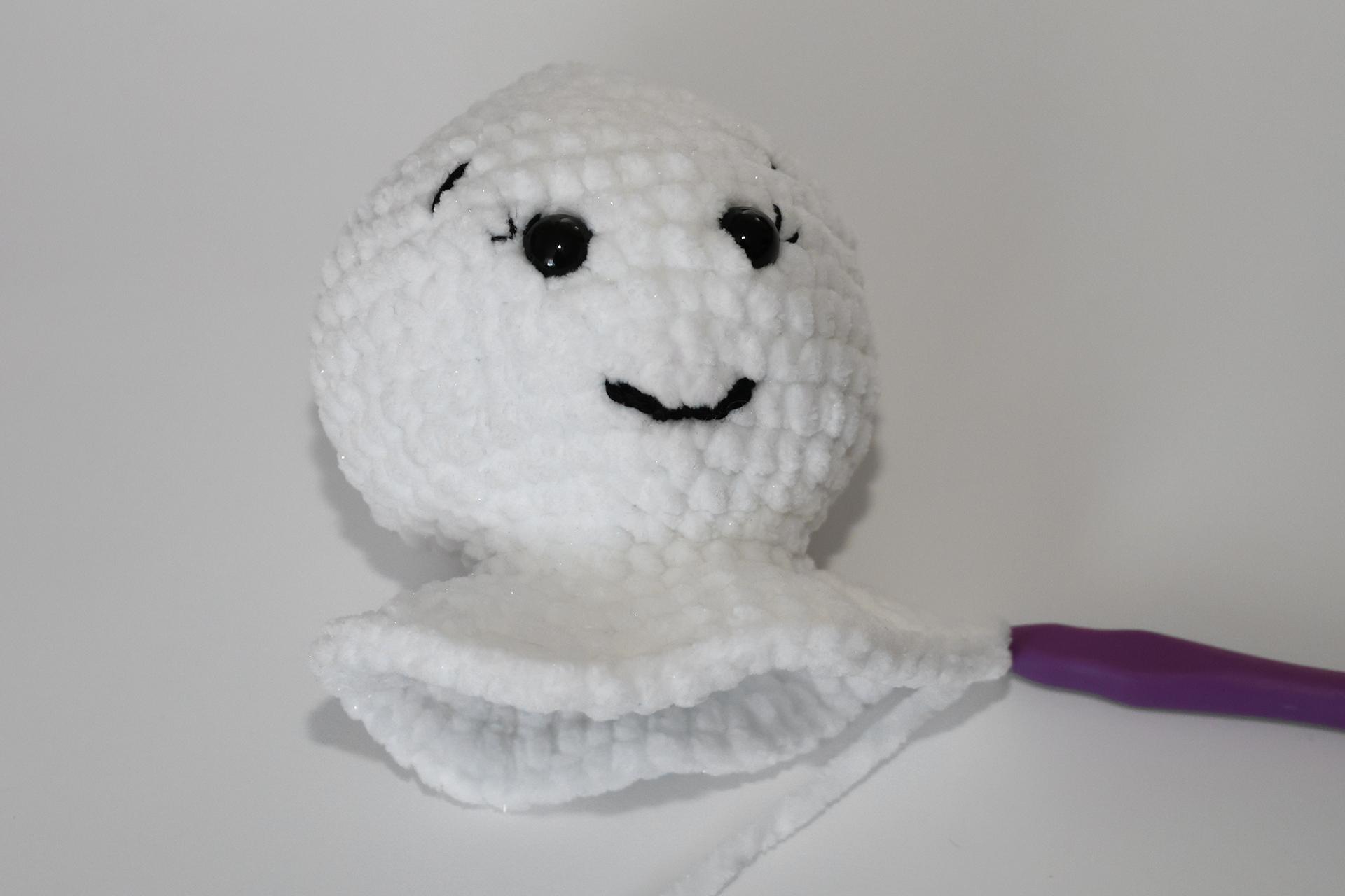 12. Háčkujeme rovno-24KS. Pripevníme oči medzi 9. a 10. radu-5 ok od seba. Vyšijeme obočie a pusu. Vyplníme.