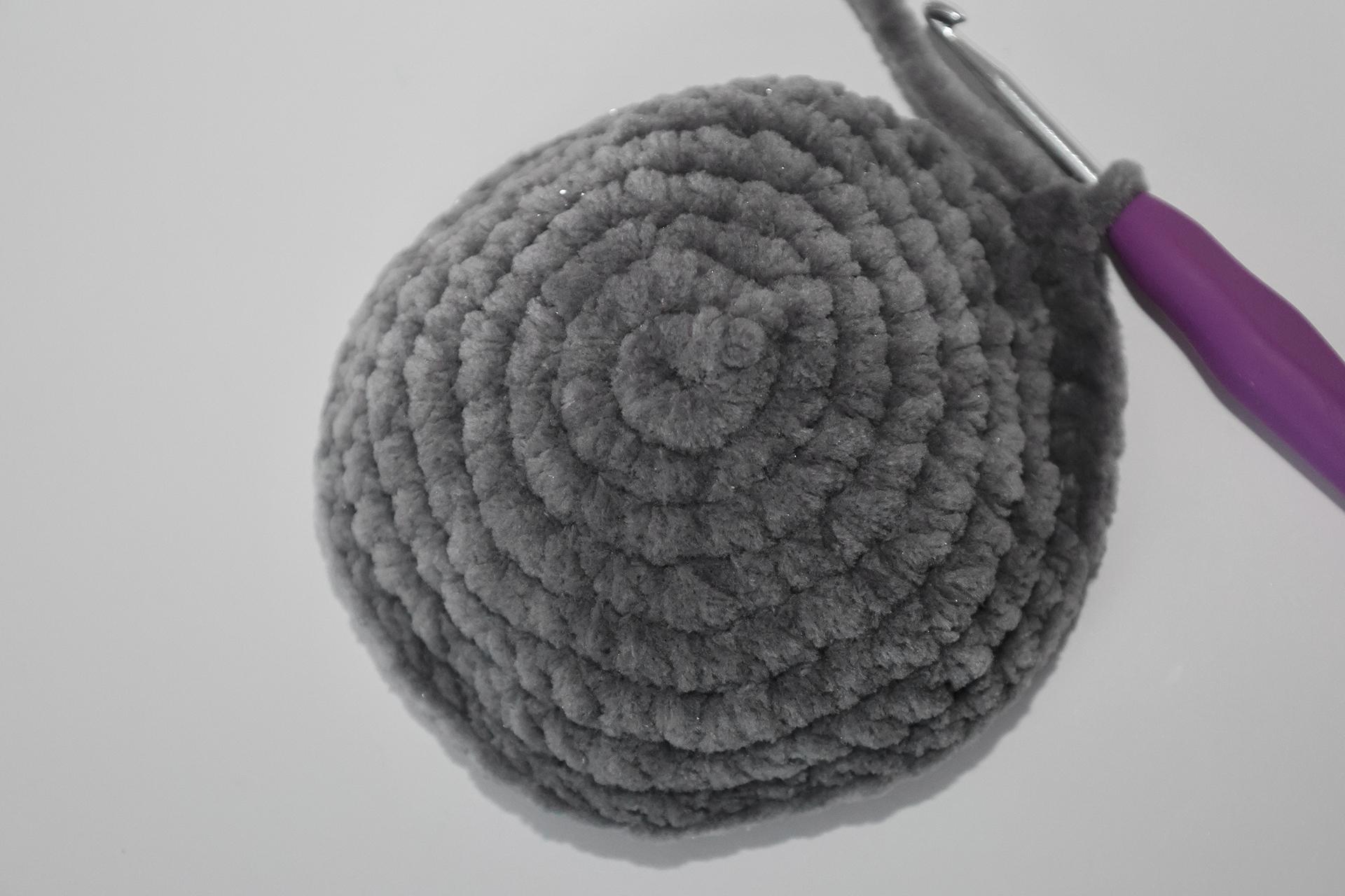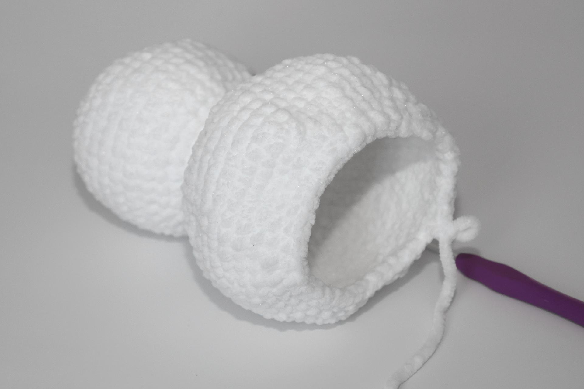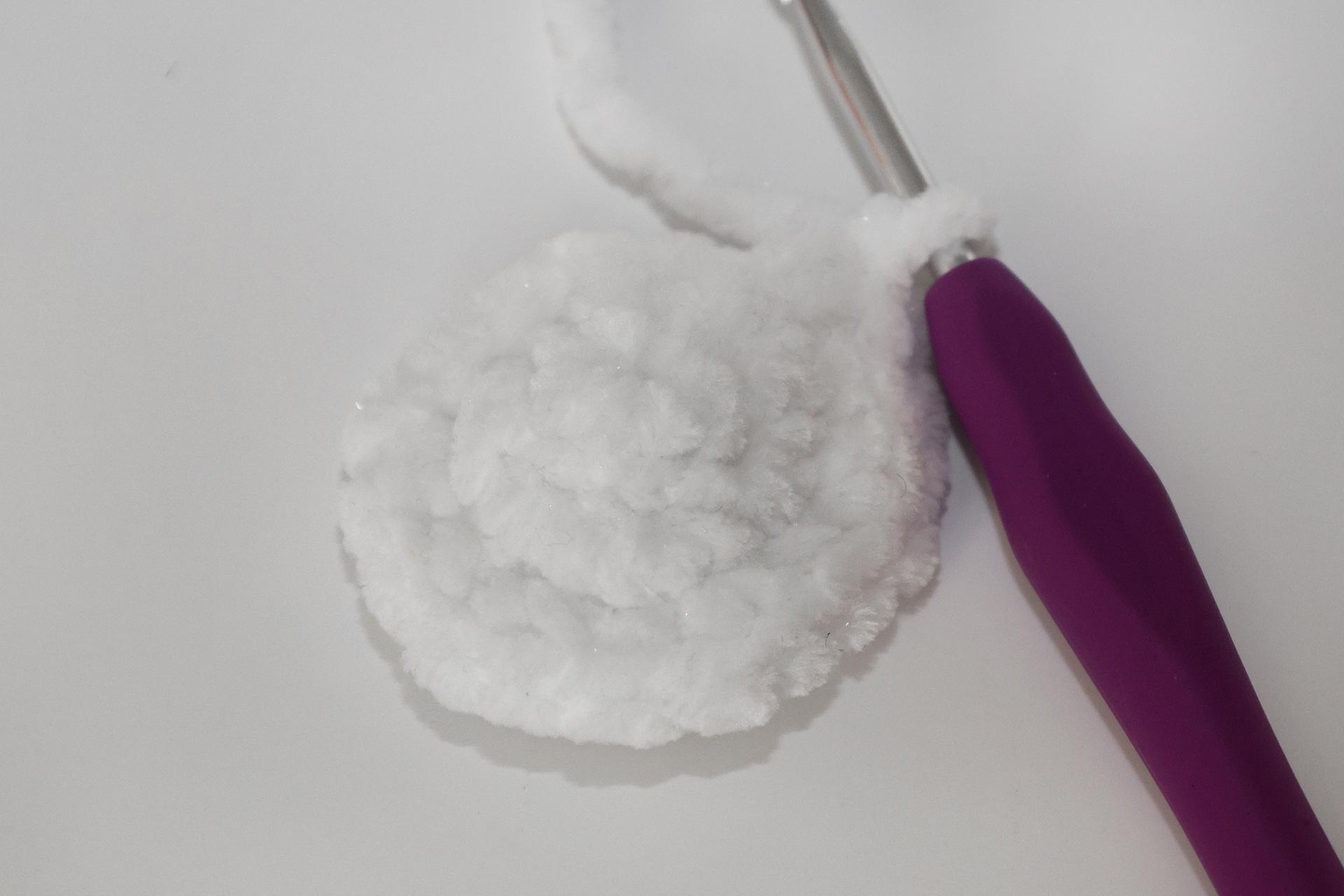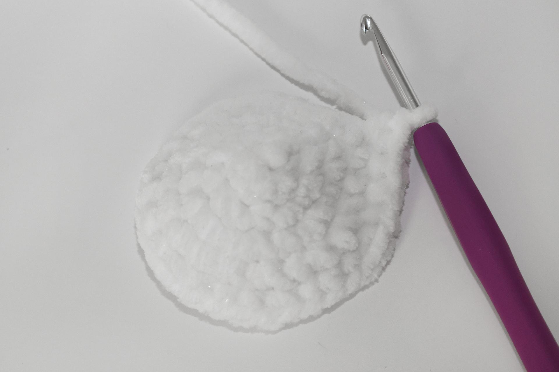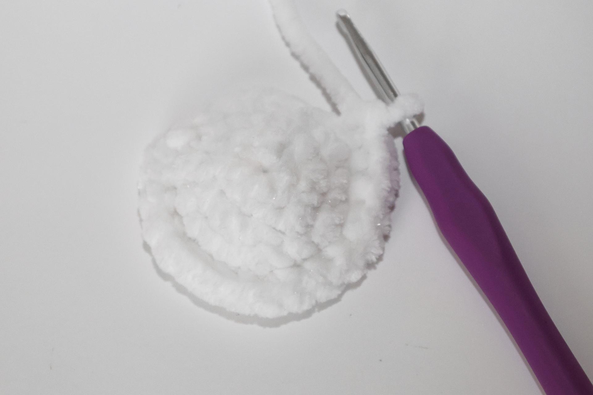 12. Háčkujeme rovno-24KS. Pripevníme oči medzi 9. a 10. radu-5 ok od seba. Vyšijeme obočie a pusu. Vyplníme.