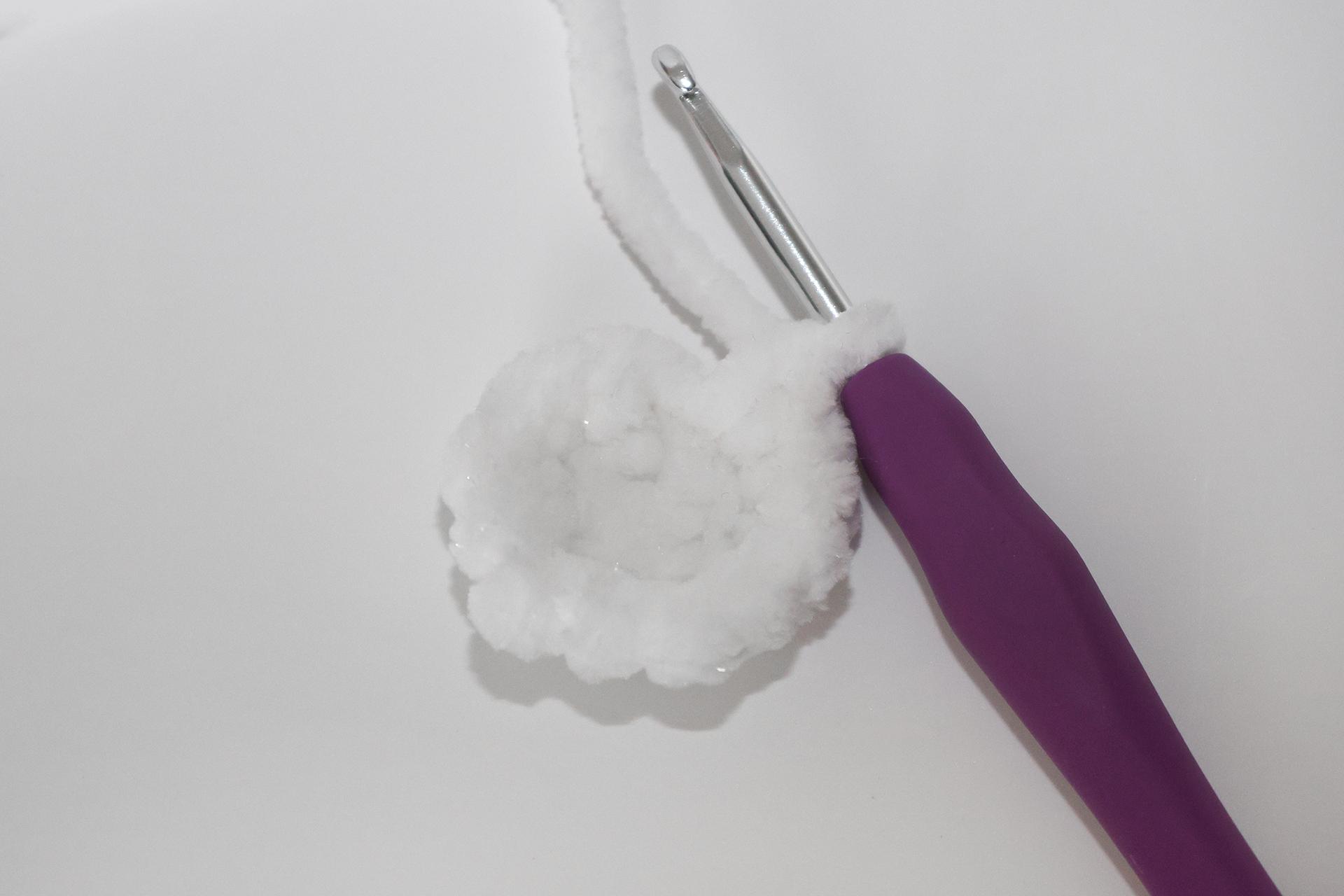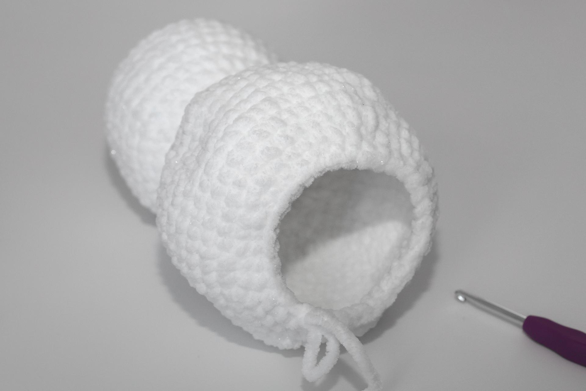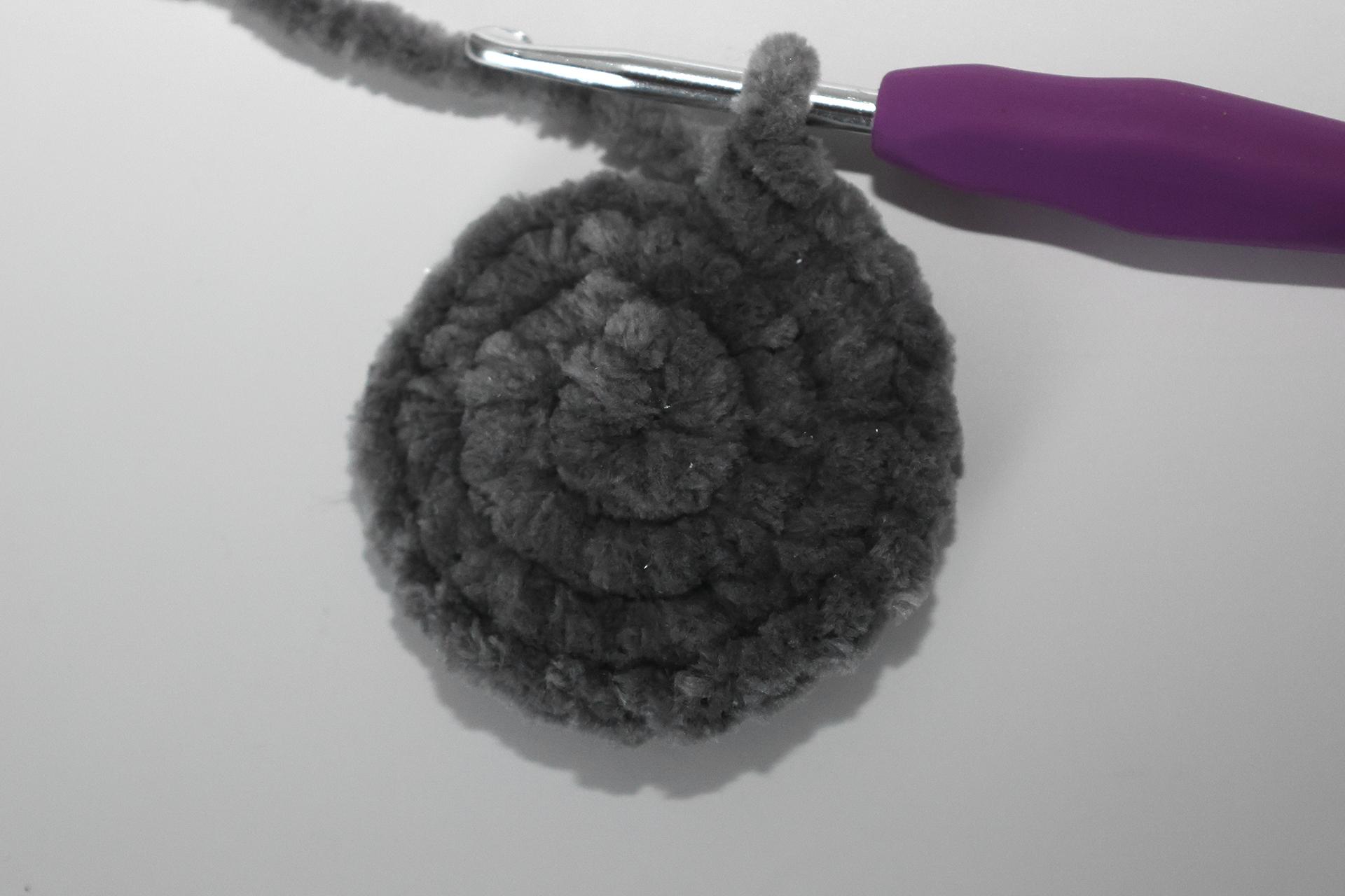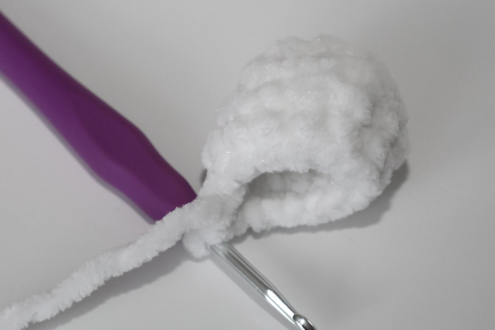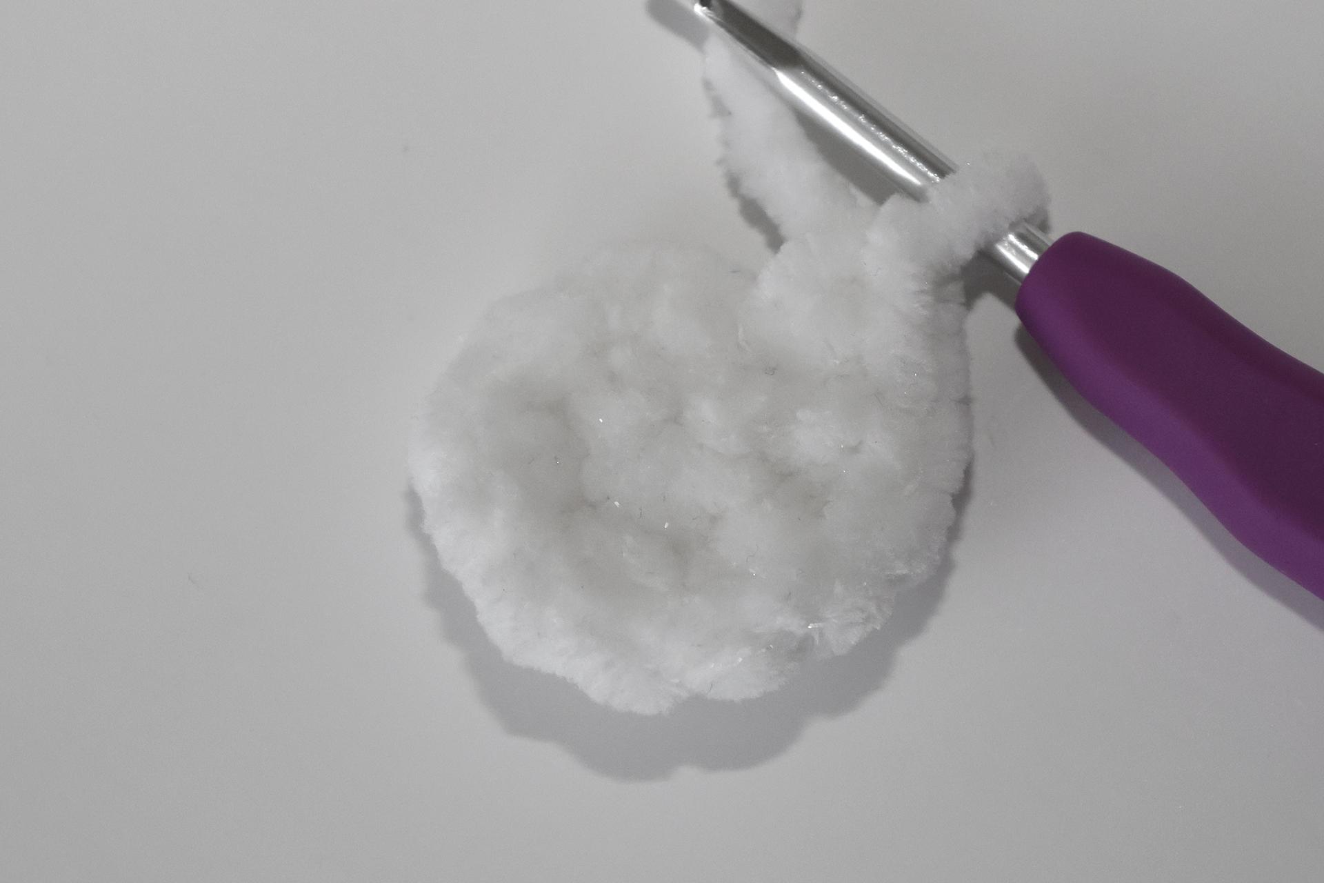 12. Háčkujeme rovno-24KS. Pripevníme oči medzi 9. a 10. radu-5 ok od seba. Vyšijeme obočie a pusu. Vyplníme.