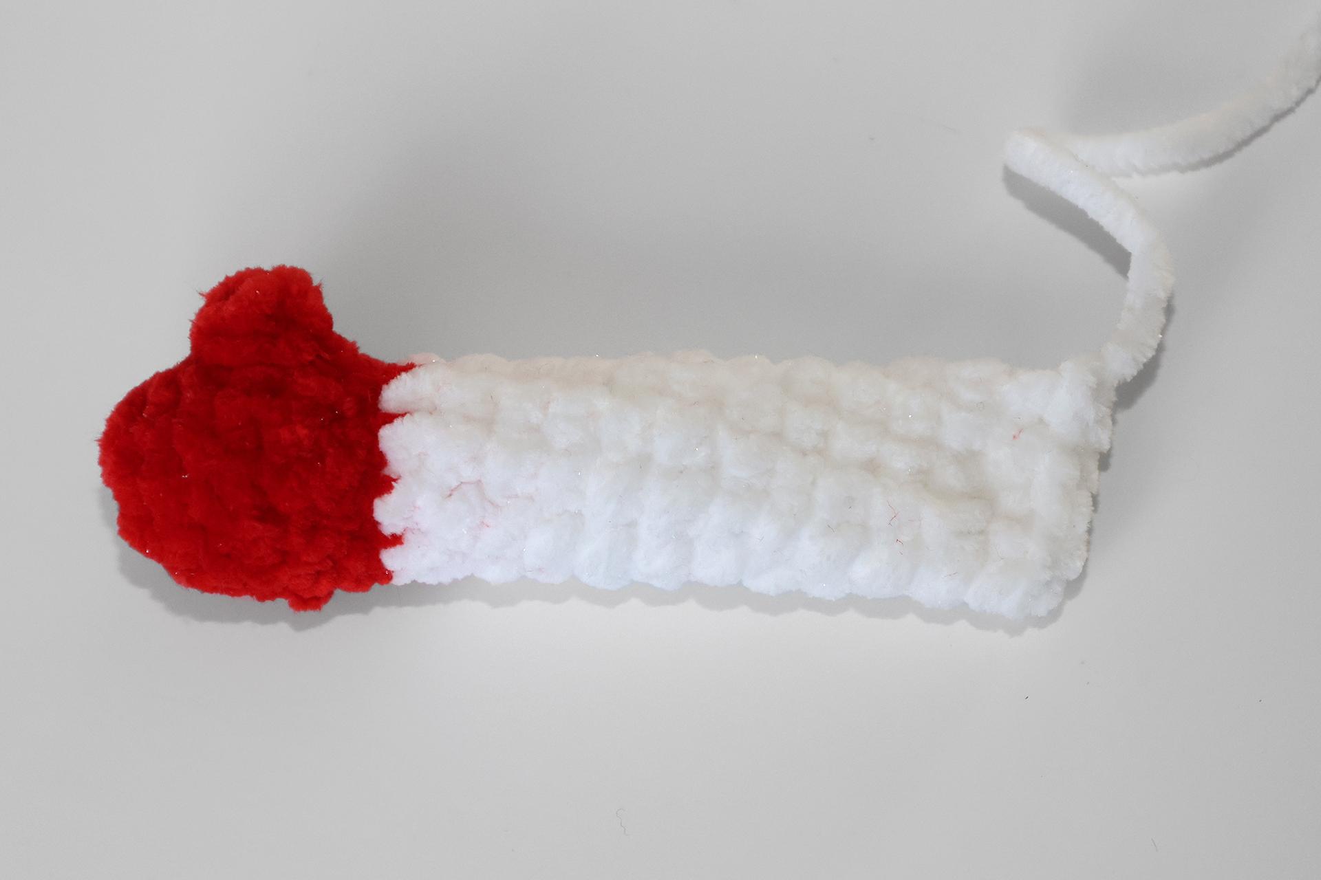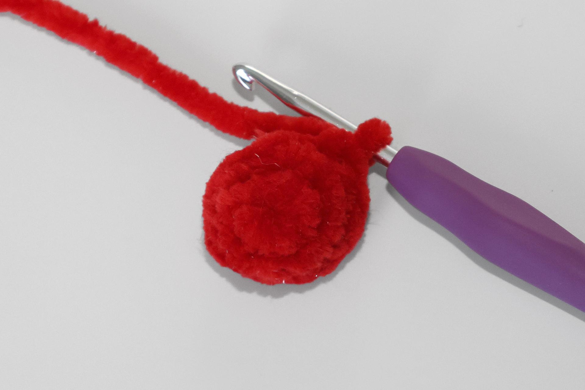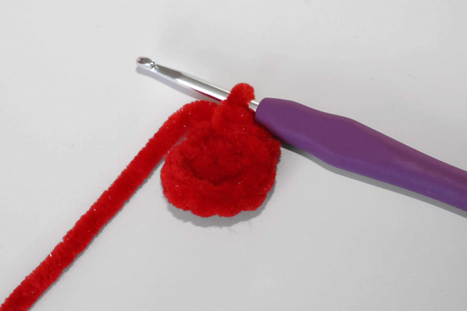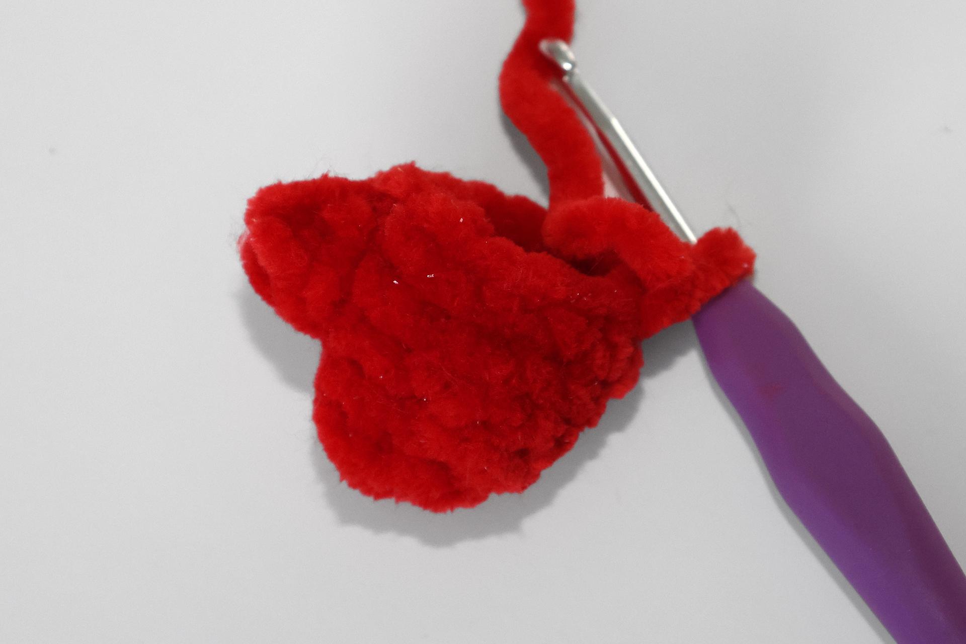 50. Naviažeme červenú priadzu a budeme striedavo háčkovať PRKS a ZRKS. Takto uháčkujeme 3 rady, ukončíme a priadzu zapošijeme.