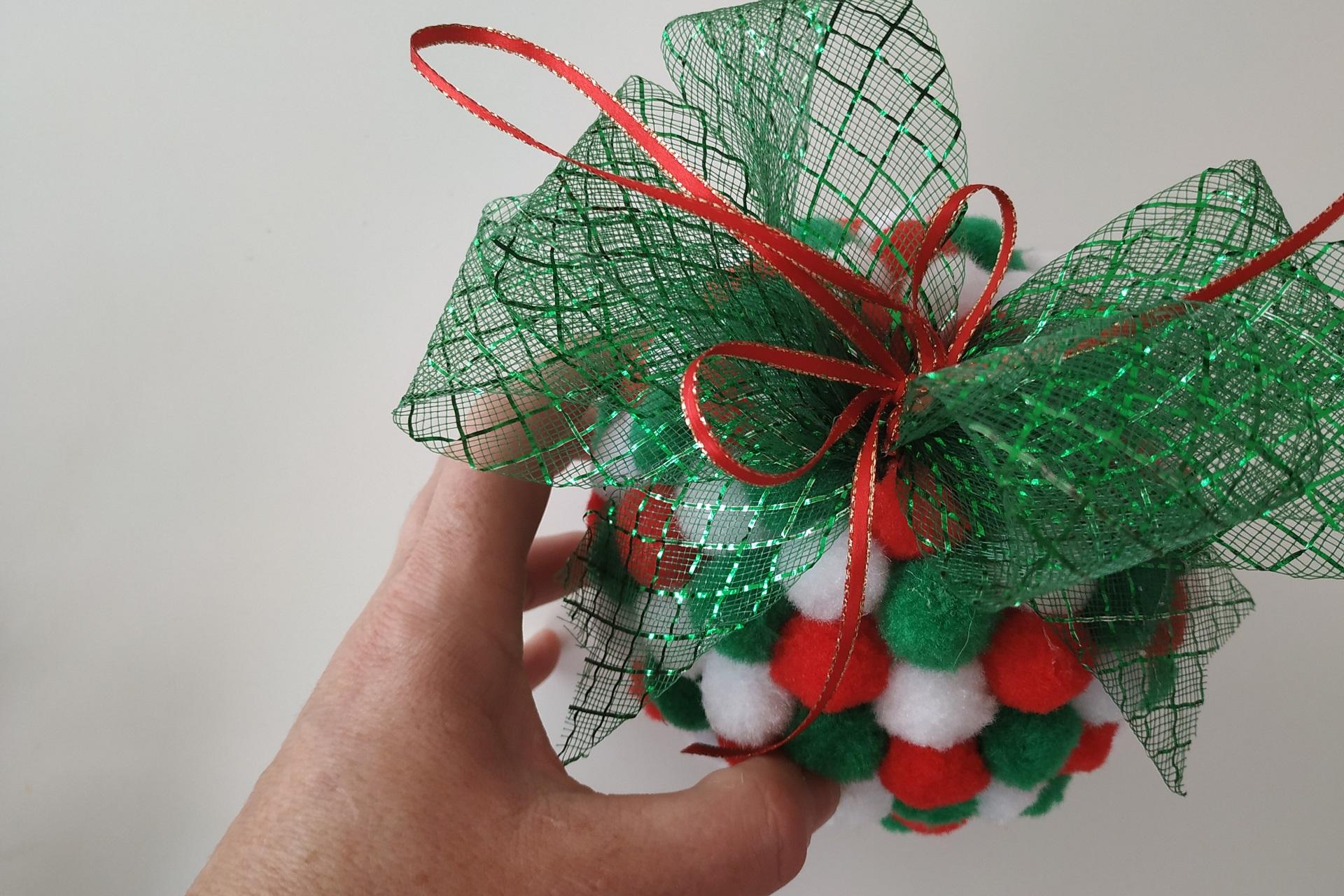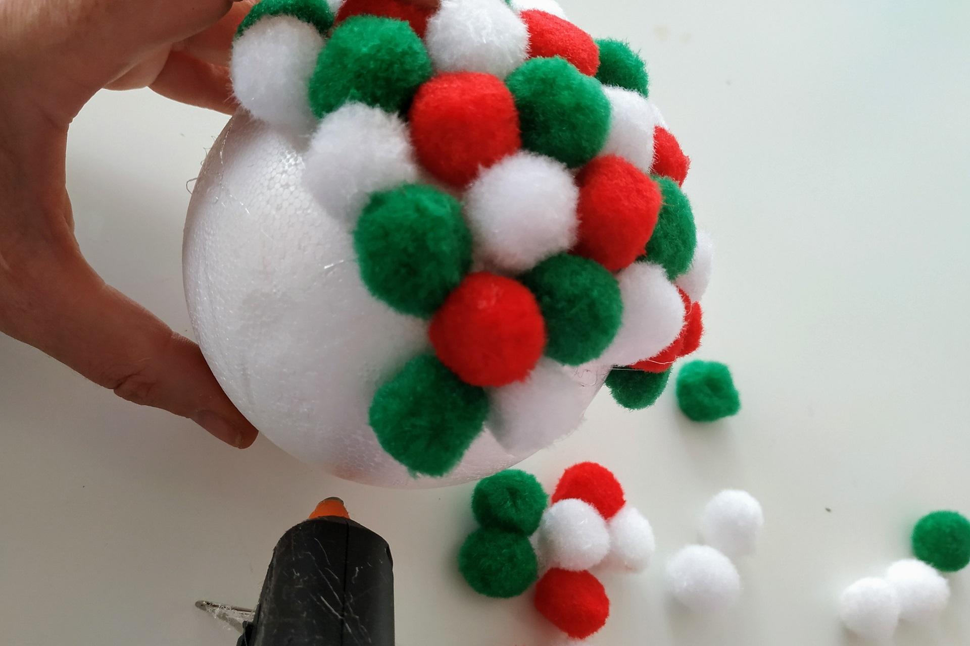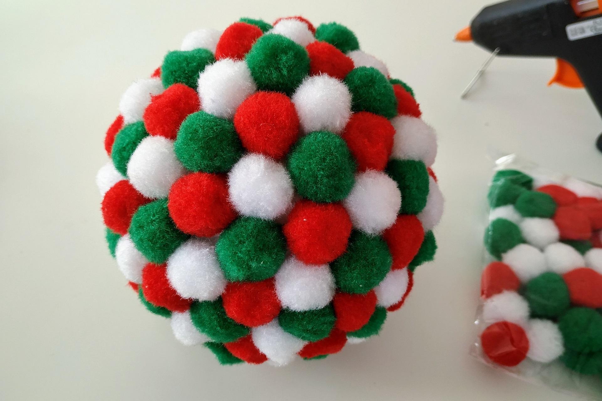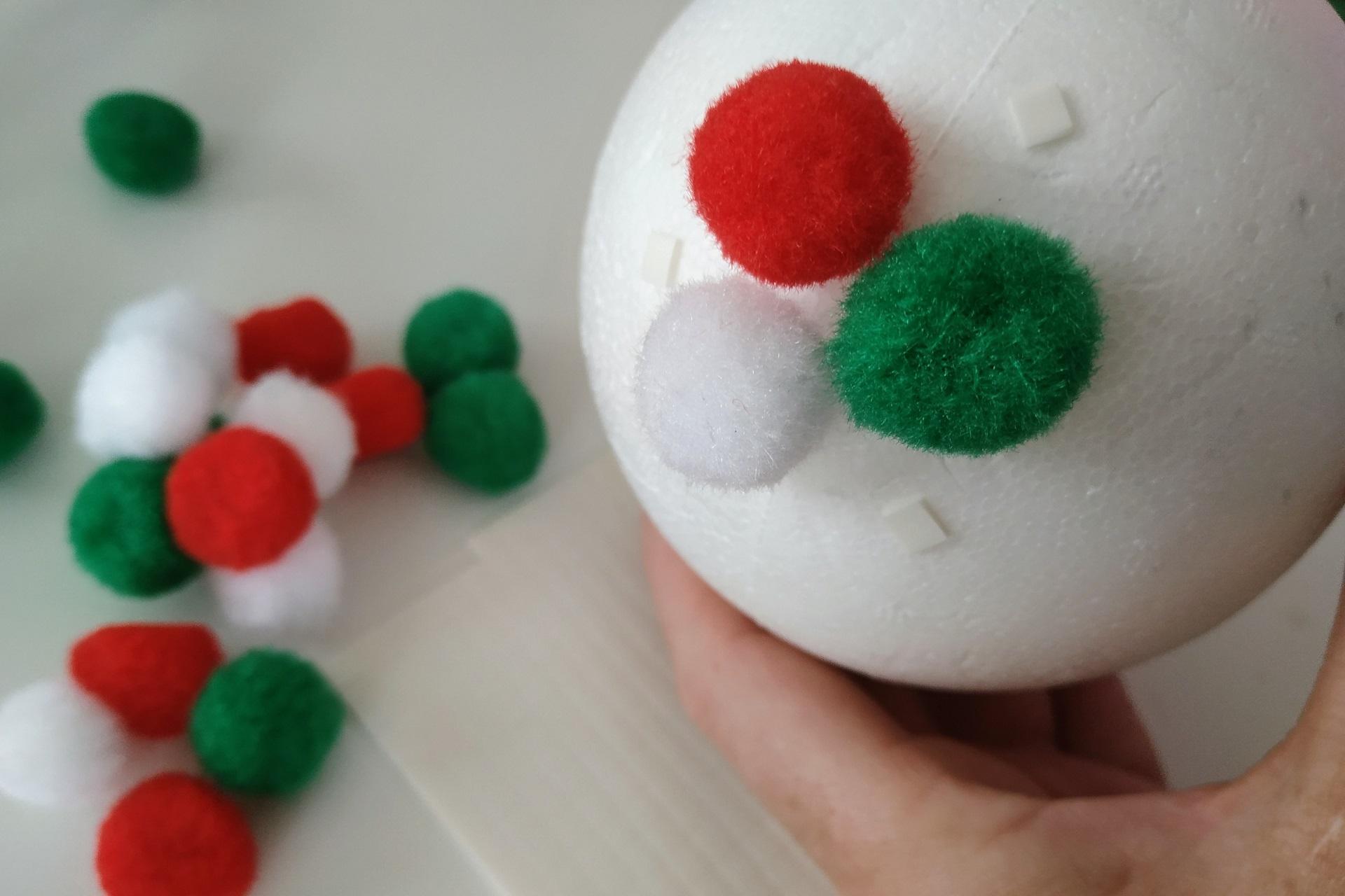 Vytvorte si hravú vianočnú banku z červených, zelených a bielych bambuliek, ktoré premenia obyčajnú polystyrénovú guľu na žiarivú ozdobu. Stačí pár minút tvorenia a získate originálnu dekoráciu, ktorá dodá sviatočné kúzlo. Naviac je to skvelá aktivita, do ktorej môžete zapojiť aj deti.