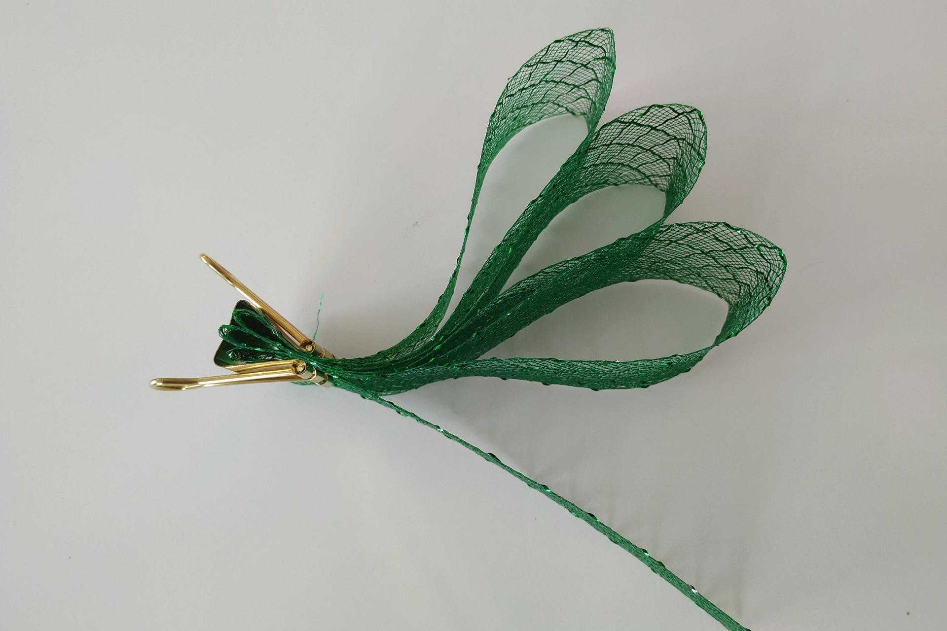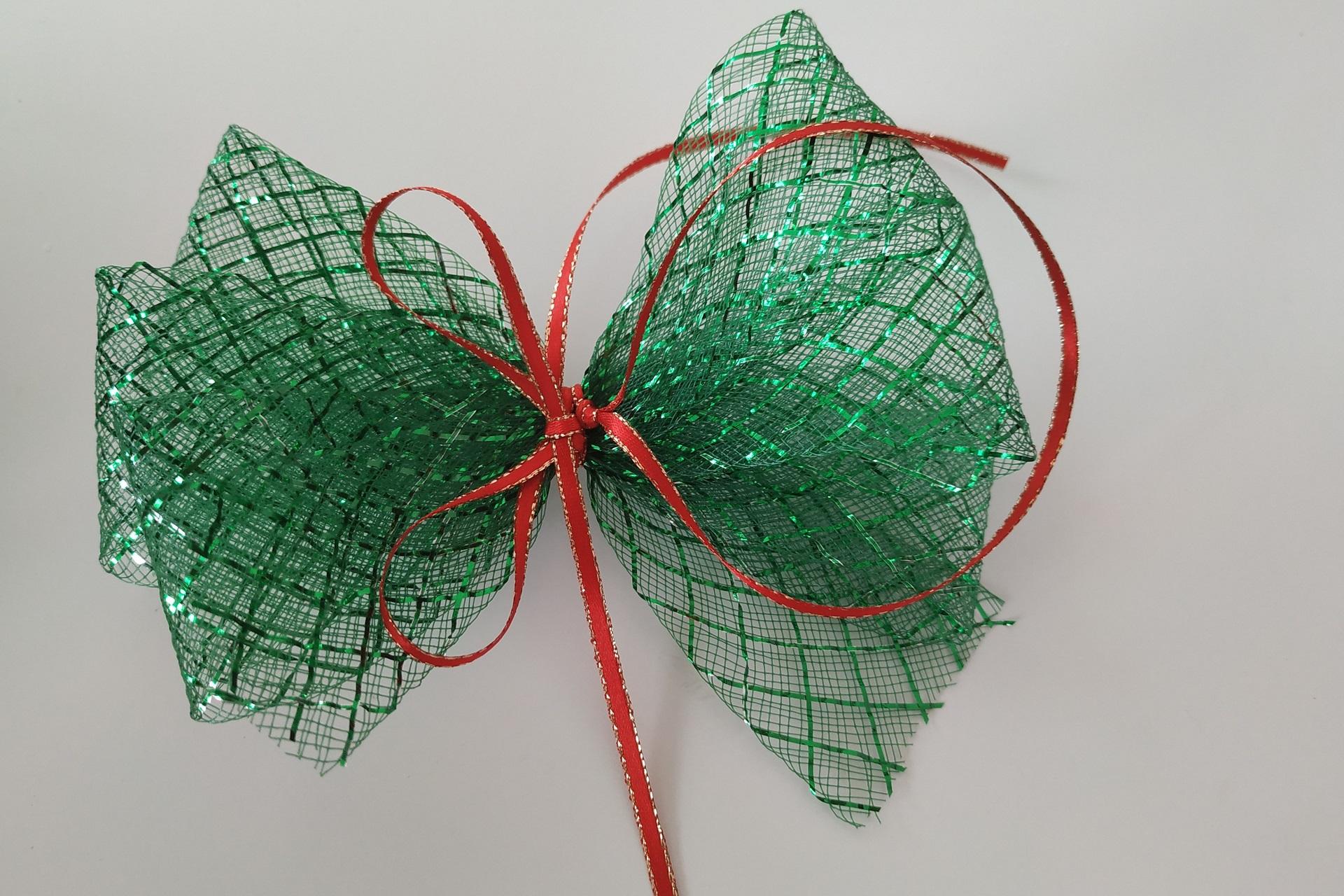 4. Na vrchol gule si pripravíme ozdobu zo skladanej mašle. Poskladáme si 1 meter stuhy ako harmoniku v dĺžke 14 cm. Vzniknú nám tak na každej strane 3 sklady.