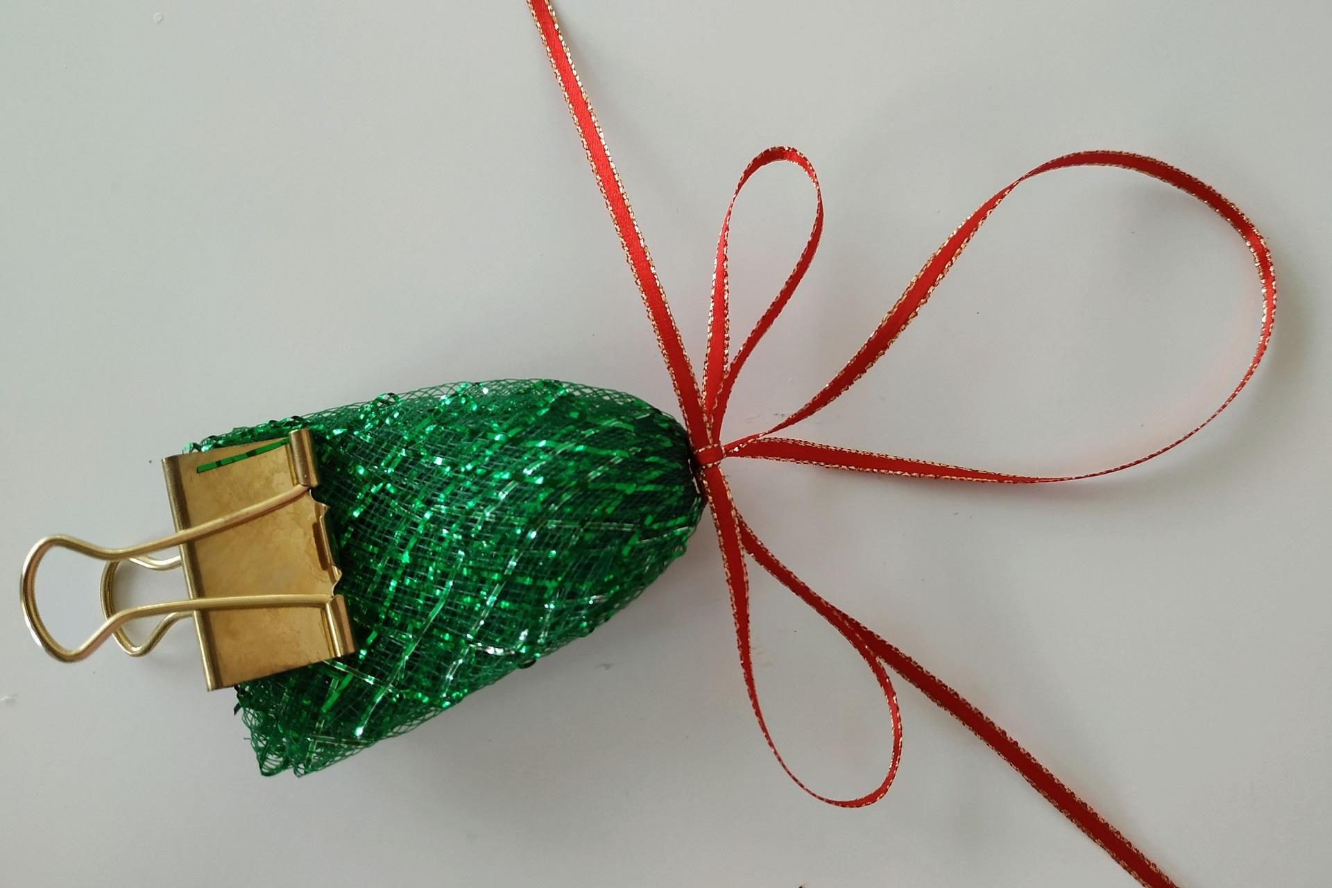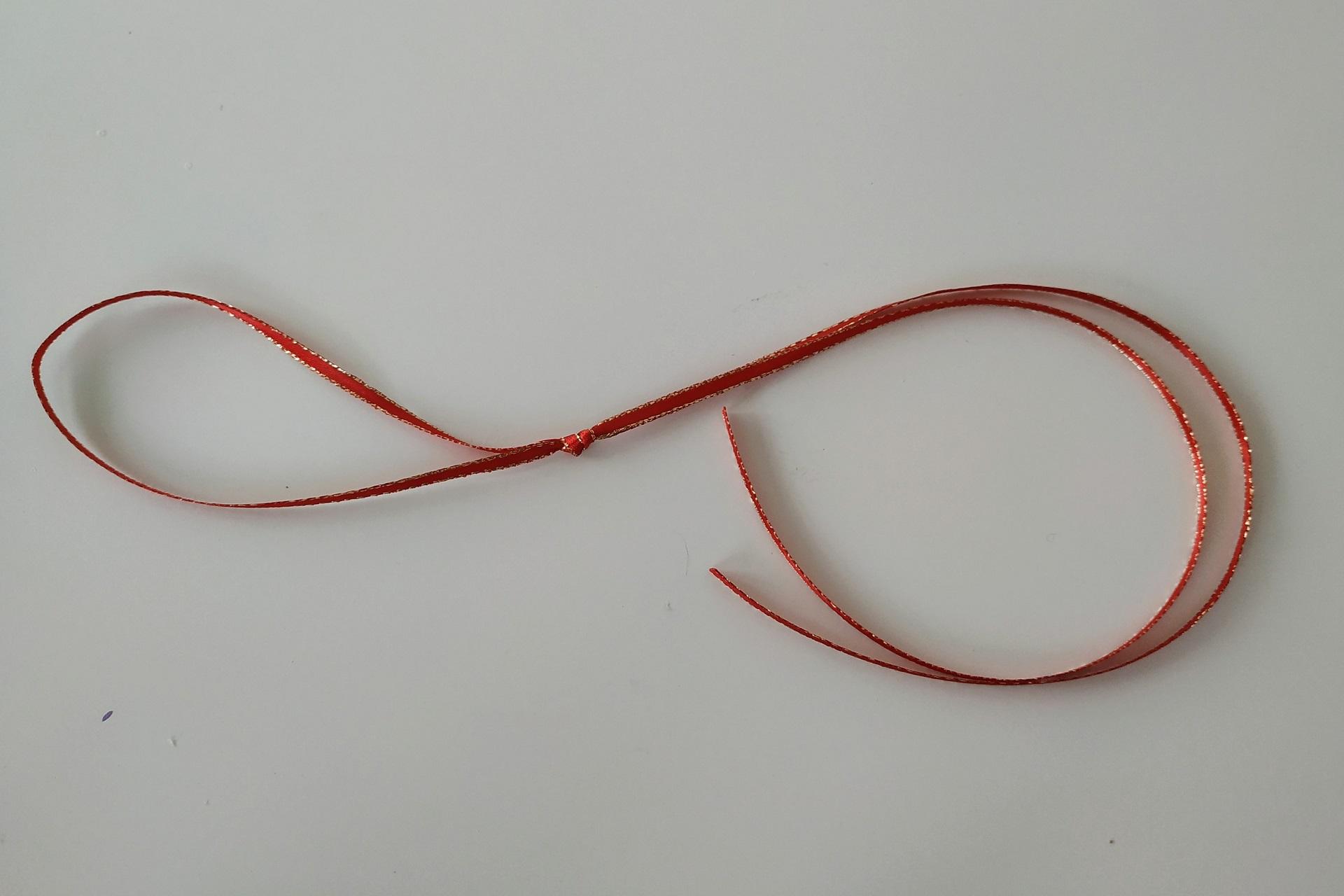 5. Na zviazanie širokej stuhy si prichystáme tenkú stužku, dlhú zhruba 80 cm. Prehneme ju v polovici a 15 cm od miesta prehybu urobíme uzlík. Vznikne nám tak očko, vďaka ktorému budeme môcť zavesiť vianočnú guľu.