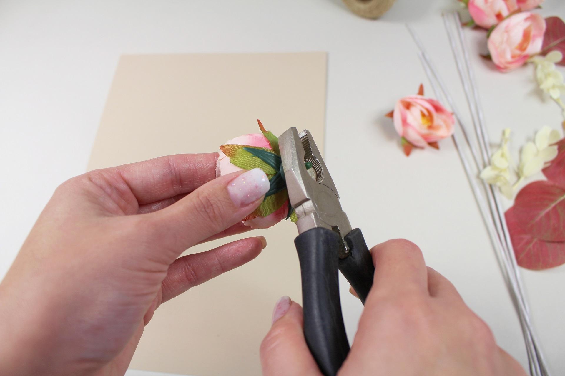1. Najskôr si pripravíme jednotlivé kvety a pomocou štiepacích klieští skrátime ich stonky na požadovanú dĺžku.