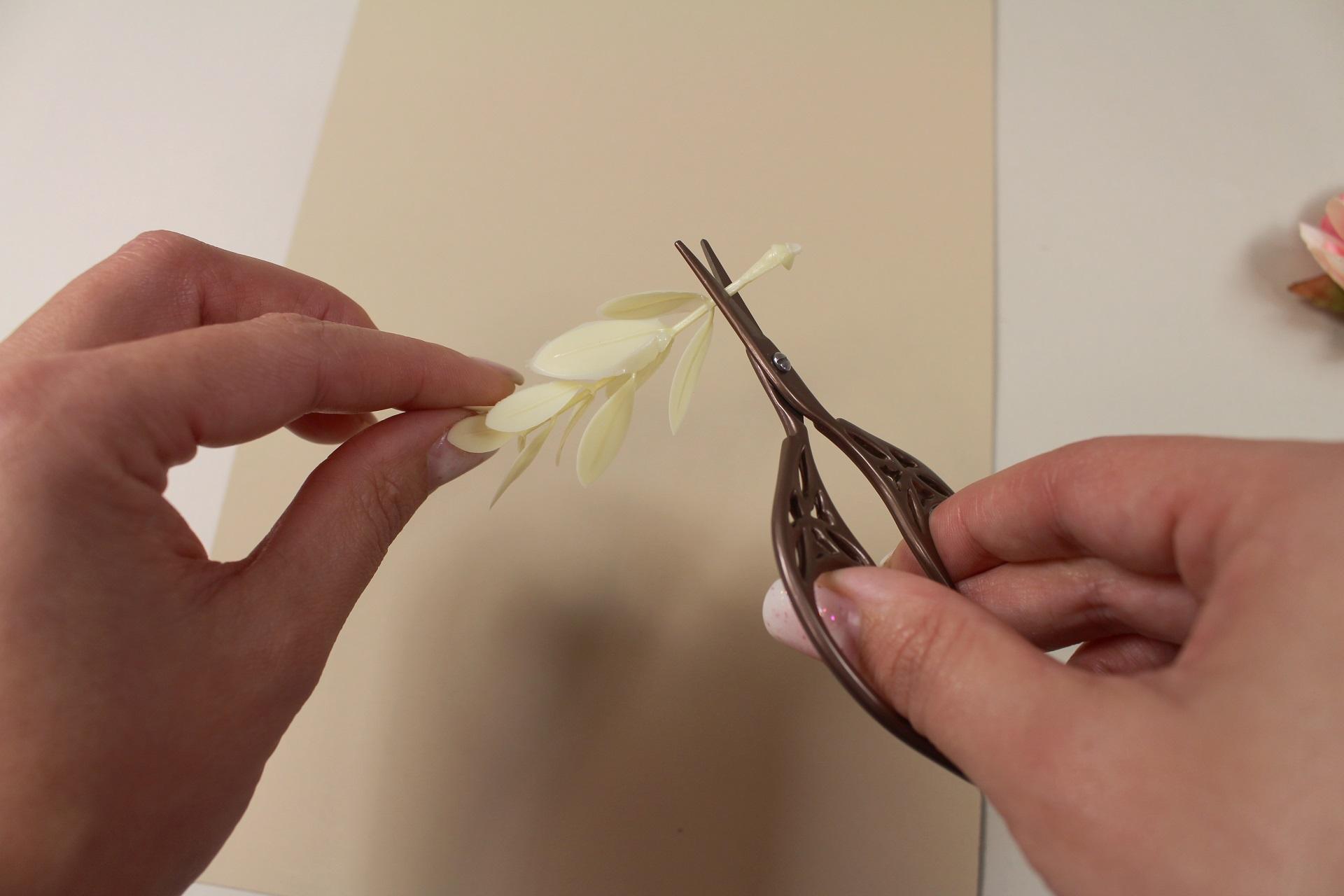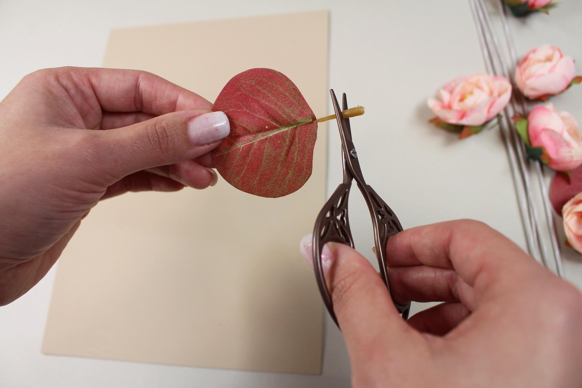 3. Z dekoratívnych listov odstrihneme časť stopky tak, aby nám zostala len plochá časť na nalepenie.