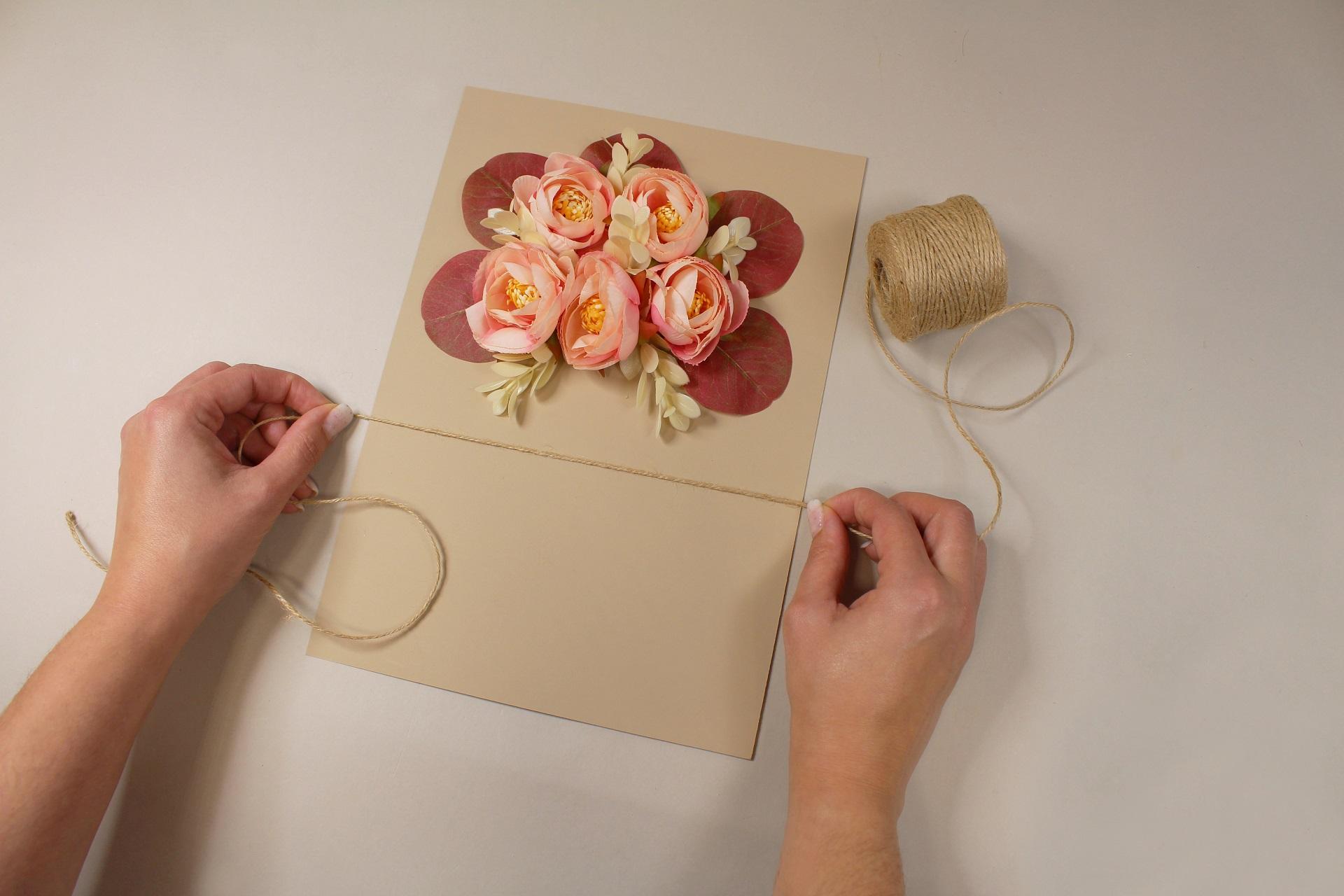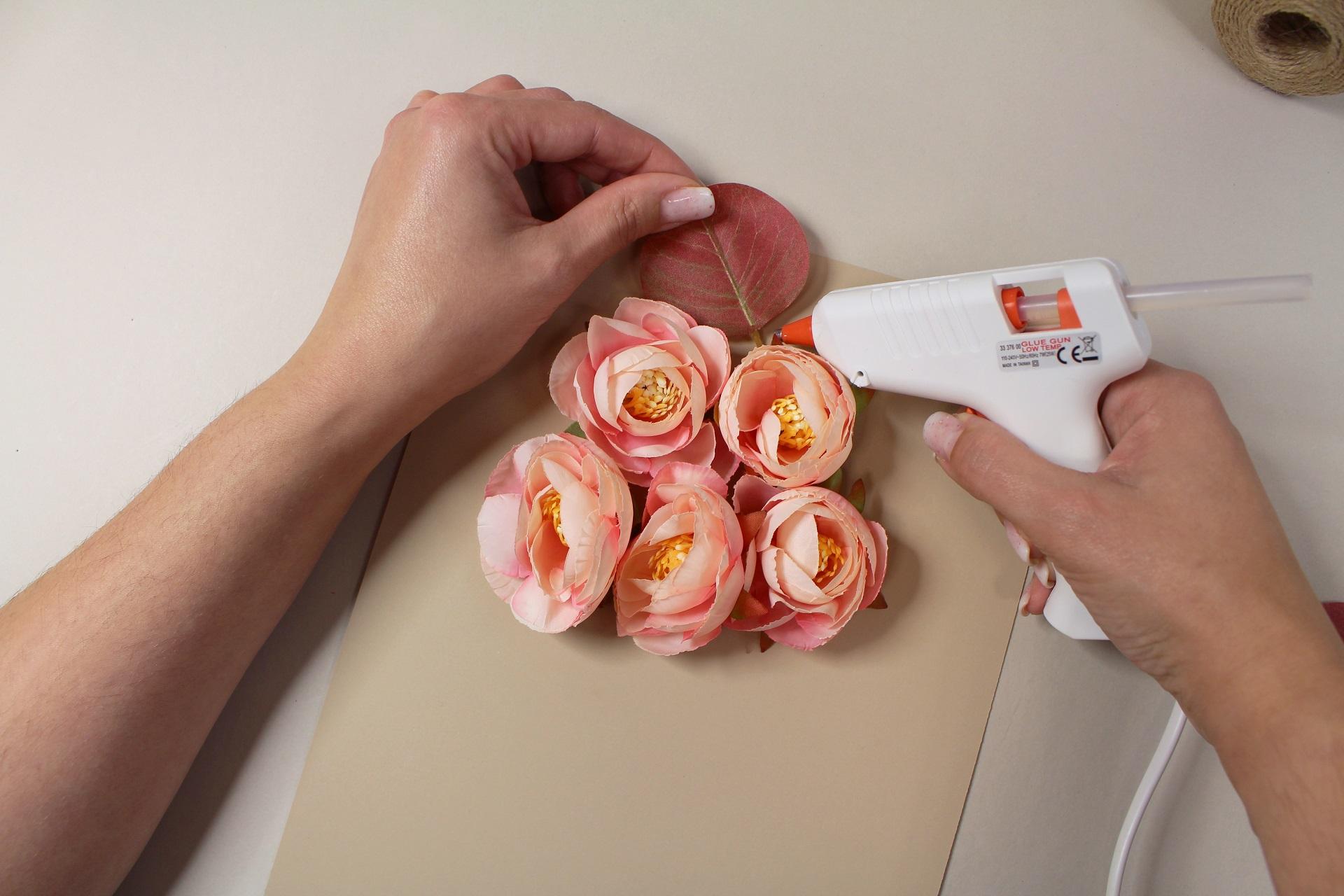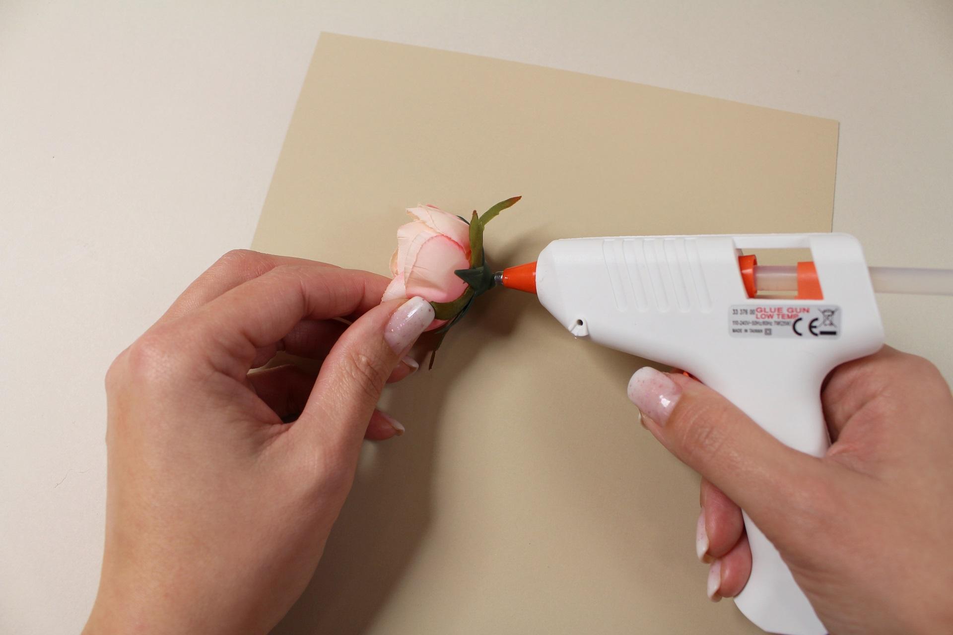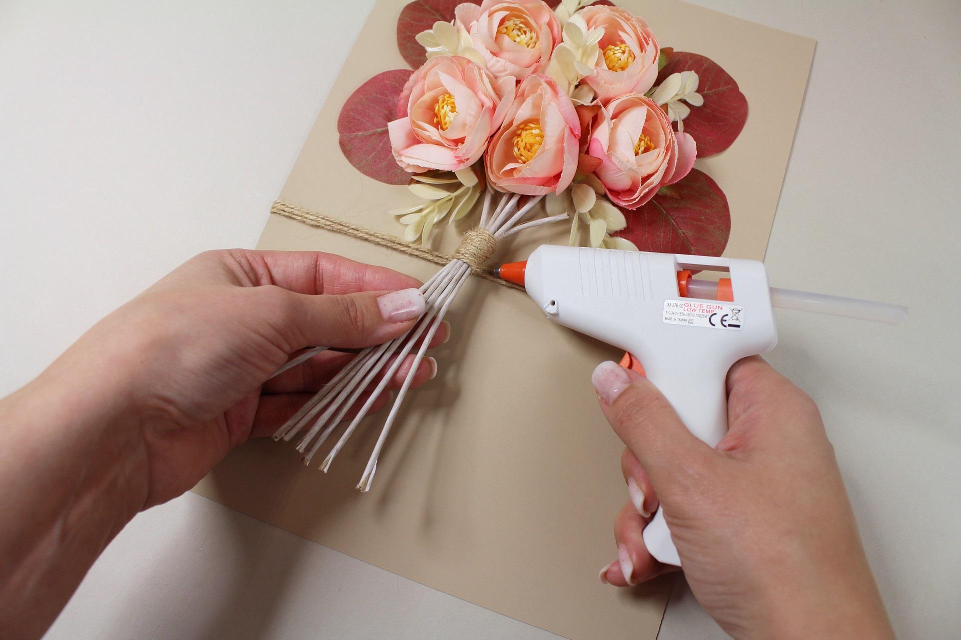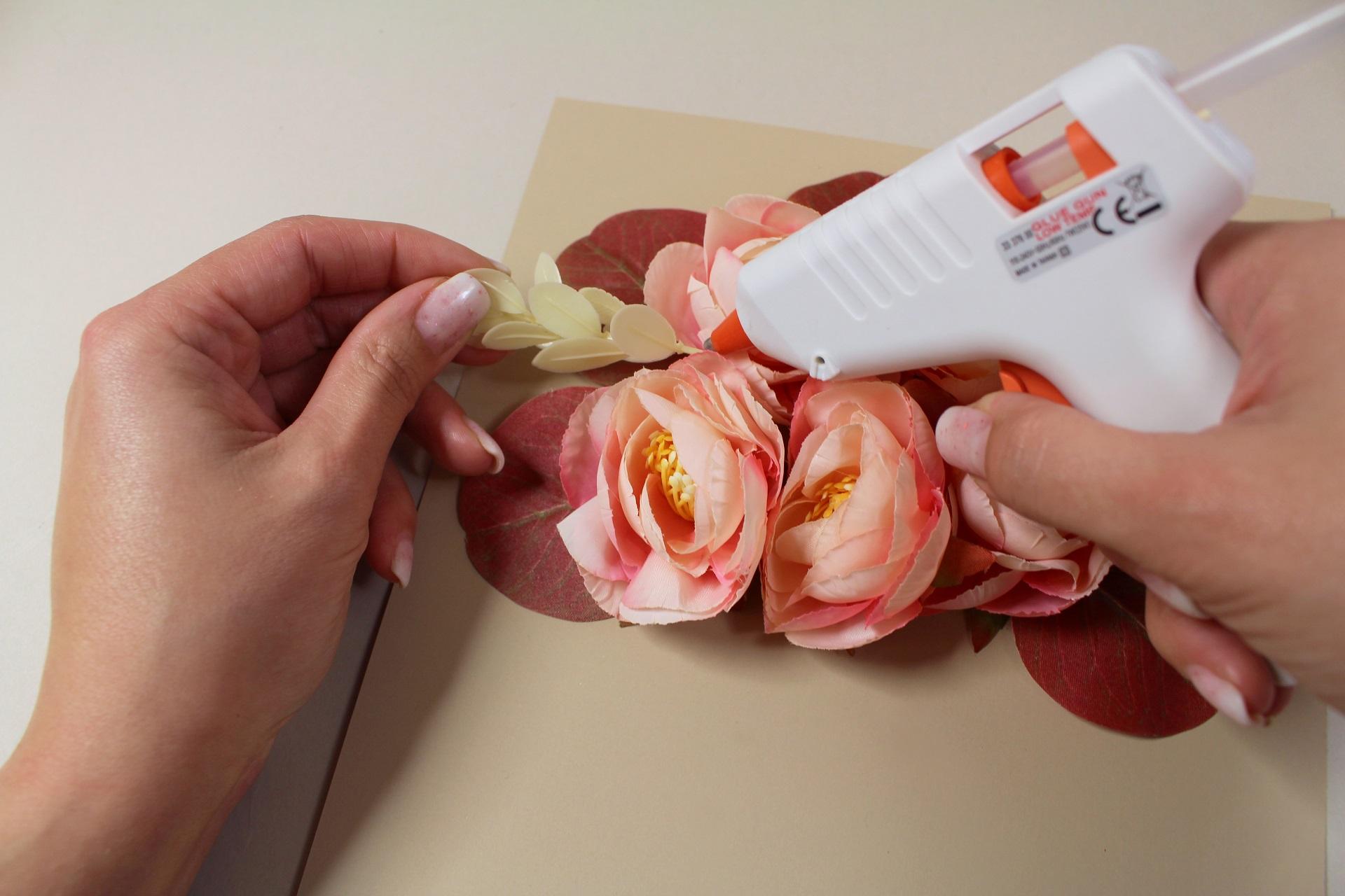 4. Na zadnú stranu prvého kvetu nanesieme tavné lepidlo a prilepíme ho na prednú stranu vopred pripraveného priania.