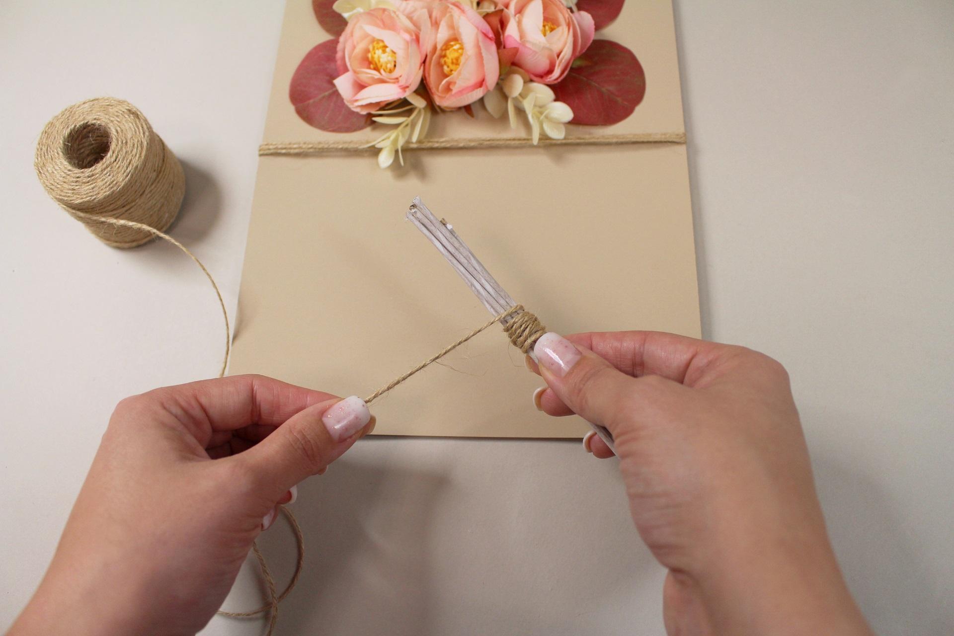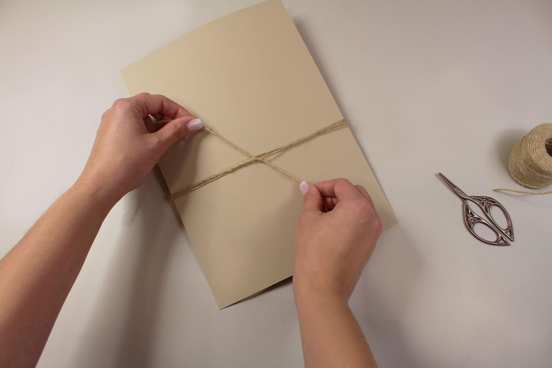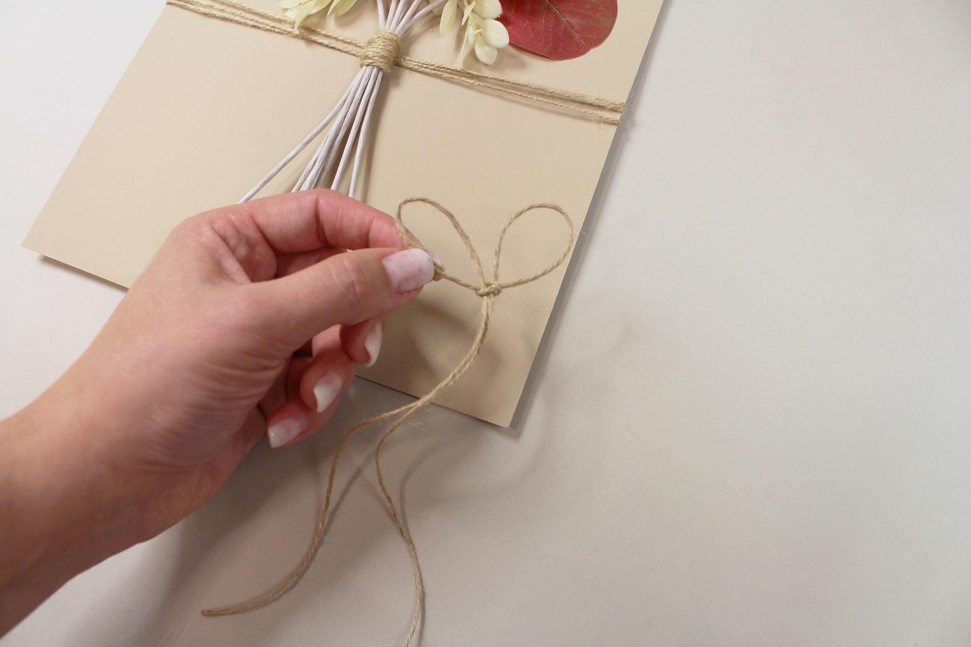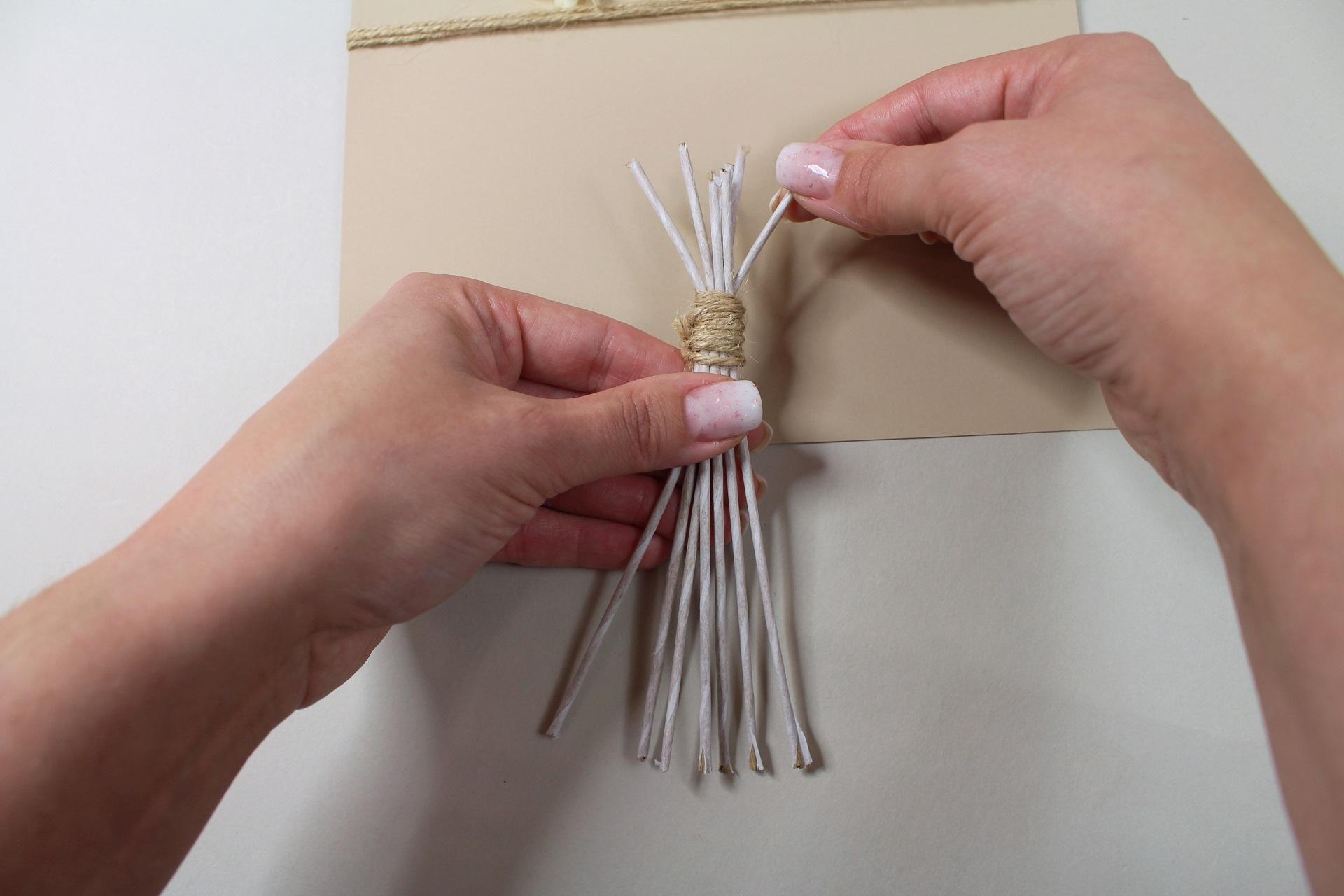 8. Povrázok na zadnej strane zauzlujeme alebo zaistíme tak, aby pevne držal. Prebytočný povrázok odstrihneme.
