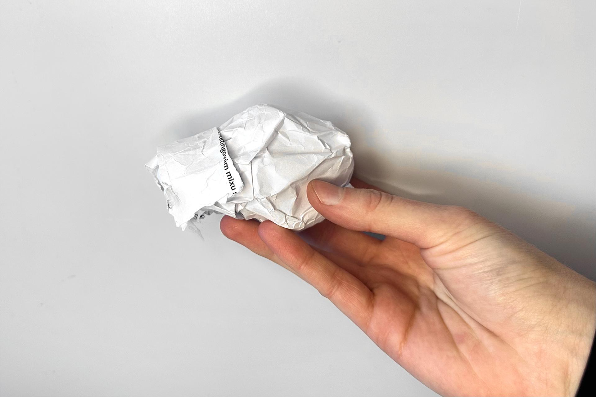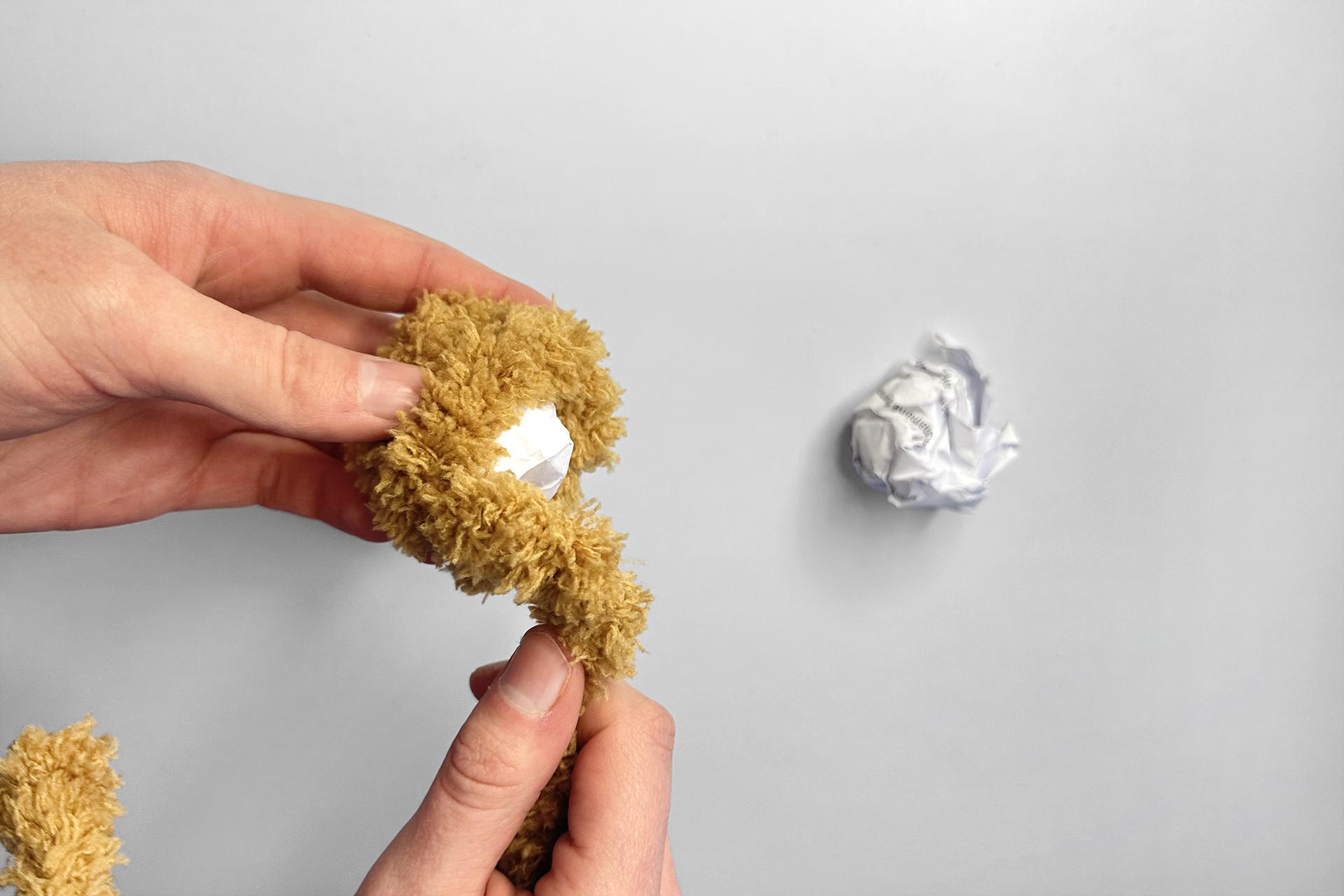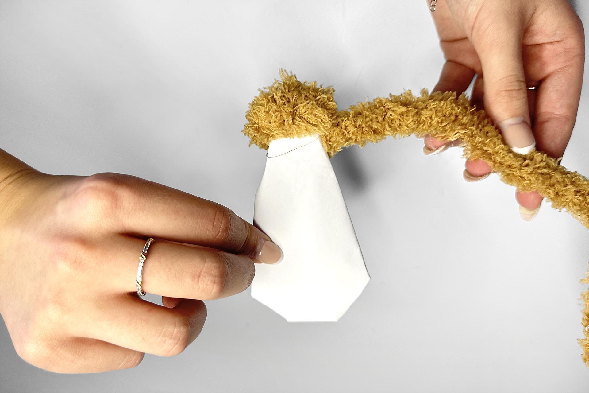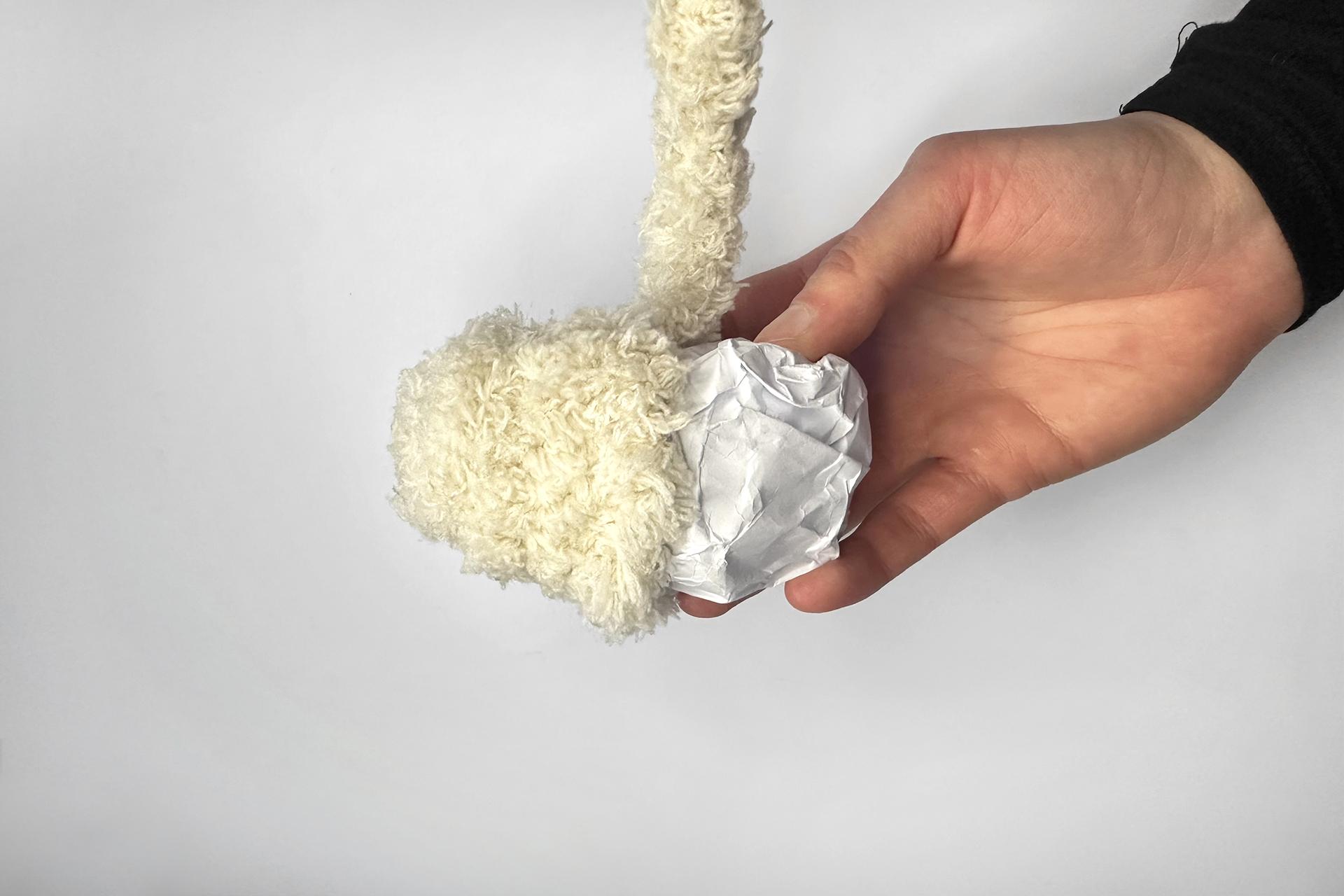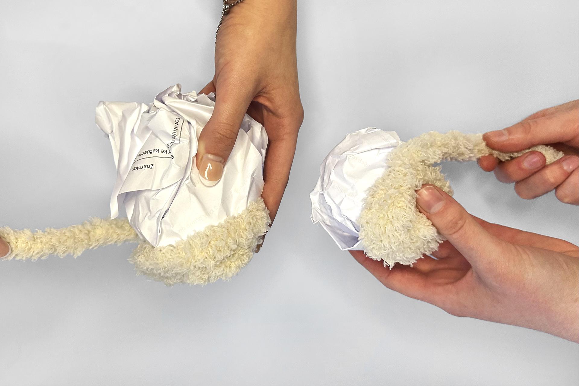 2. Začneme telom. Vezmeme chlpaté drôtiky a obtáčame nimi postláčaný papier, aby vzniklo pevnejšie telo psíka.