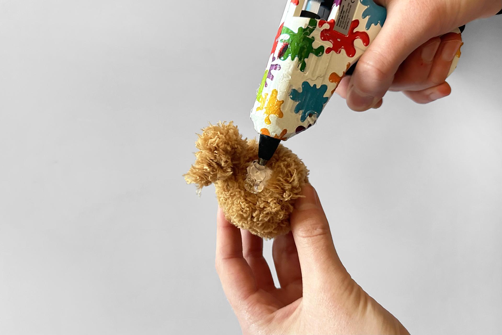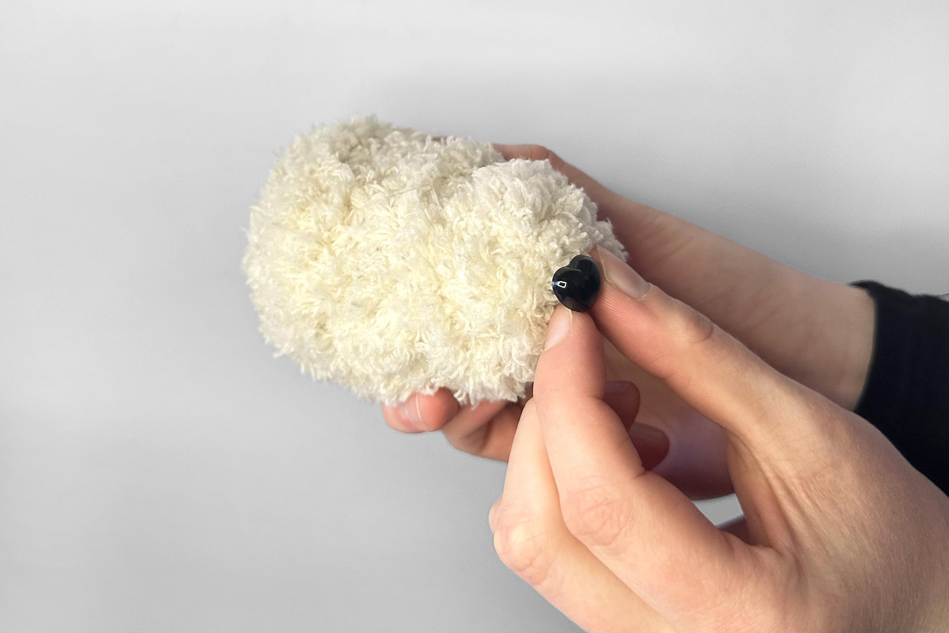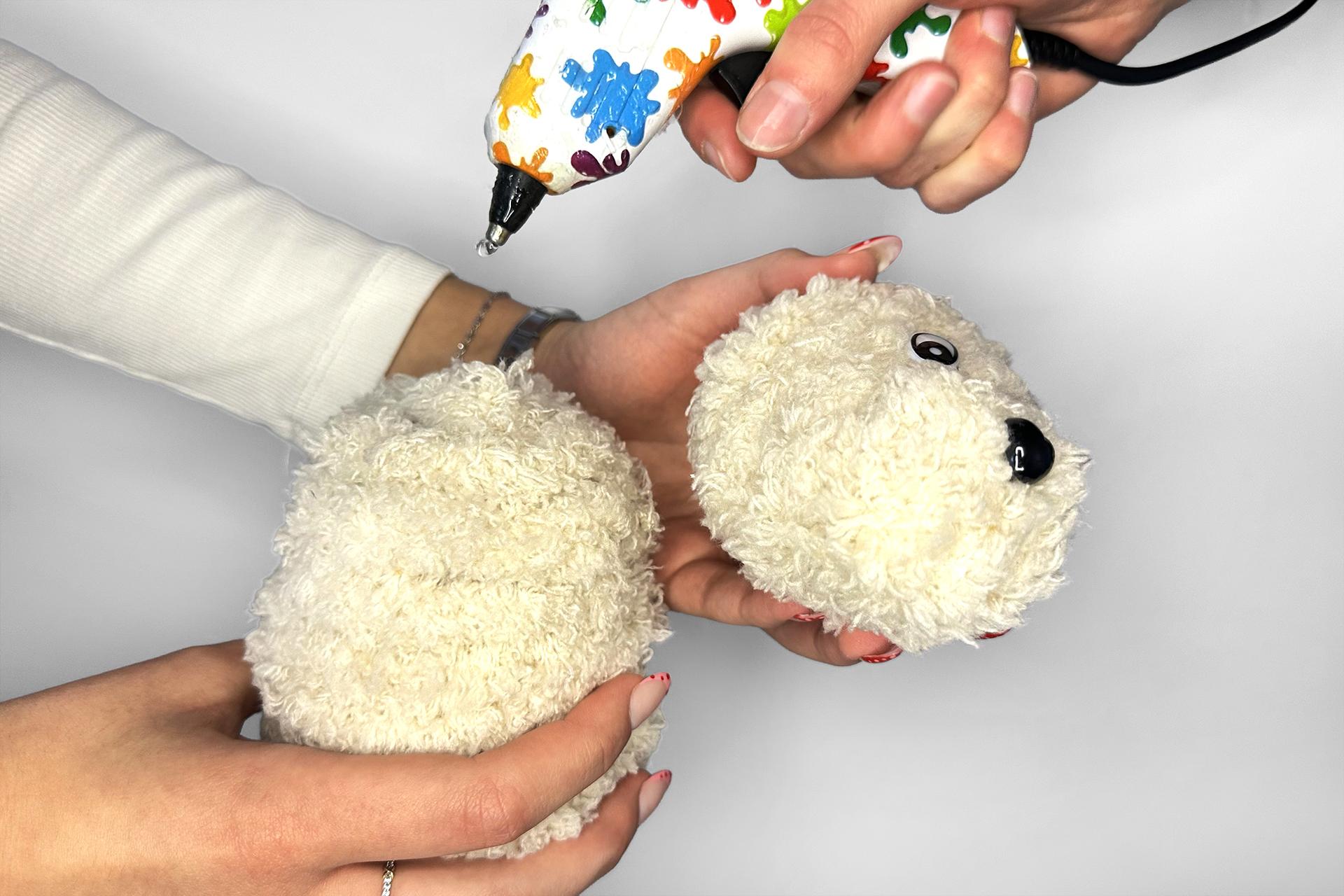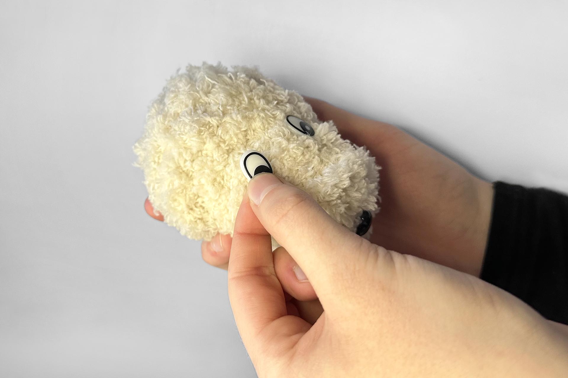 8. Rovnako tak pokračujeme v prípade očiek. Pridáme oči k hlave a zaistíme ich prilepením tavnou pištoľou.