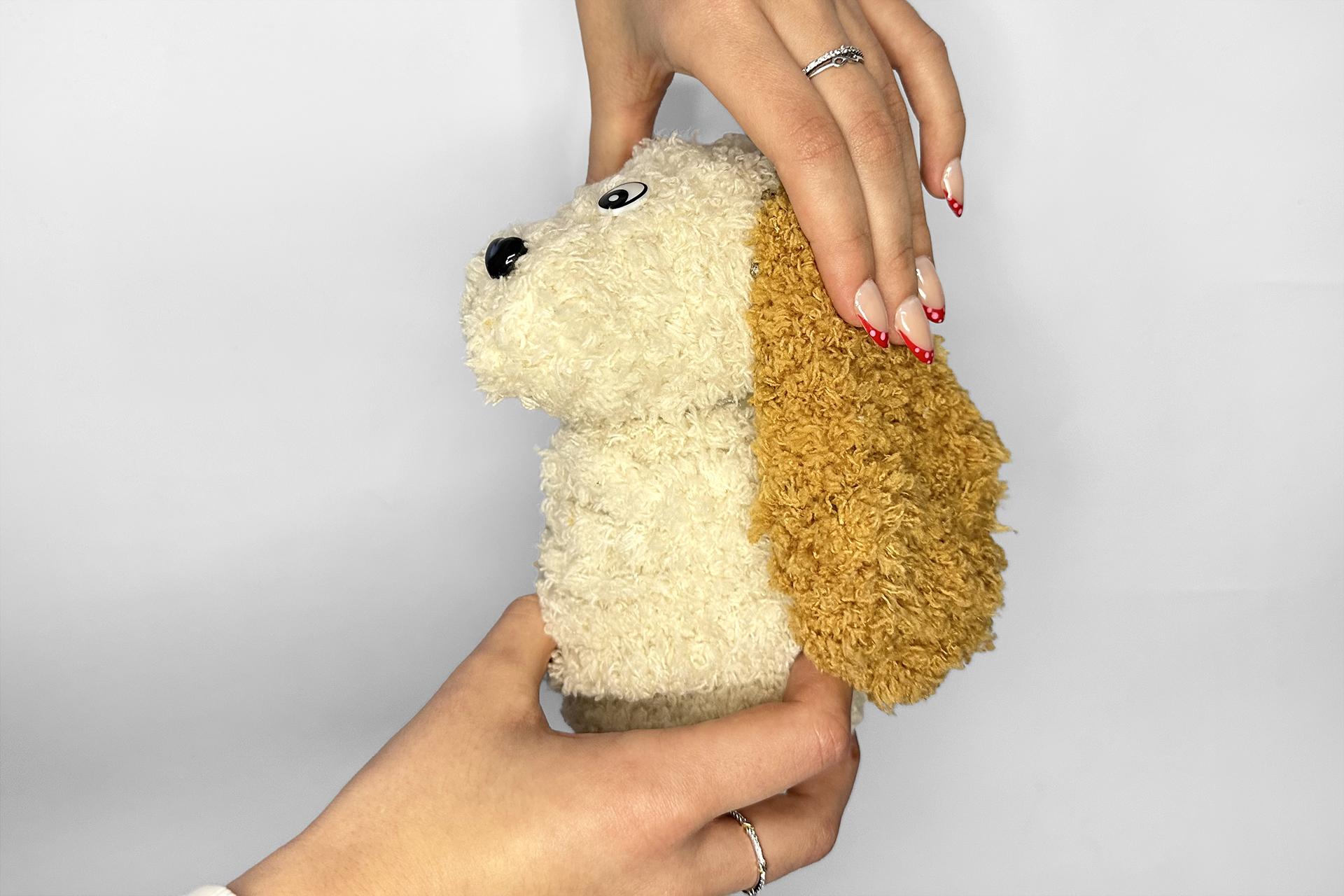 7. Na hlavu psíka ďalej použijeme malý ňufáčik v tvare srdiečka. Aby sme mali istotu, že sa ňufáčik neuvoľní, prilepíme ho tavnou pištoľou.